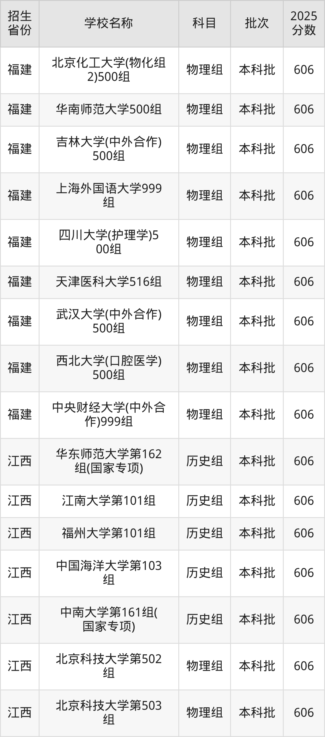 江西省历史组分数线是606分的211大学有:华东师范大学、江南大学、福州大学、中国海洋大学、中南大学。