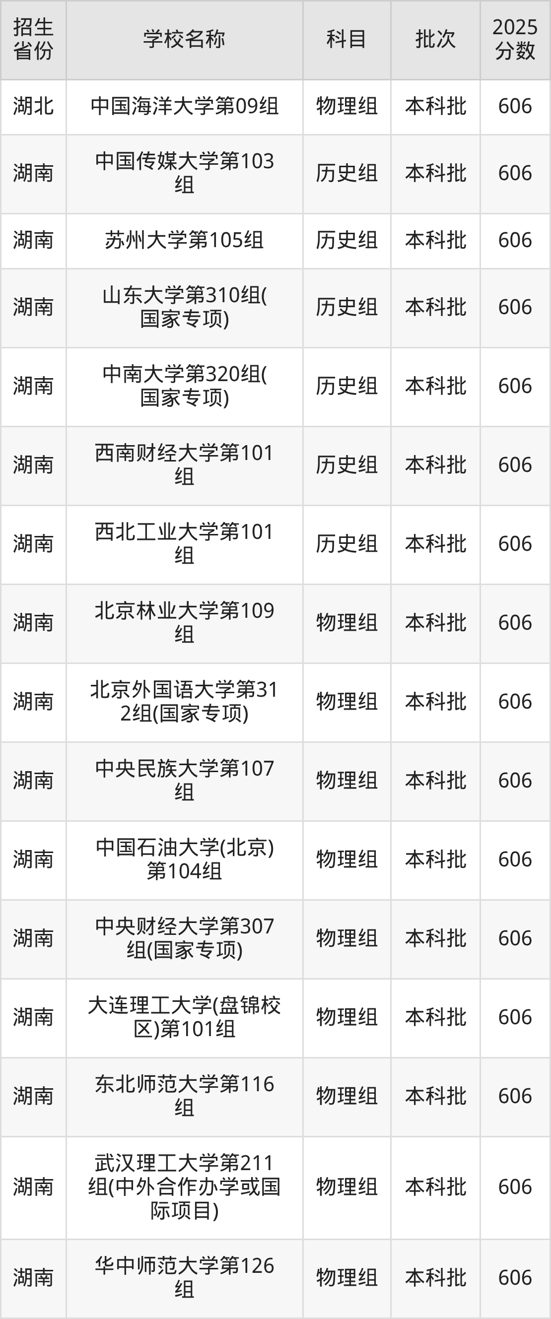 湖南省历史组分数线是606分的211大学有:中国传媒大学、苏州大学、山东大学、中南大学、西南财经大学、西北工业大学。