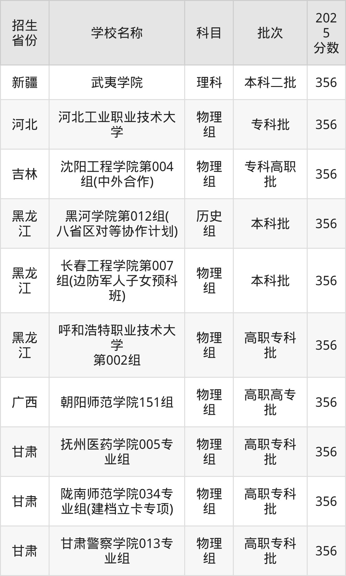 筛选全国各省2025年录取分数线为356分的二本公办大学如下: