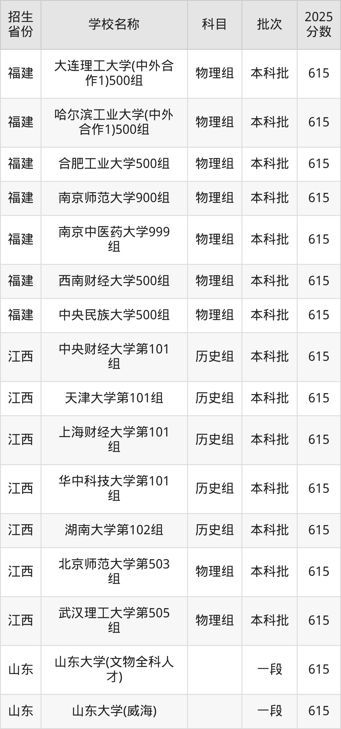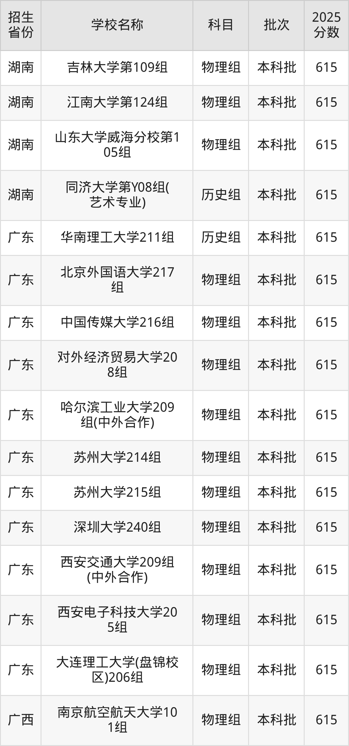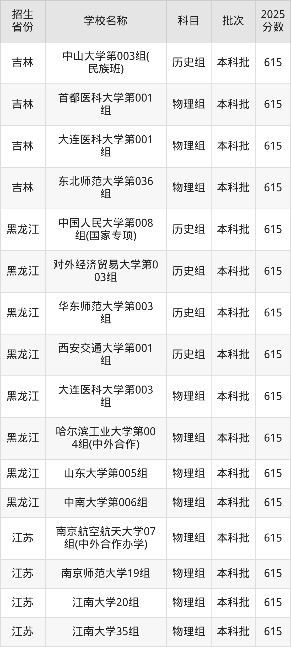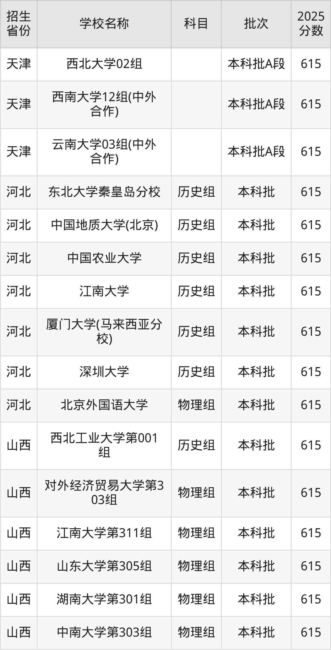 筛选全国各省2025年录取分数线为615分的重点大学如下: