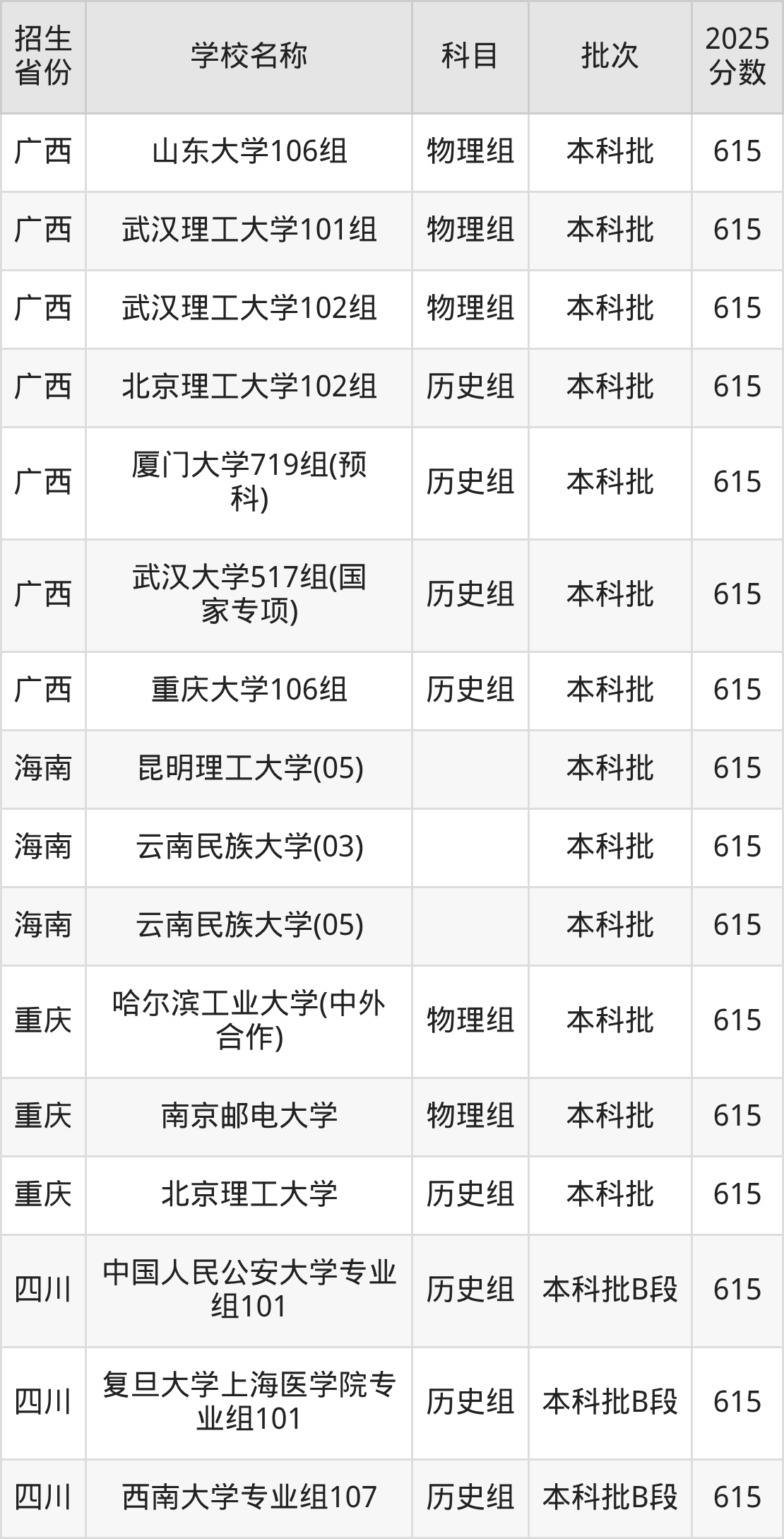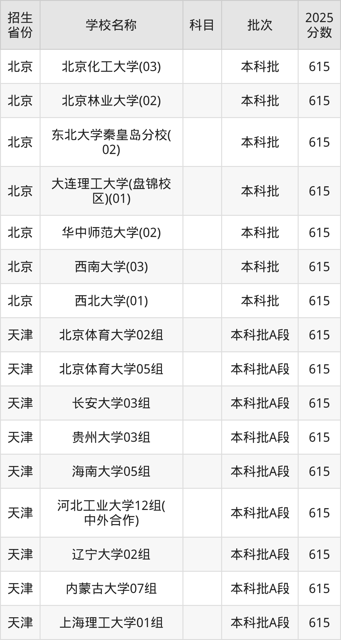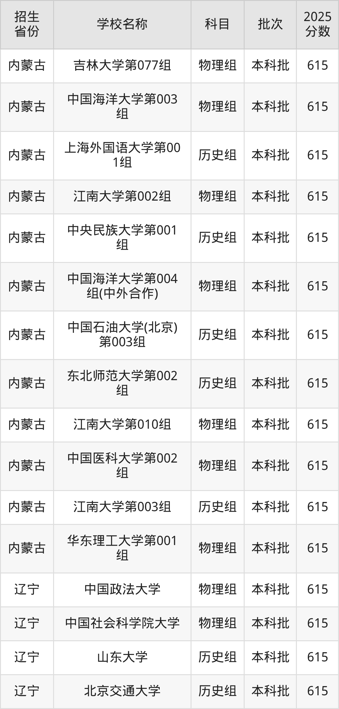 筛选全国各省2025年录取分数线为615分的重点大学如下:
