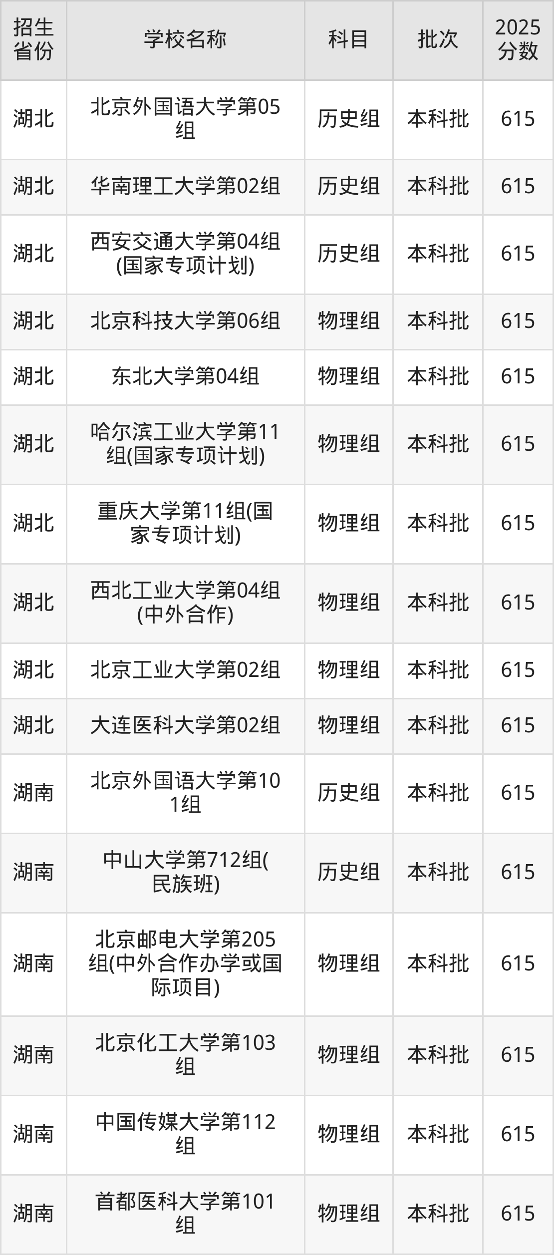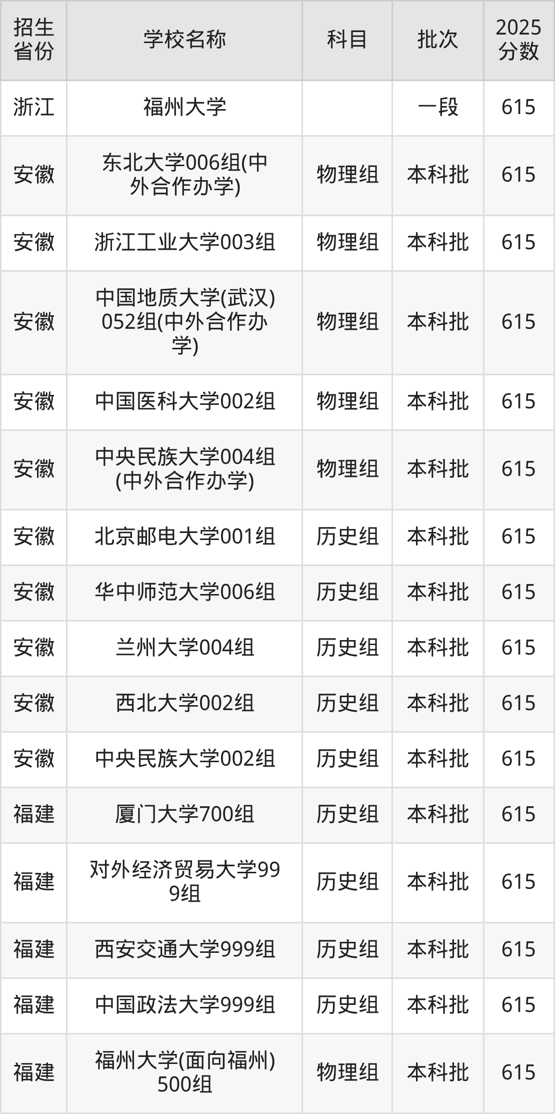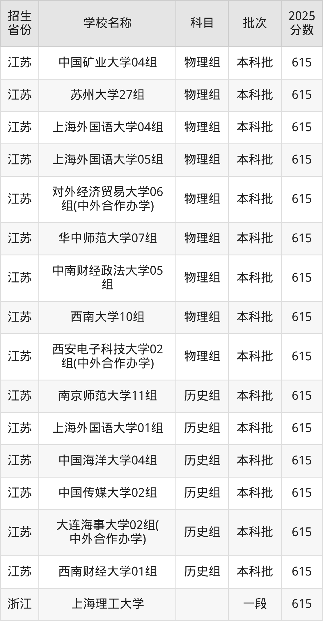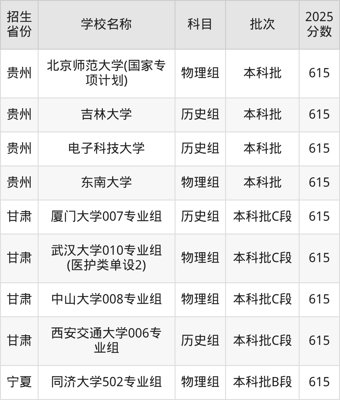 筛选全国各省2025年录取分数线为615分的重点大学如下: