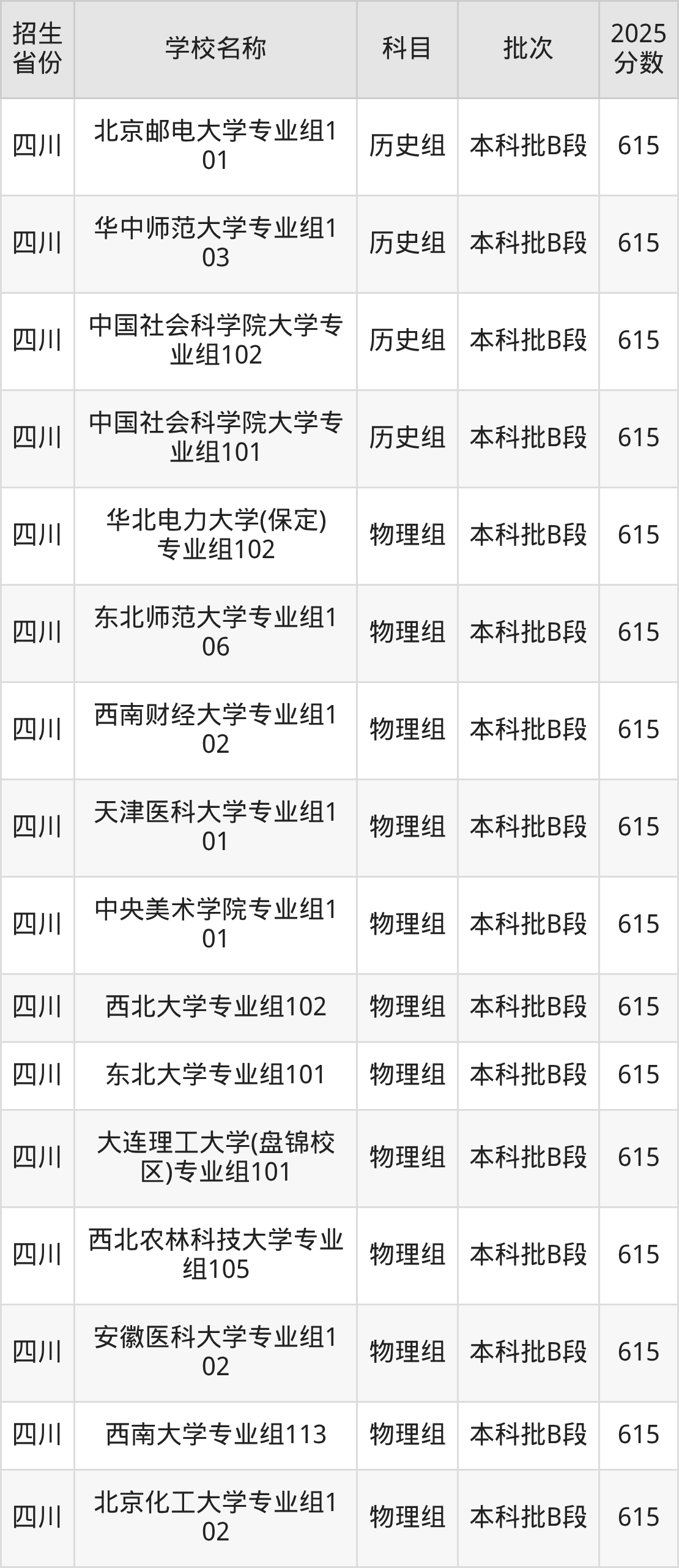 四川省历史组分数线是615分的重点大学有:中国人民公安大学、复旦大学上海医学院、西南大学、北京邮电大学、华中师范大学、中国社会科学院大学。