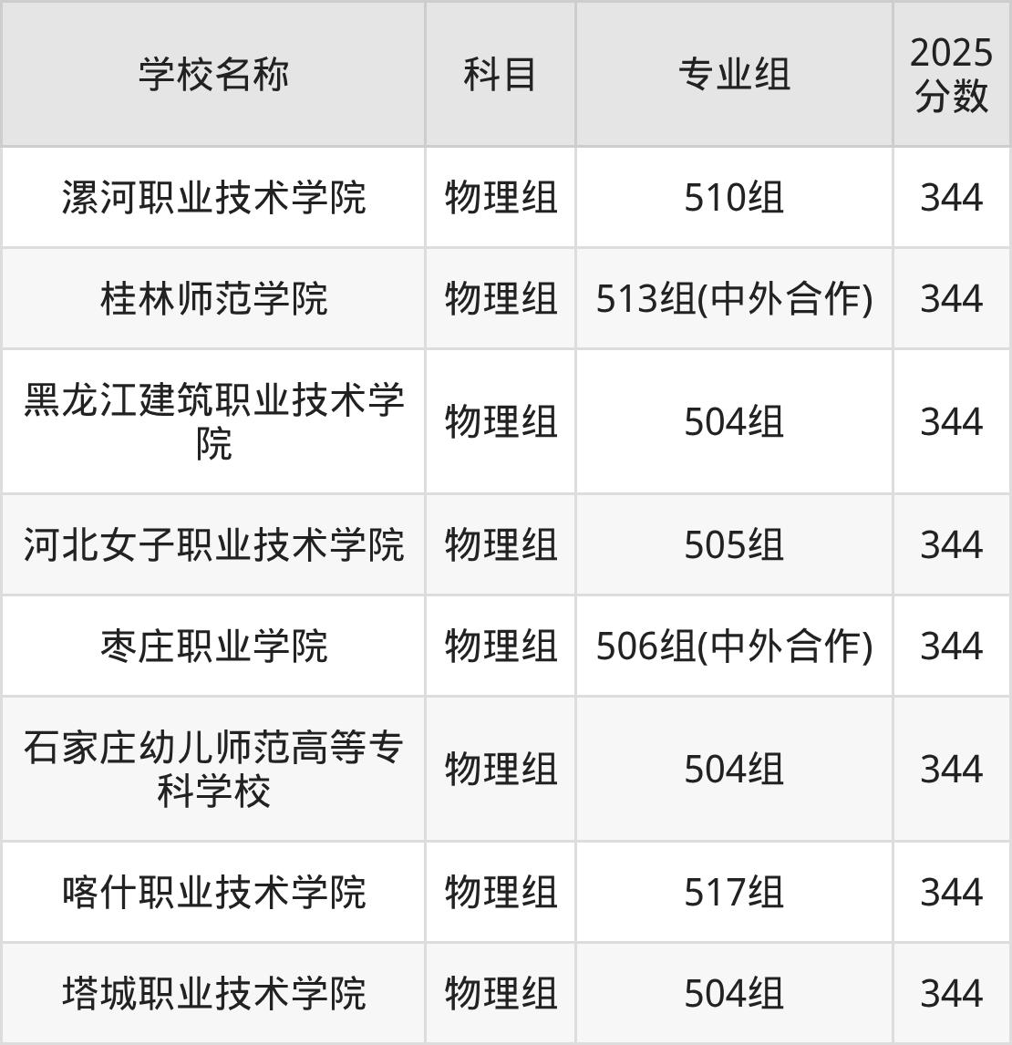 广东高考录取分数线在344分左右的公办院校专业组一共有8个,其中物理组有:漯河职业技术学院(344分)、桂林师范学院(344分)、黑龙江建筑职业技术学院(344分)。