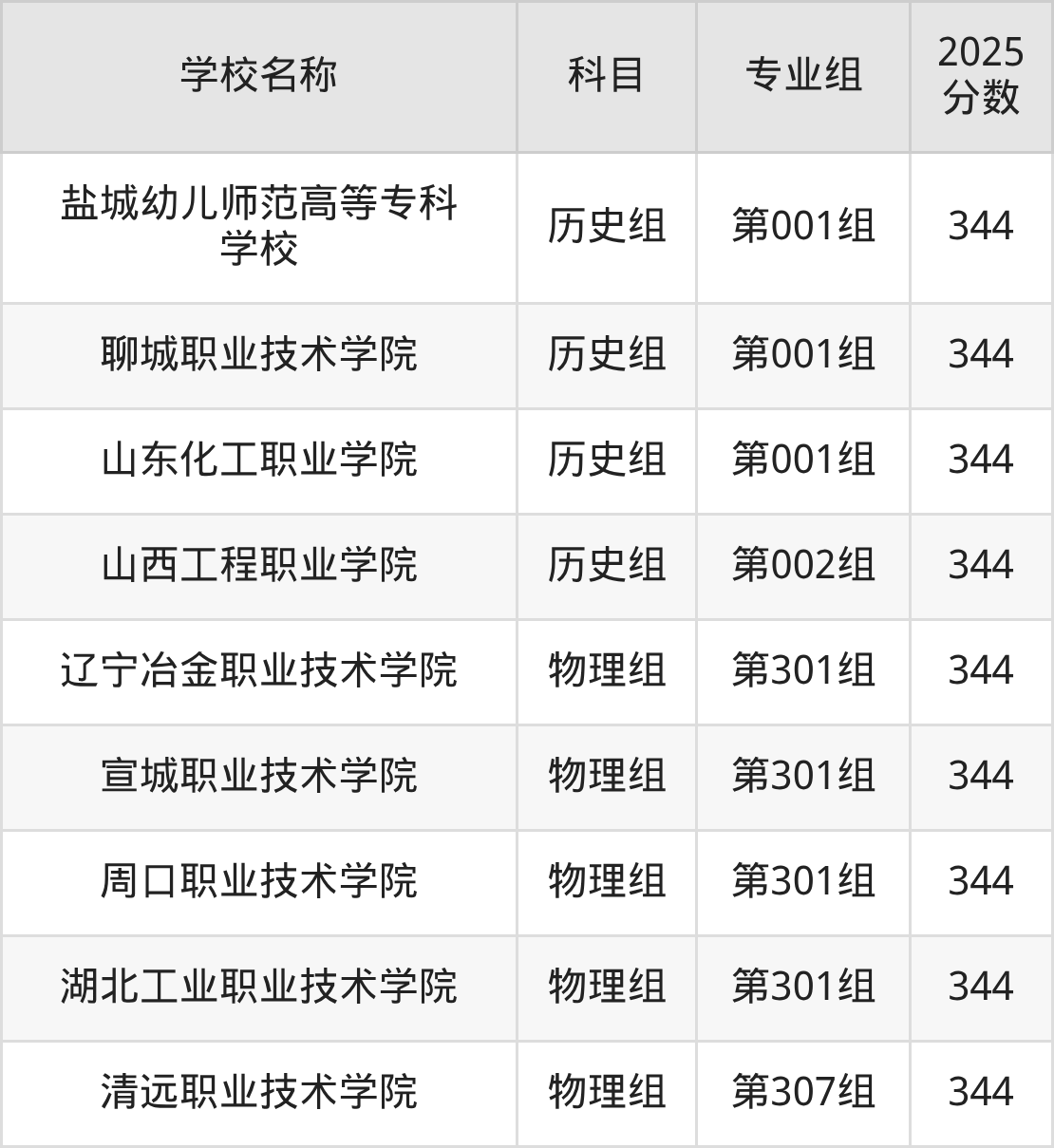 山西高考录取分数线在344分左右的公办院校专业组一共有9个,其中历史组有:盐城幼儿师范高等专科学校(344分)、聊城职业技术学院(344分)、山东化工职业学院(344分),物理组有:辽宁冶金职业技术学院(344分)、宣城职业技术学院(344分)、周口职业技术学院(344分)。