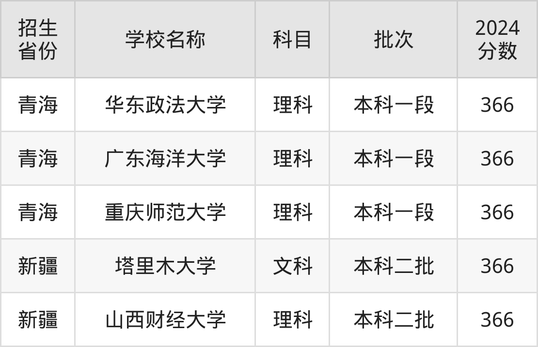 366分可以上的大学有华东政法大学、广东海洋大学、重庆师范大学、塔里木大学等一本大学。本文整理了青海、新疆等全国366分左右的一本大学名单,请2025年高考生参考。