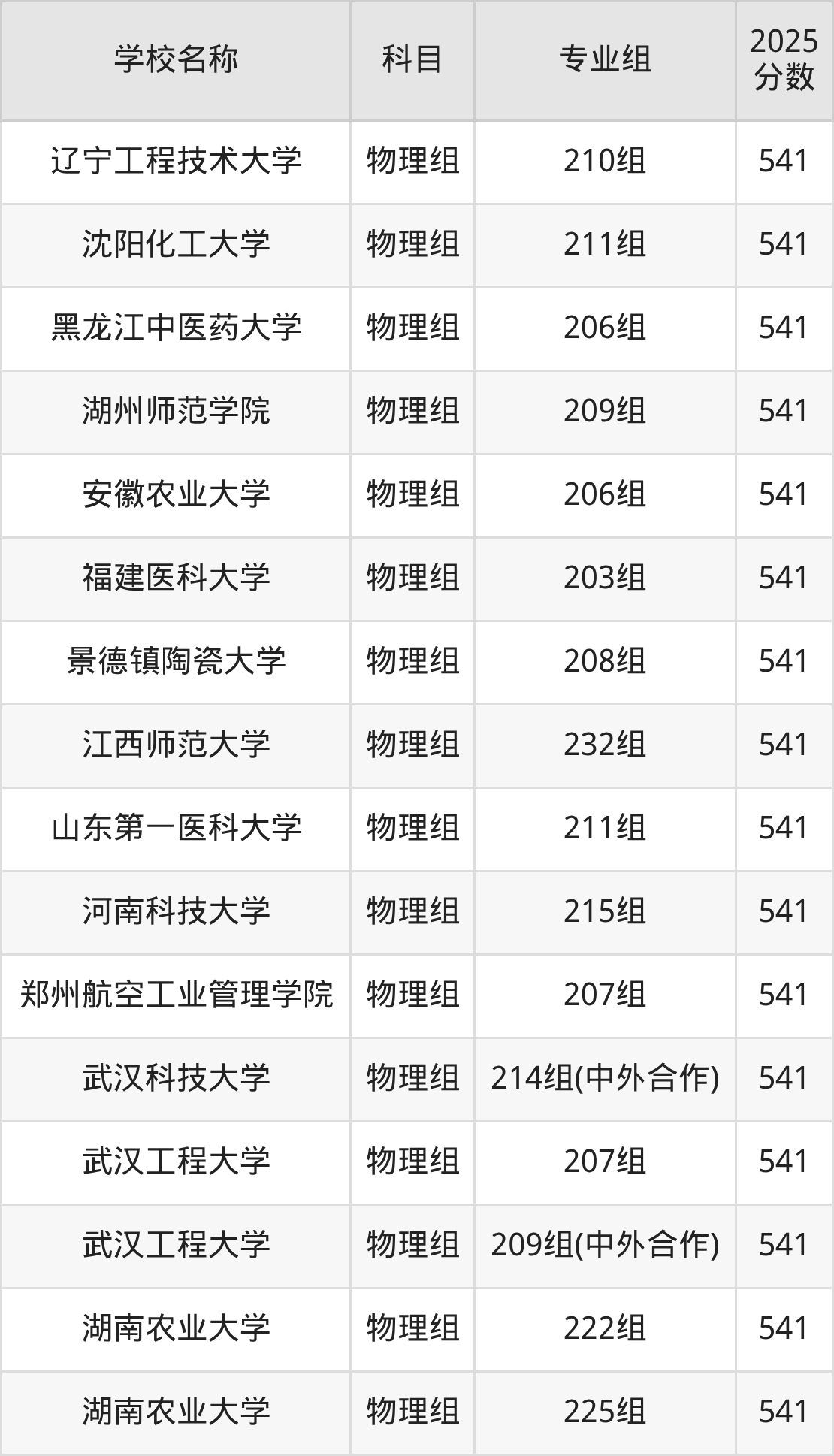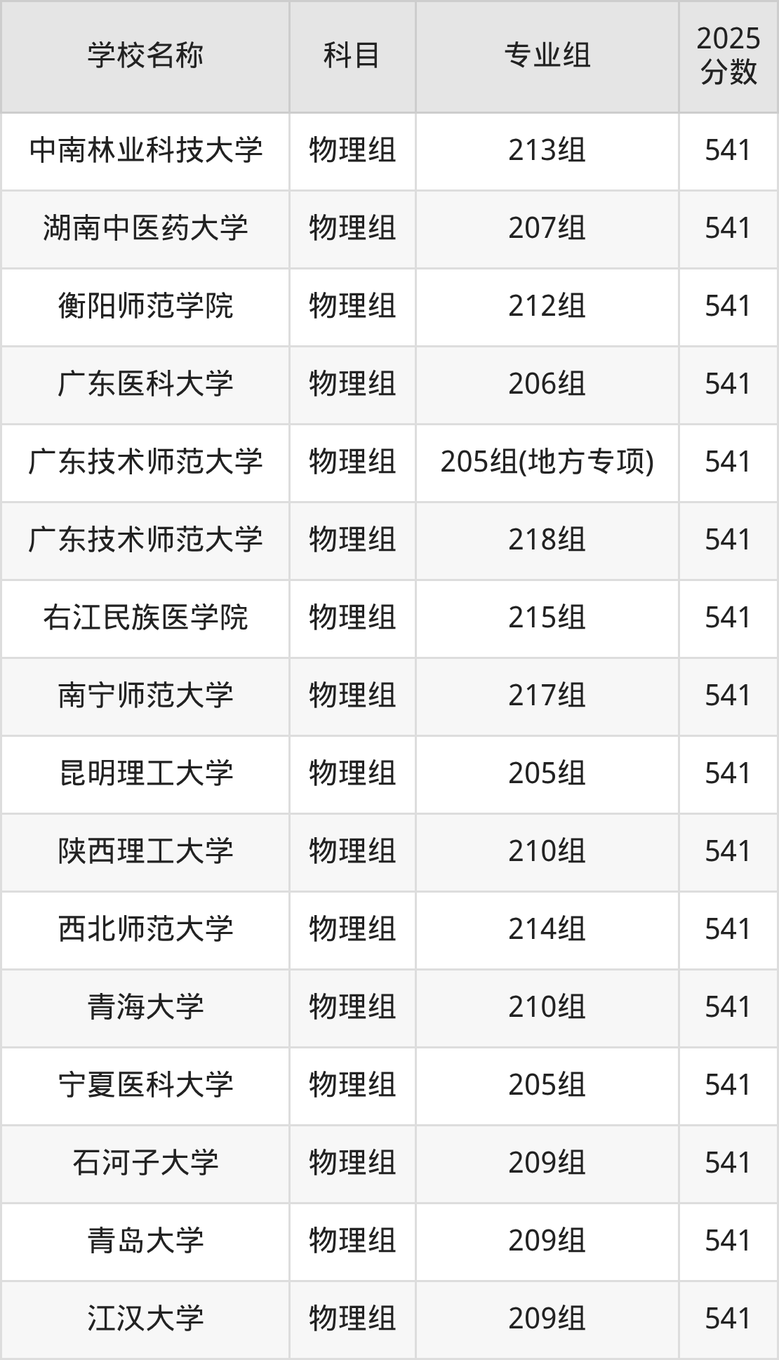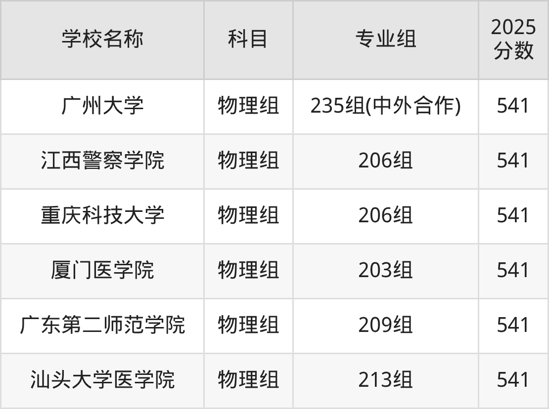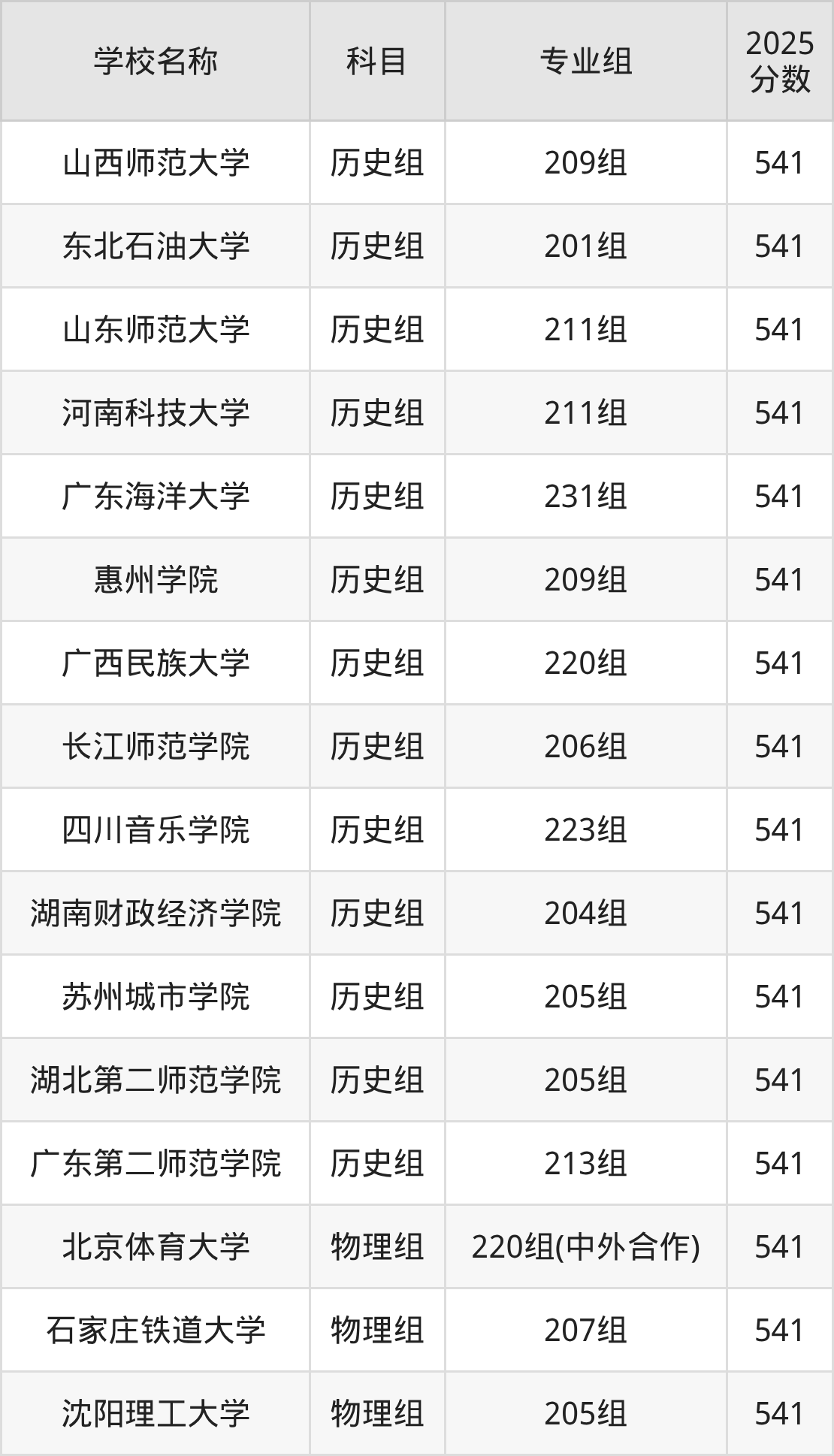 广东高考录取分数线在541分左右的公办院校专业组一共有54个,其中历史组有:山西师范大学(541分)、东北石油大学(541分)、山东师范大学(541分),物理组有:北京体育大学(541分)、石家庄铁道大学(541分)、沈阳理工大学(541分)。