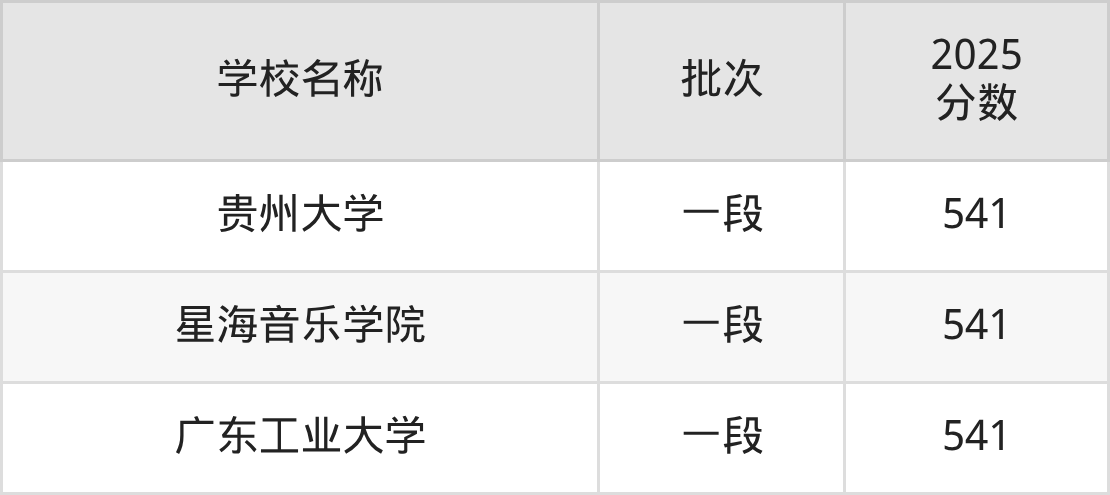 山东高考录取分数线在541分左右的公办大学一共有3所。分别是贵州大学(541分)、星海音乐学院(541分)、广东工业大学(541分)