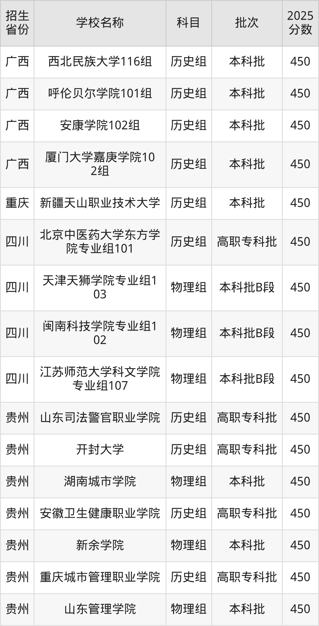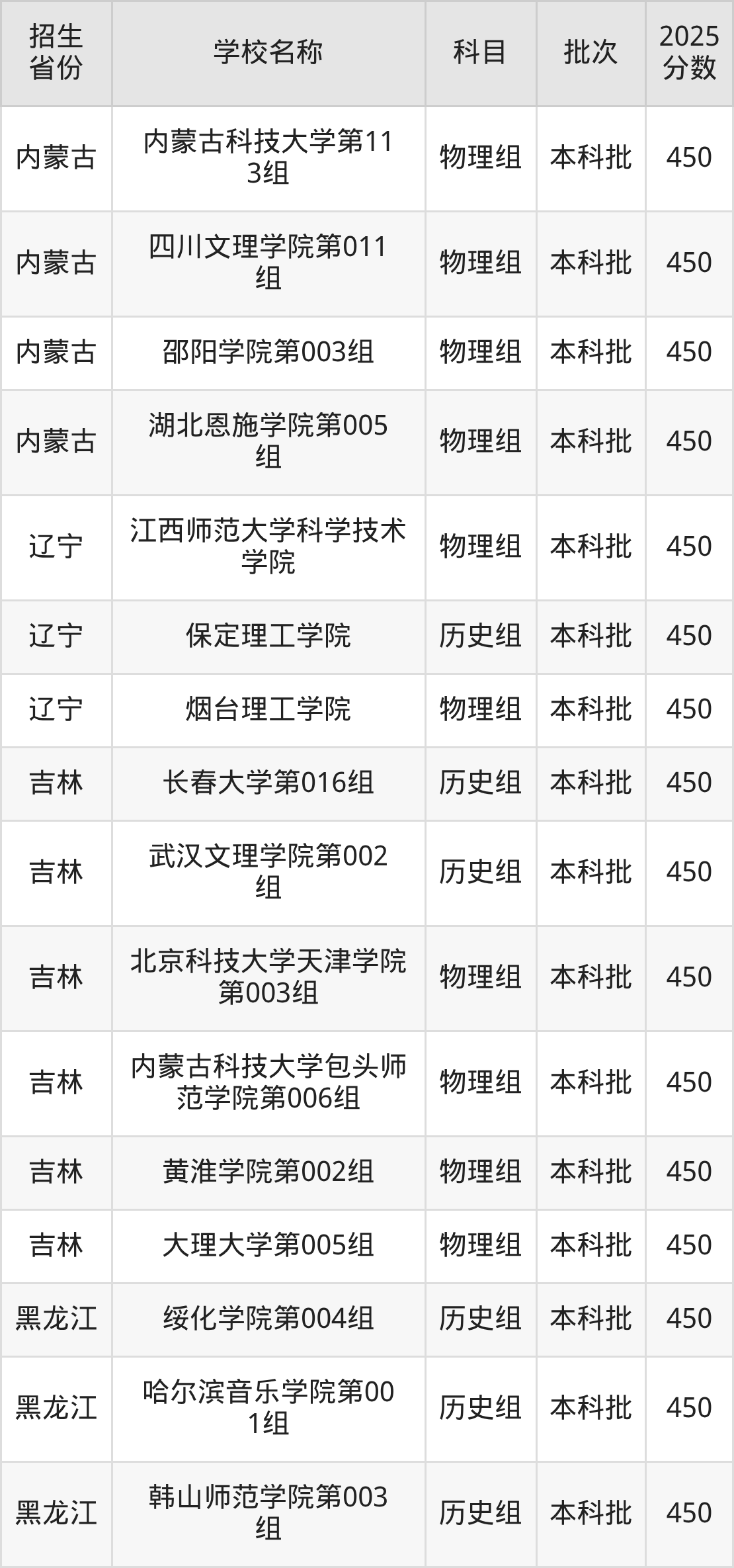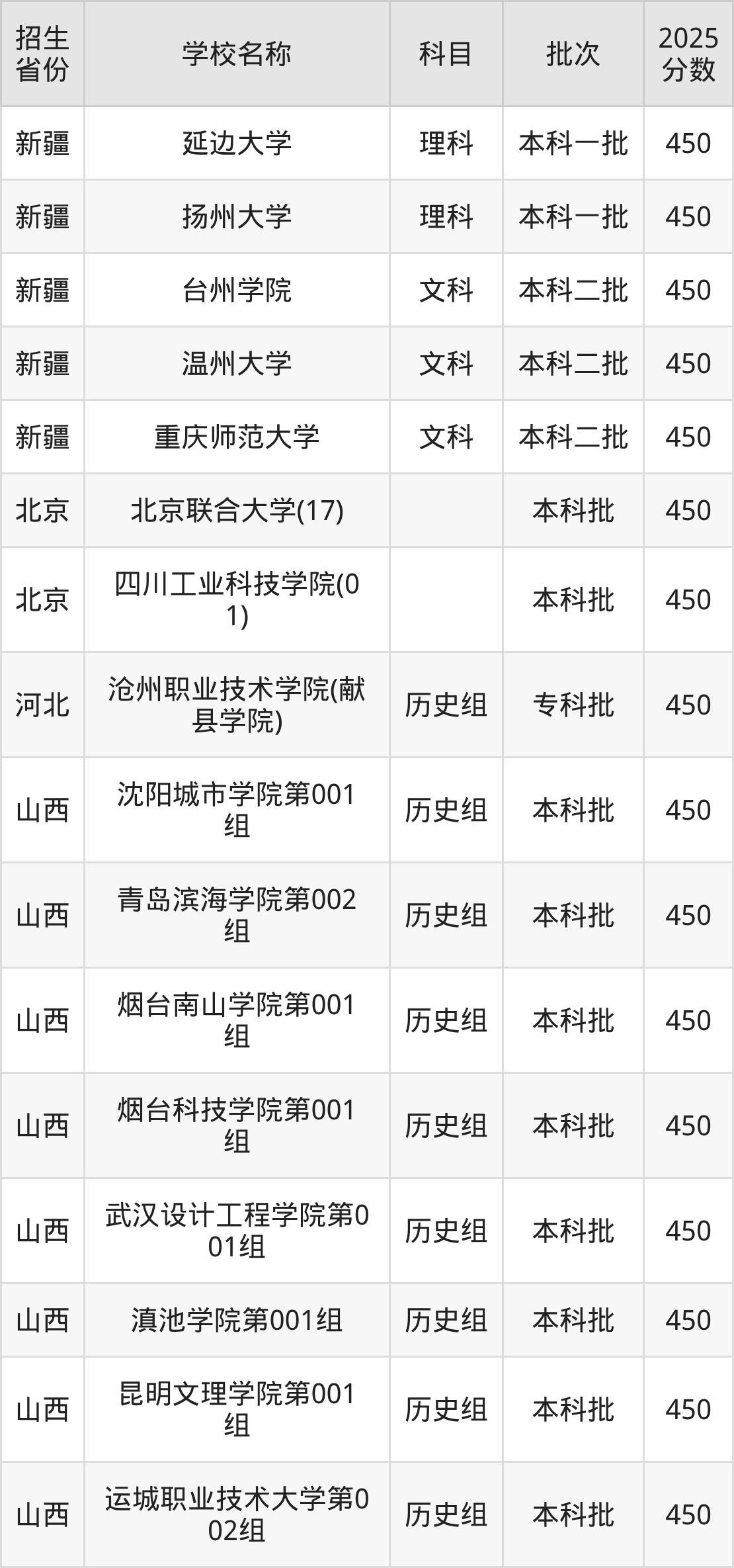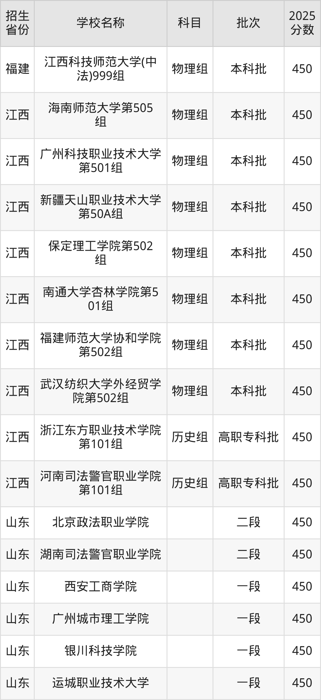 筛选全国各省2025年录取分数线为450分的文科大学如下: