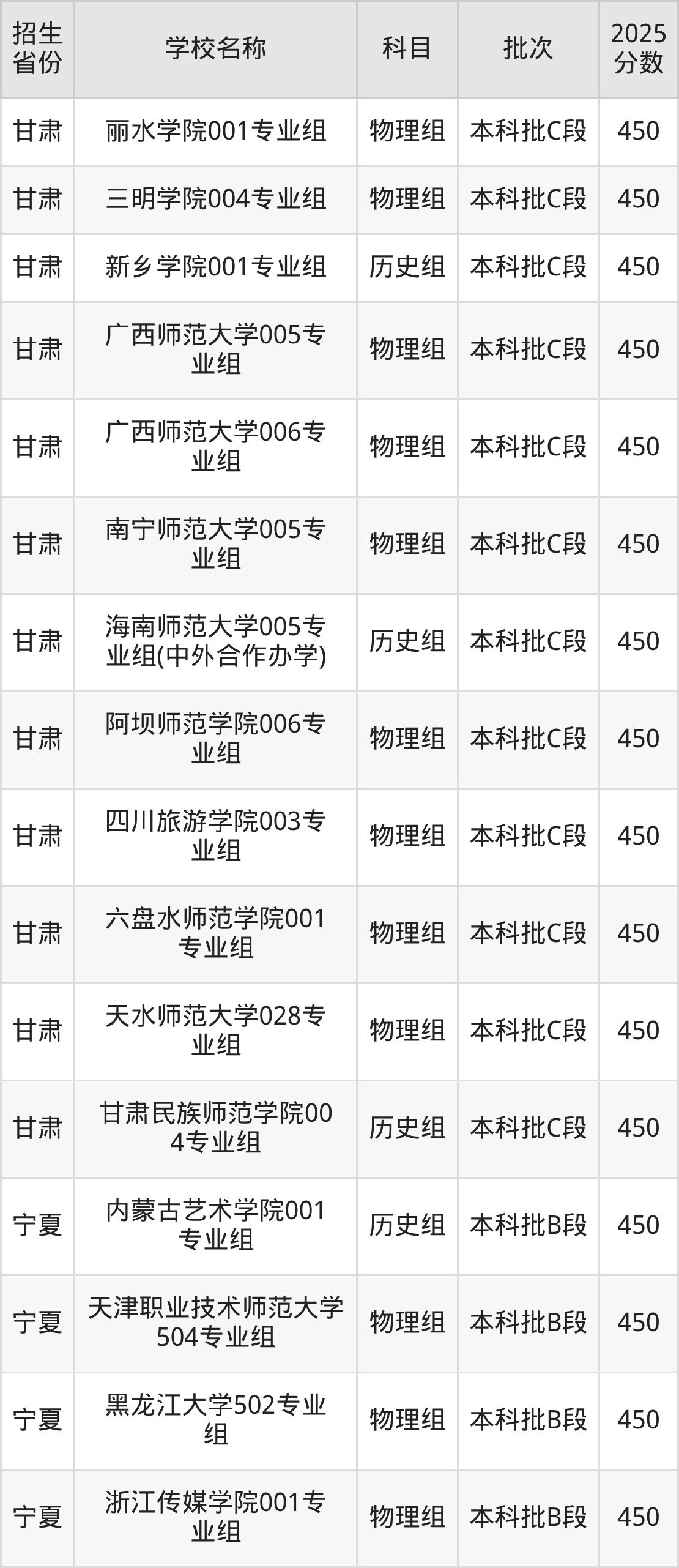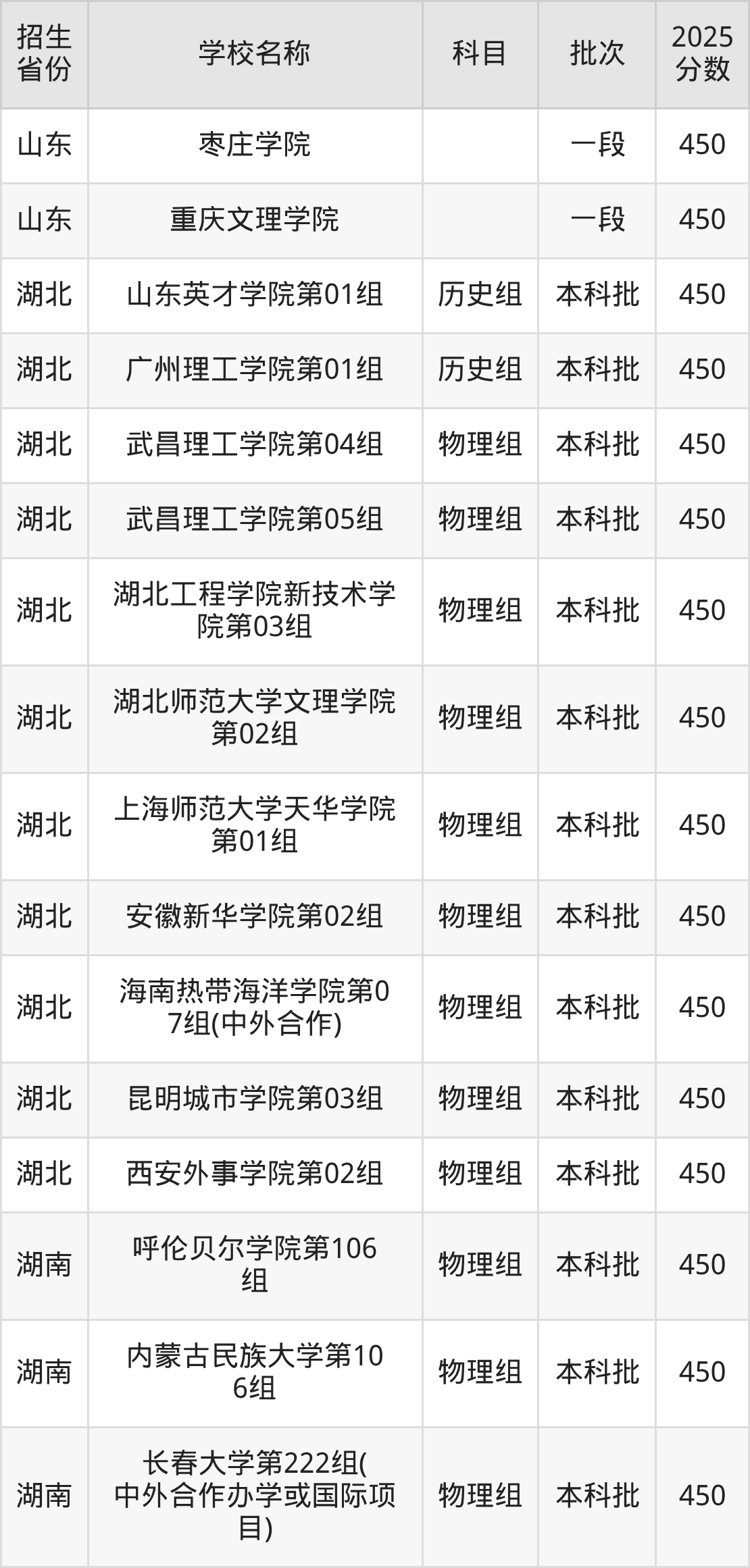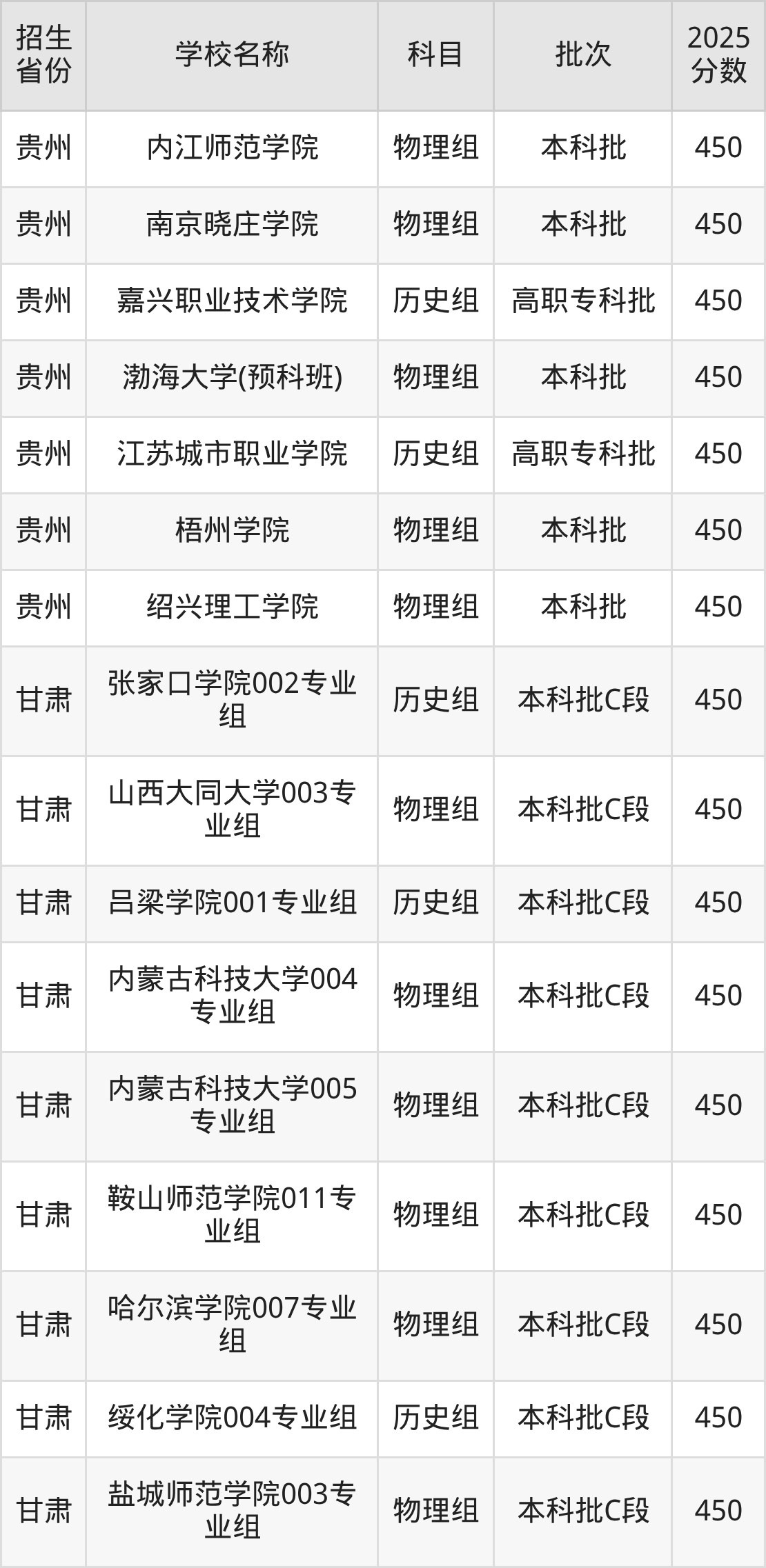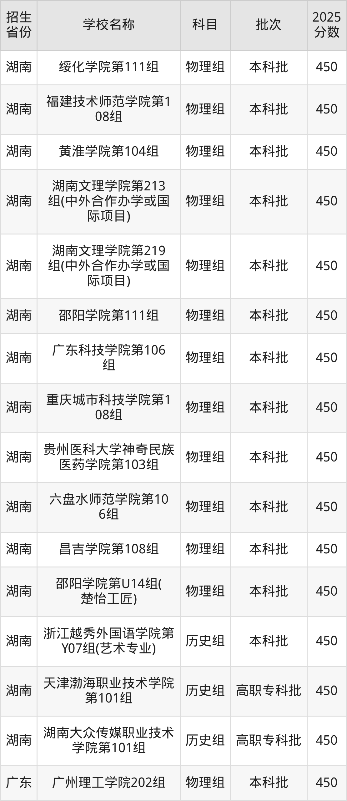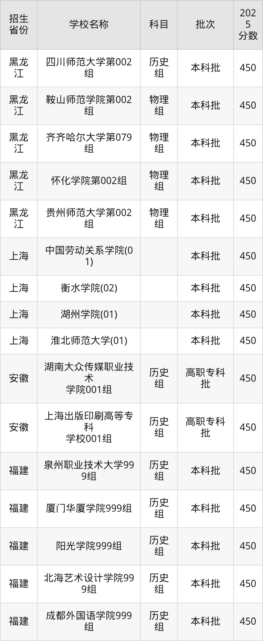 筛选全国各省2025年录取分数线为450分的文科大学如下:
