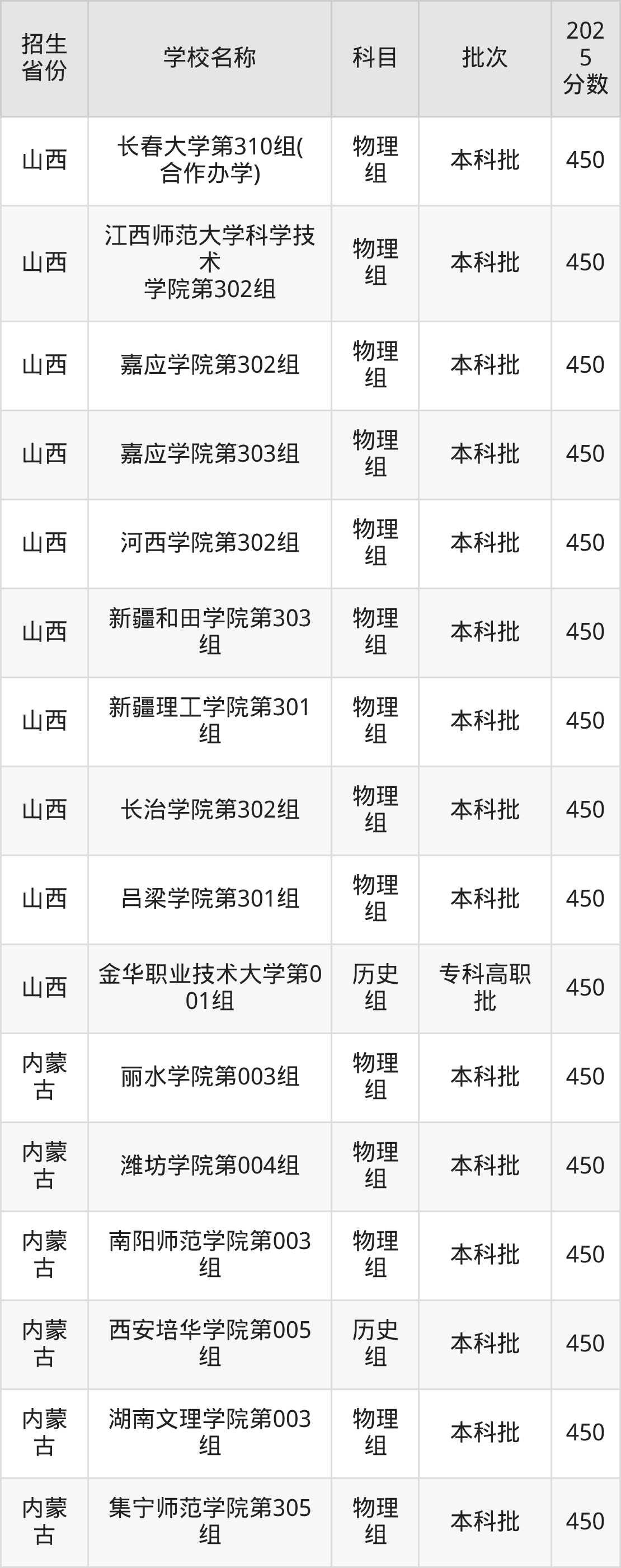 山西省物理组分数线是450分的文科大学有:长春大学、江西师范大学科学技术学院、嘉应学院、河西学院、新疆和田学院、新疆理工学院、长治学院、吕梁学院。