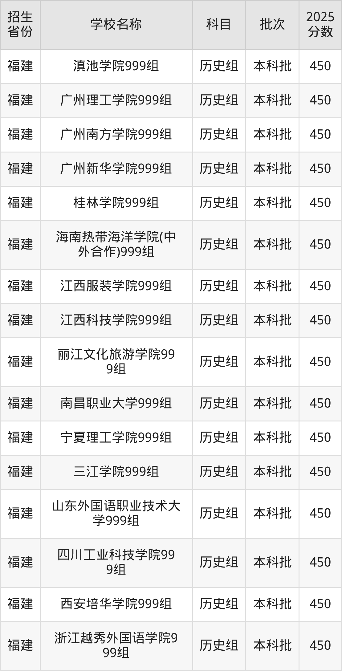 福建省历史组分数线是450分的文科大学有:泉州职业技术大学、厦门华厦学院、阳光学院、北海艺术设计学院、成都外国语学院、滇池学院、广州理工学院、广州南方学院、广州新华学院、桂林学院。