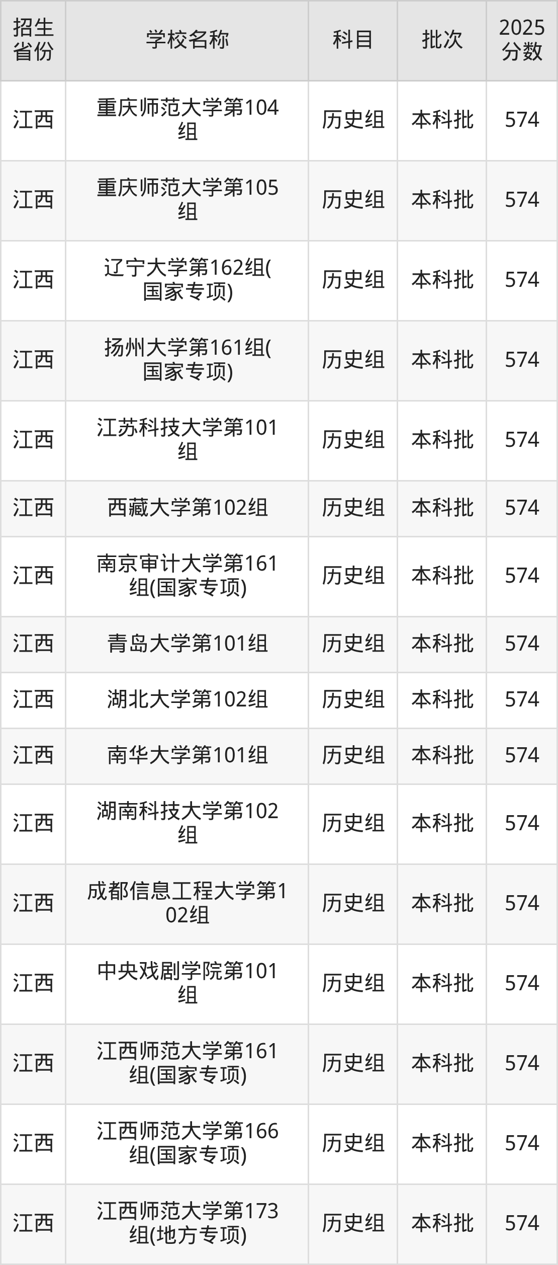 江西省历史组分数线是574分的一本大学有:上海体育大学、浙江师范大学、重庆师范大学、辽宁大学、扬州大学、江苏科技大学、西藏大学、南京审计大学、青岛大学、湖北大学。