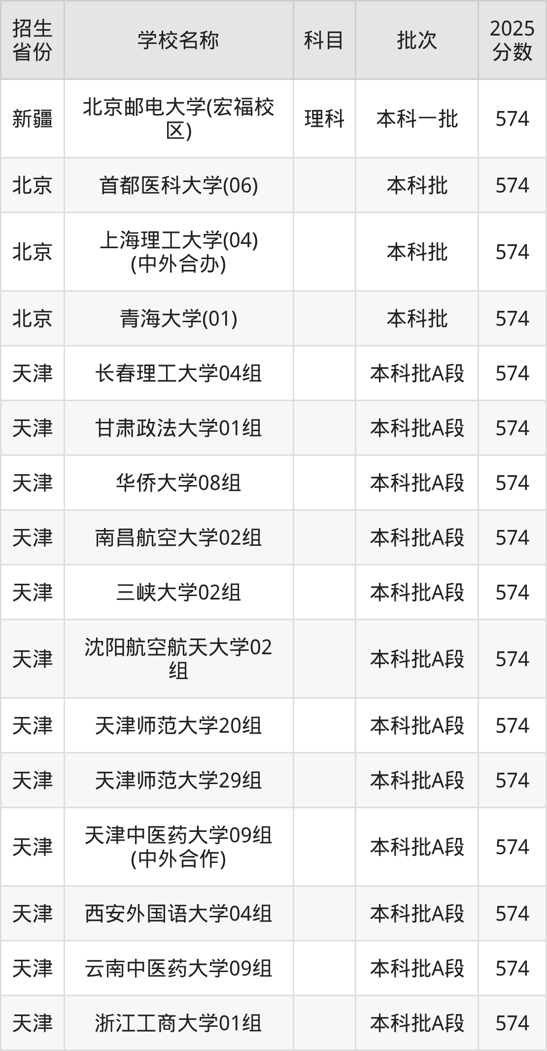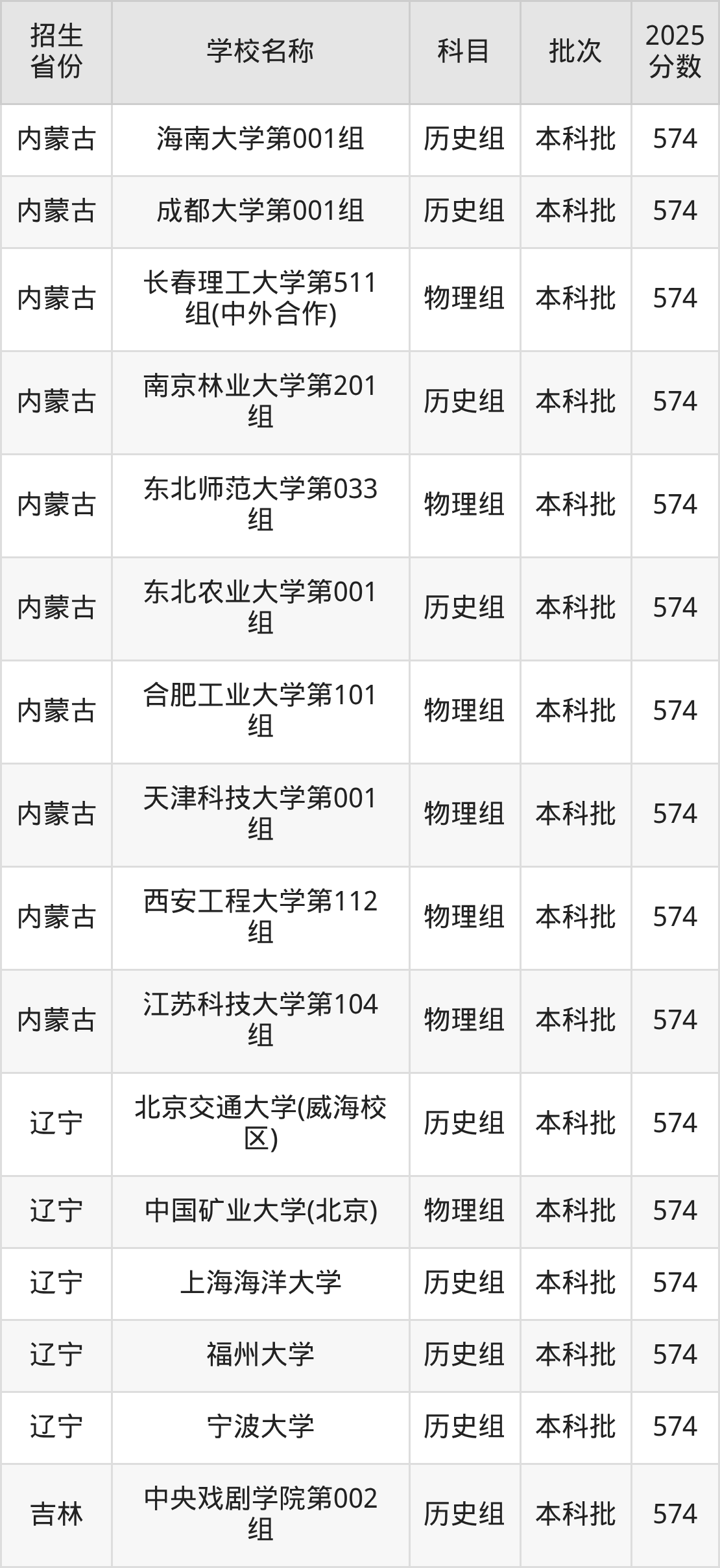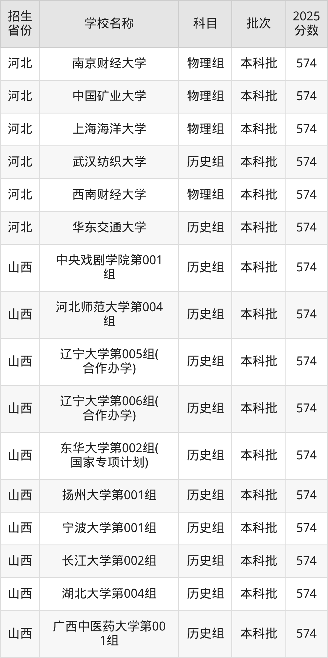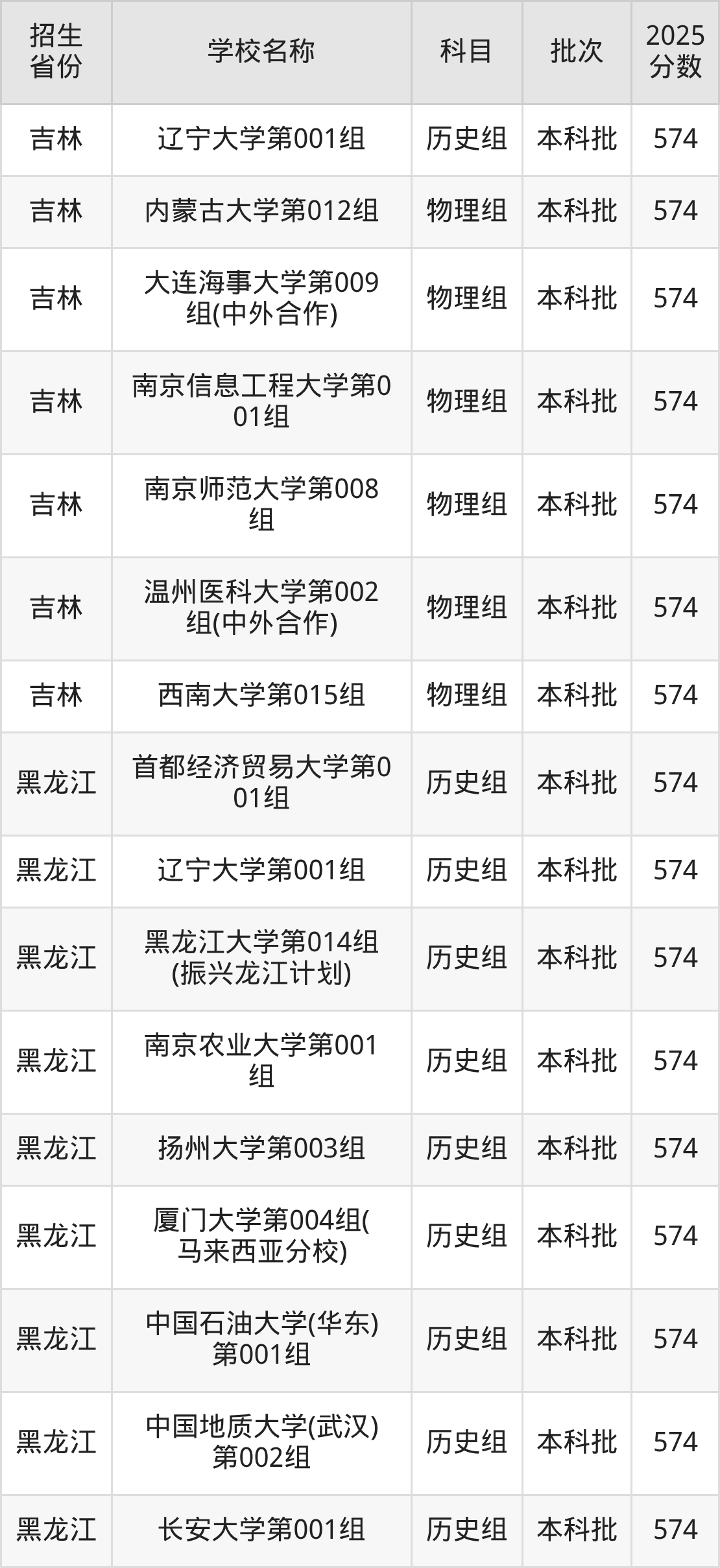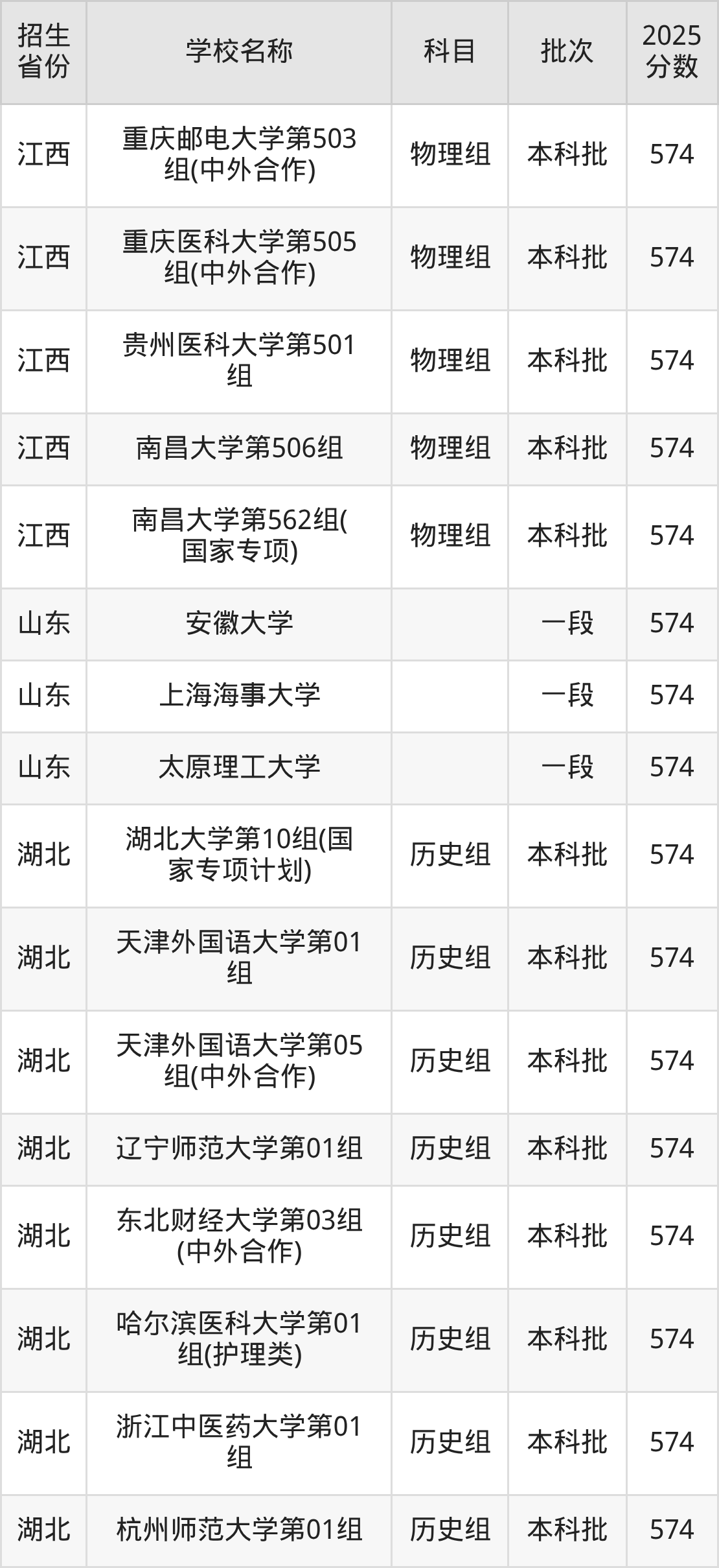 筛选全国各省2025年录取分数线为574分的一本大学如下: