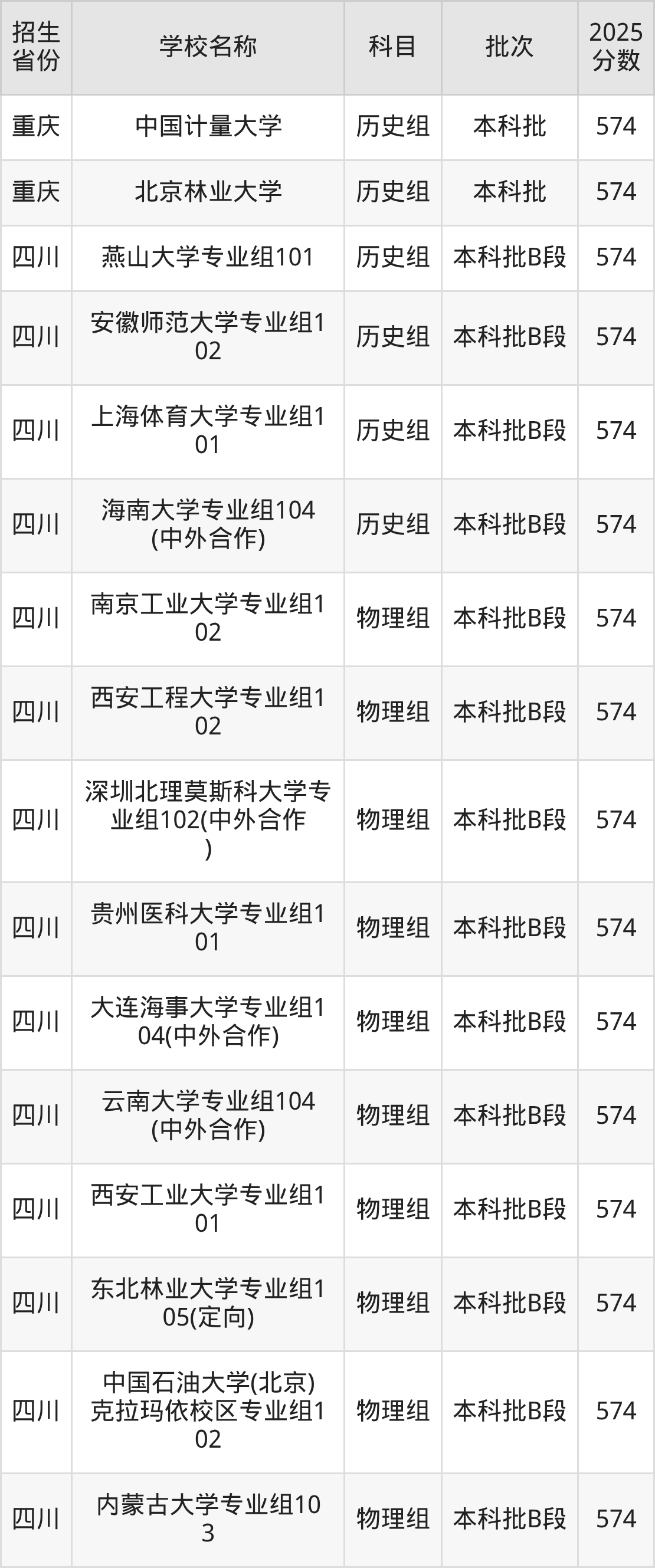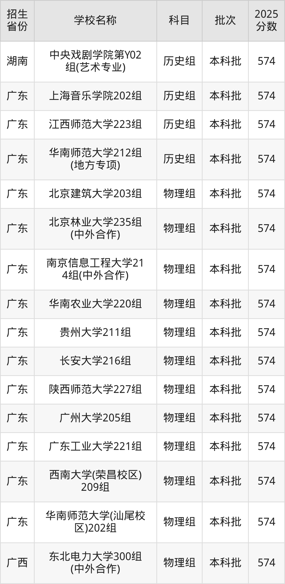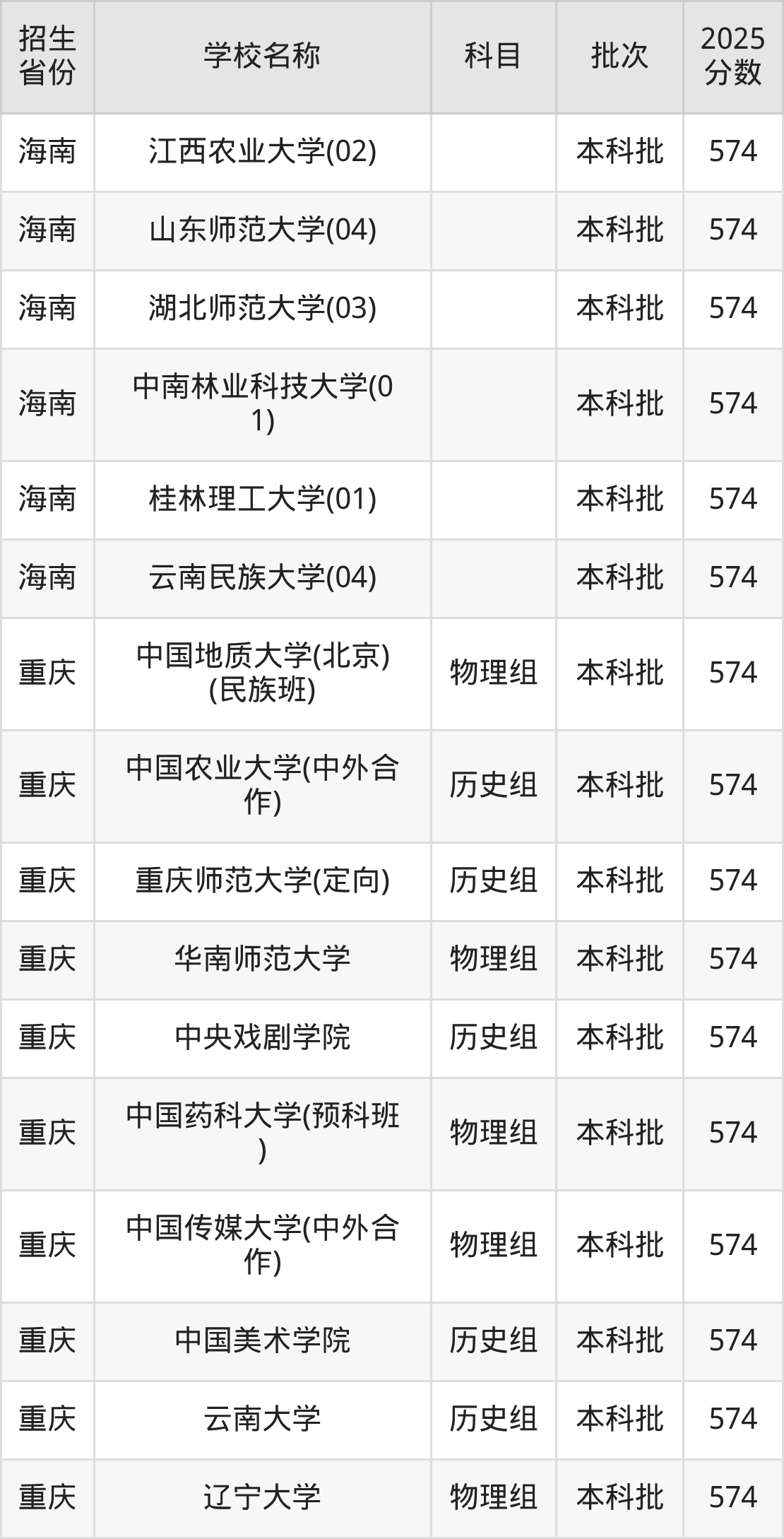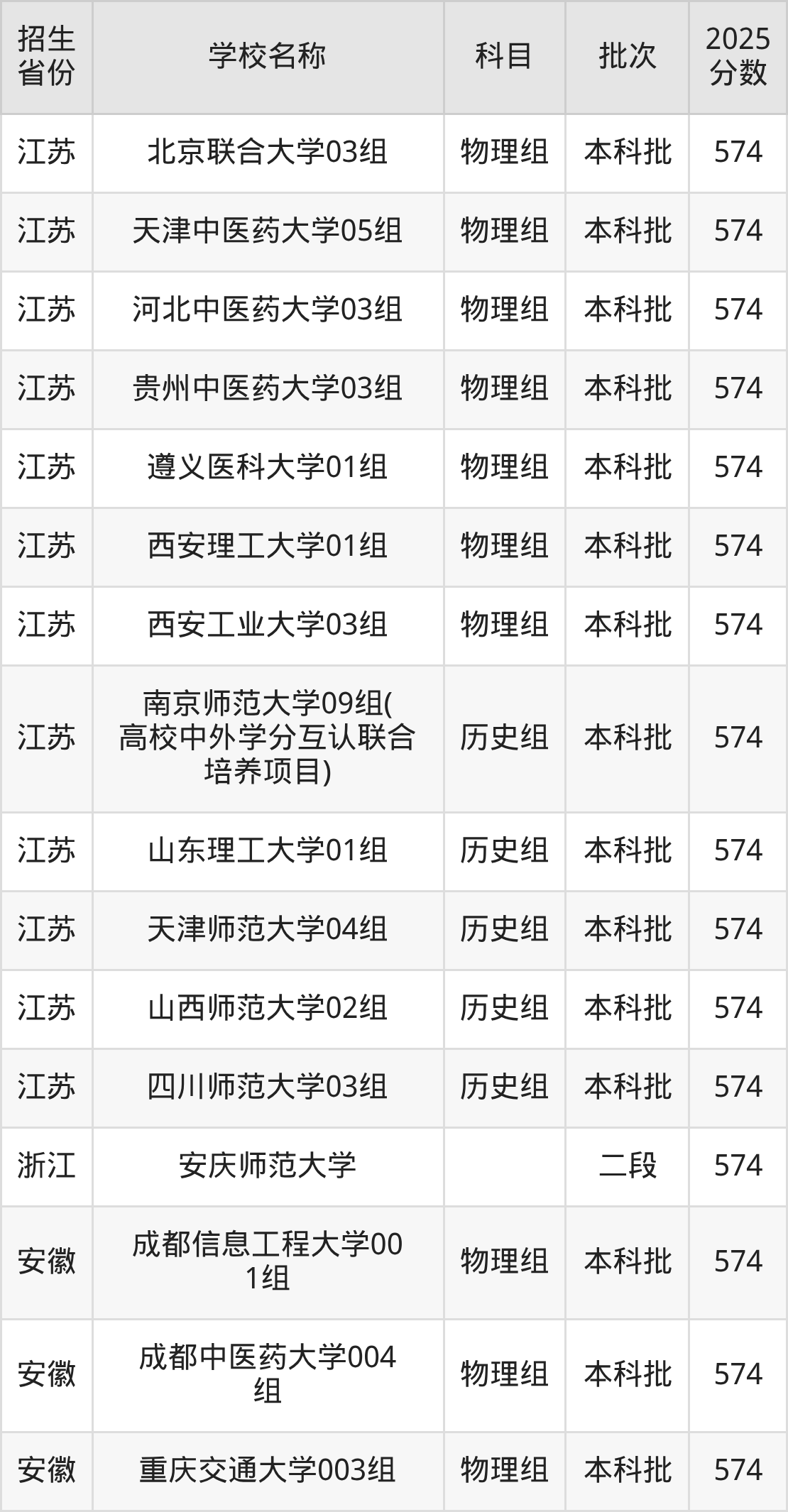 筛选全国各省2025年录取分数线为574分的一本大学如下: