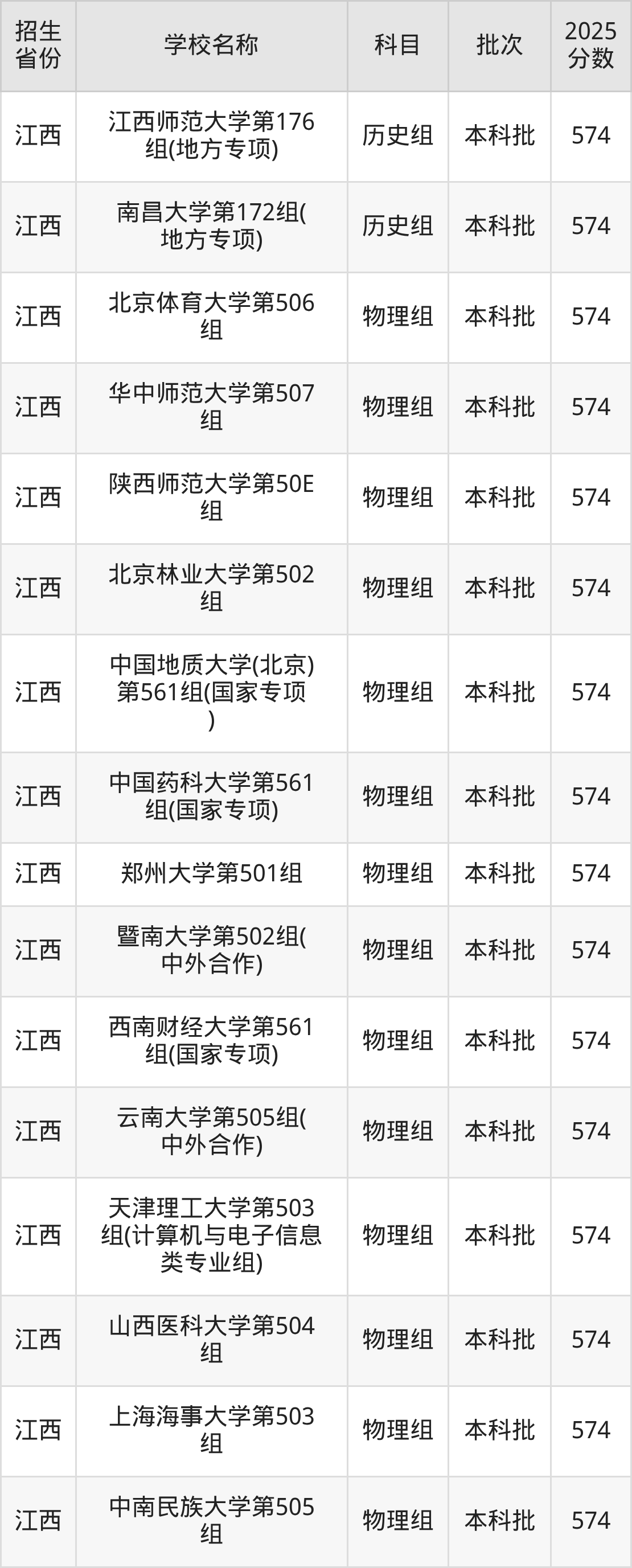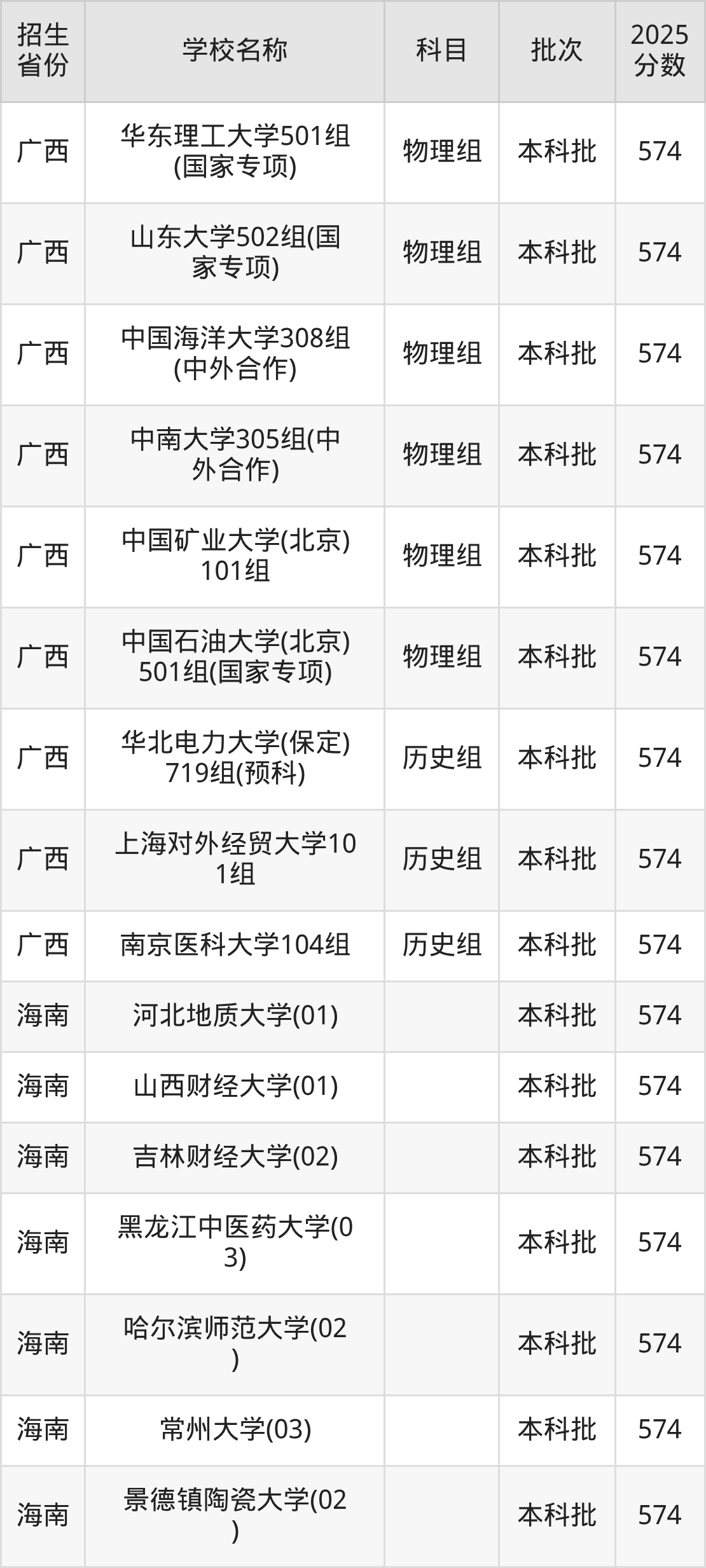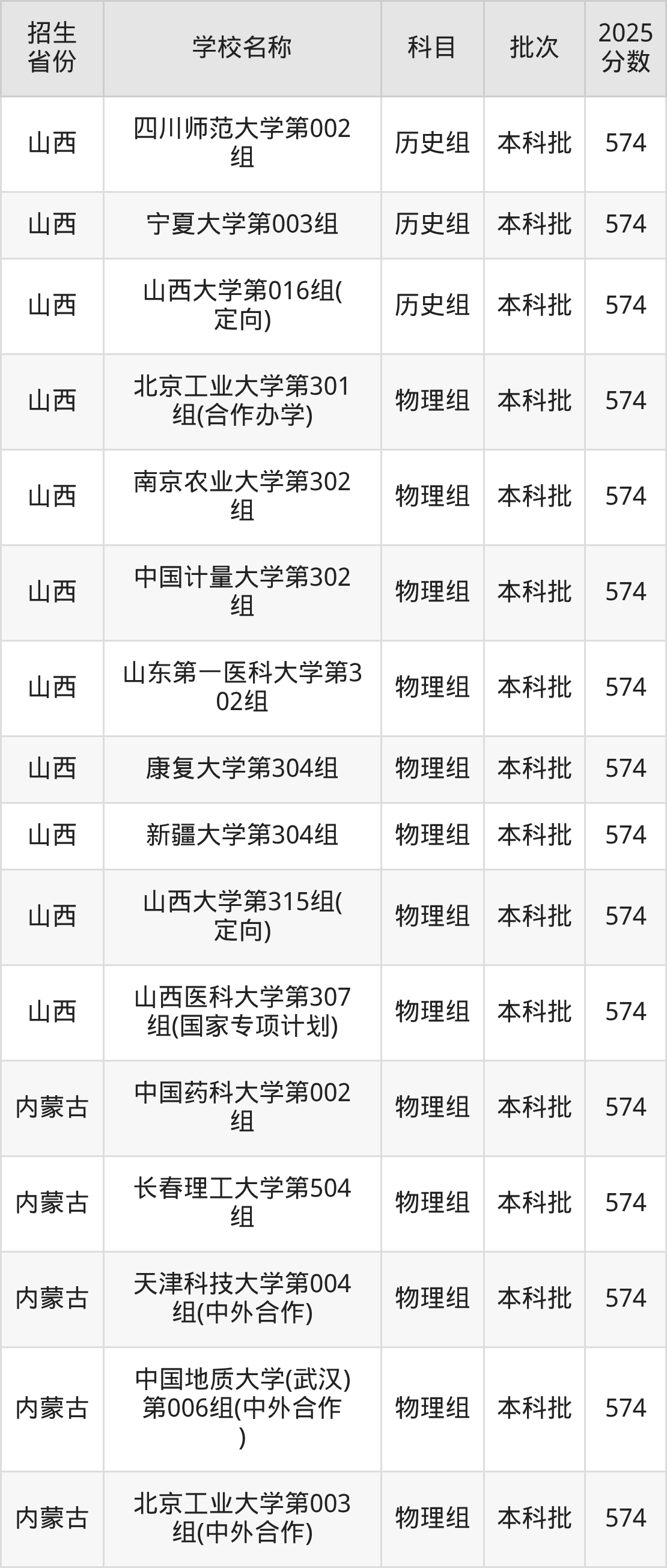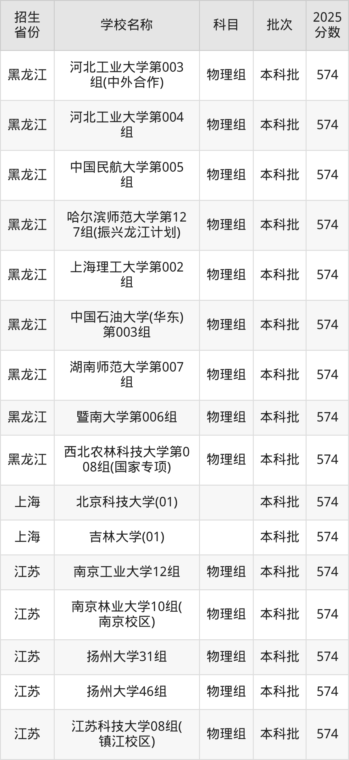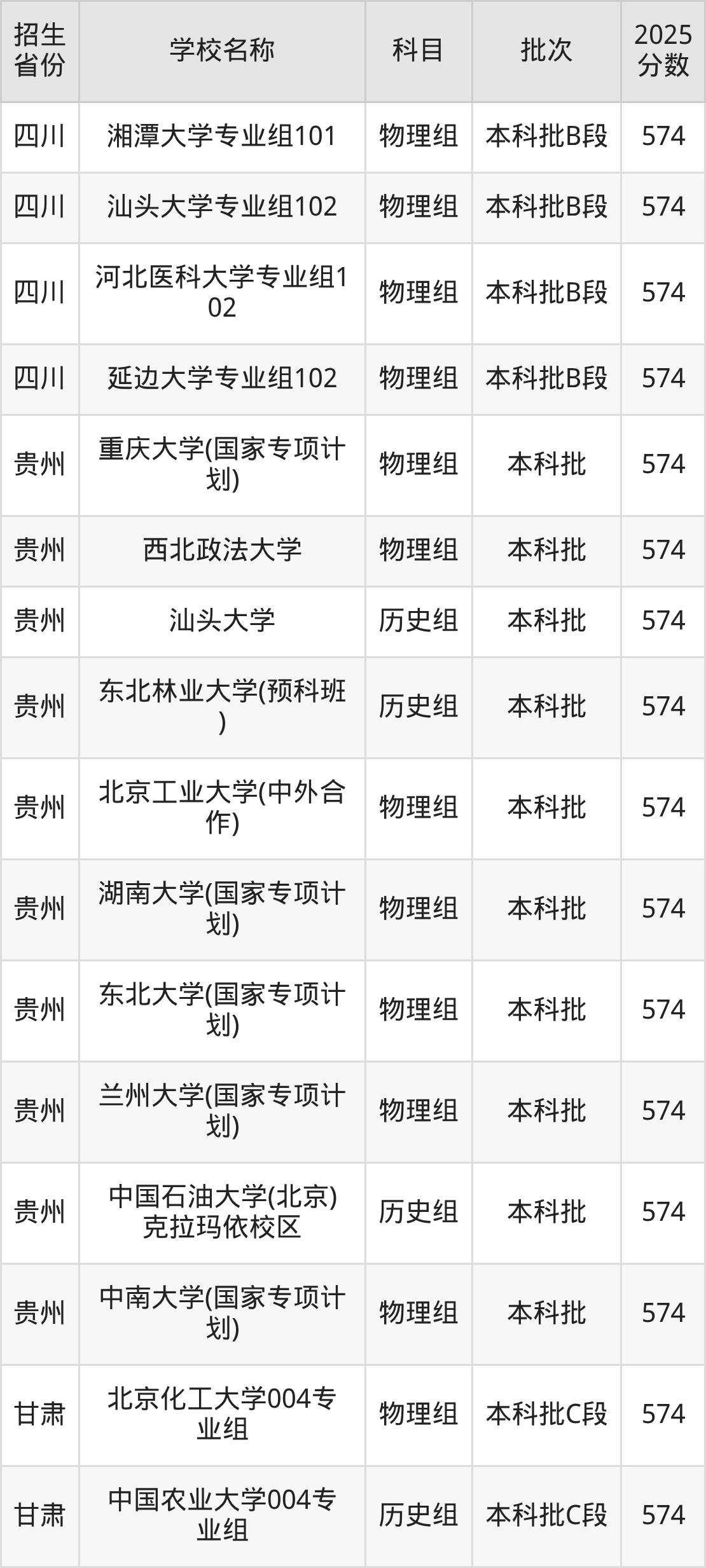 筛选全国各省2025年录取分数线为574分的一本大学如下: