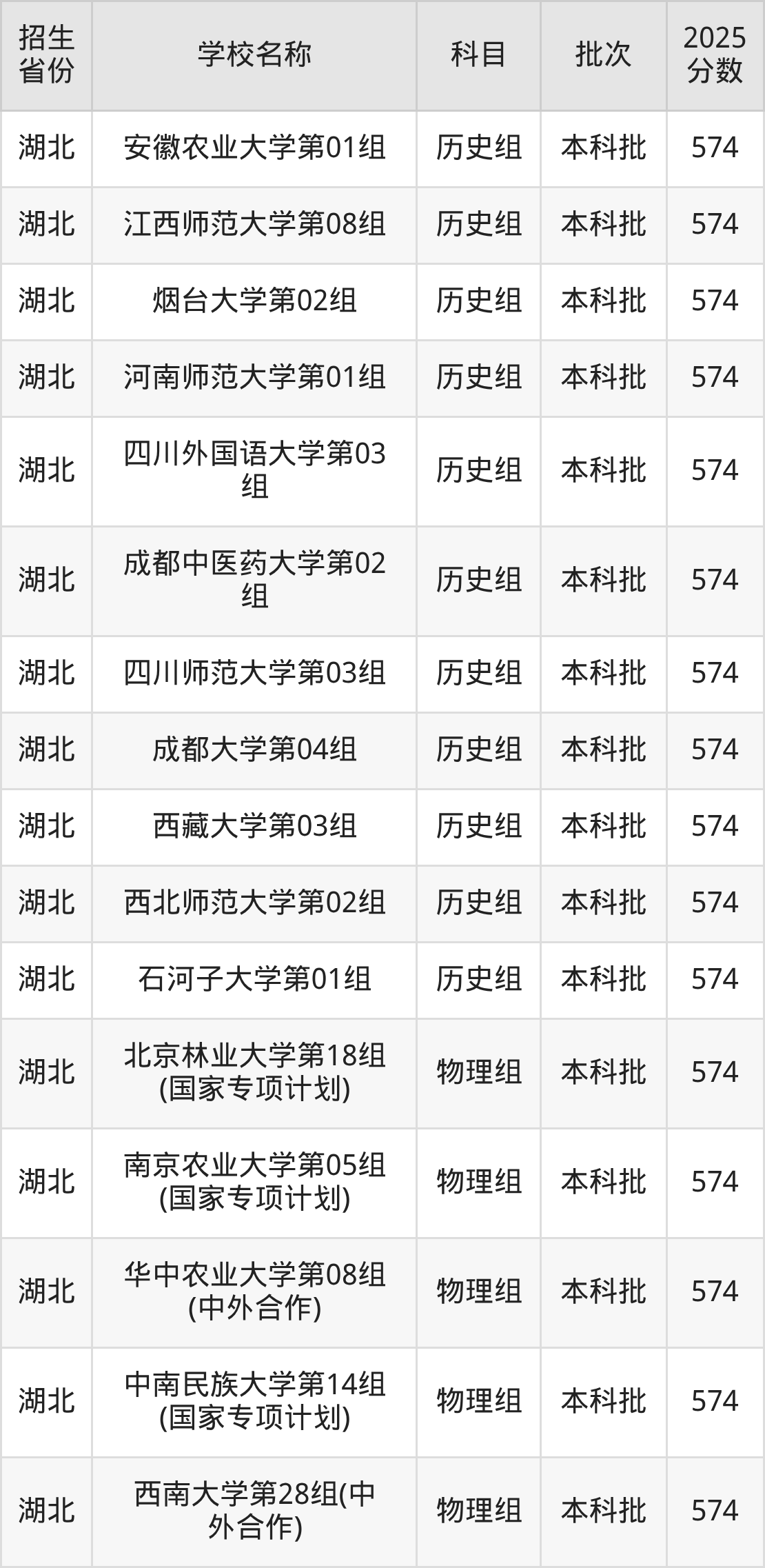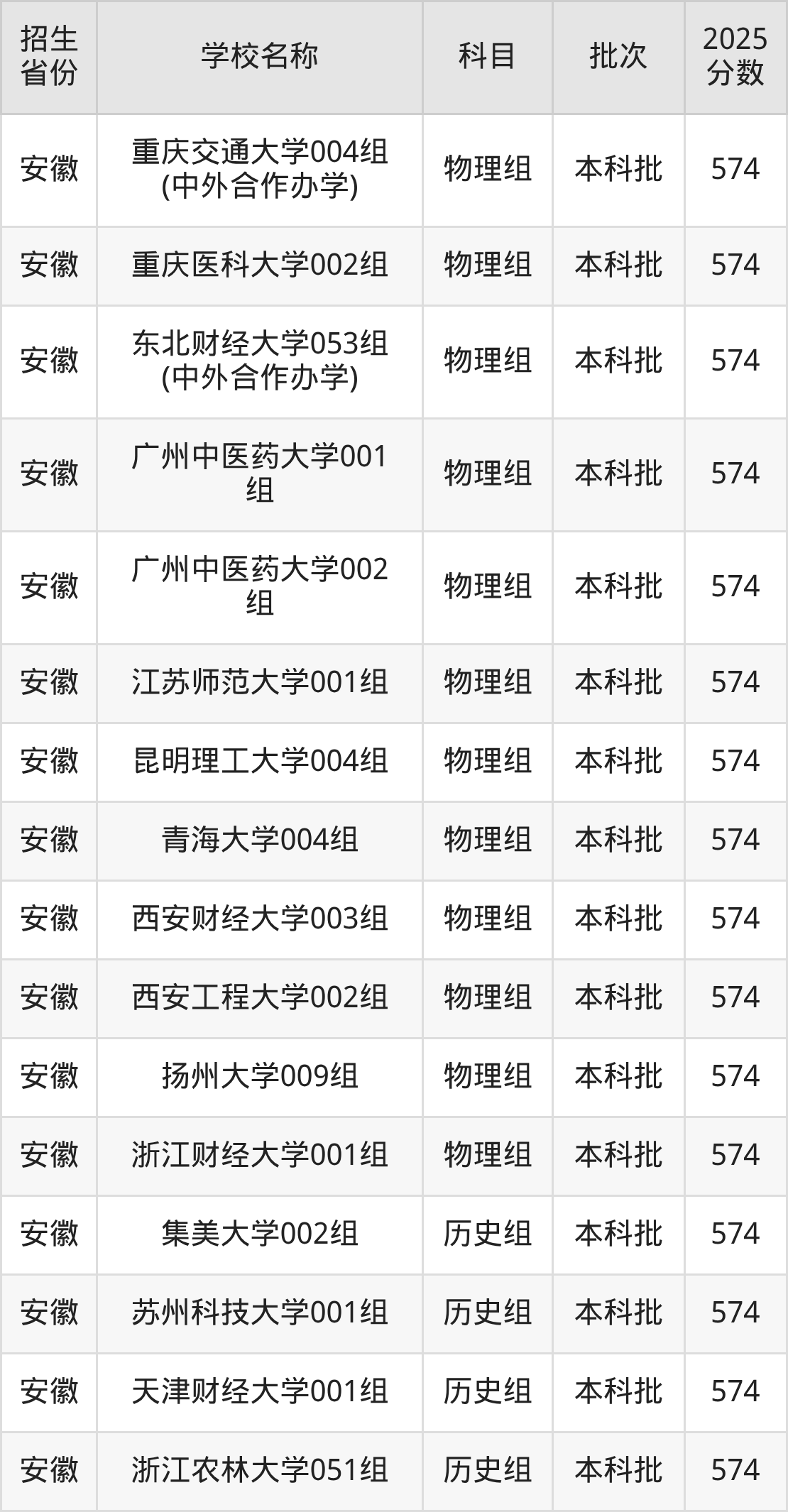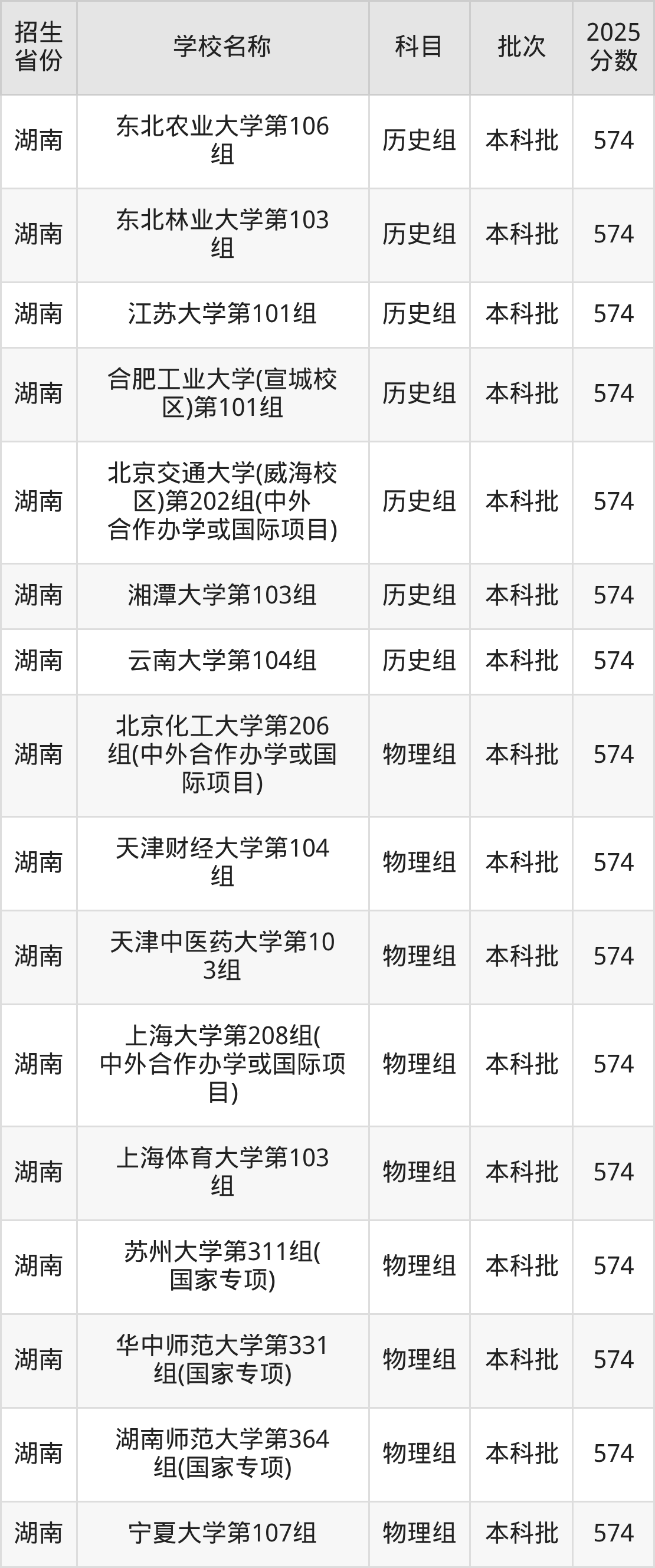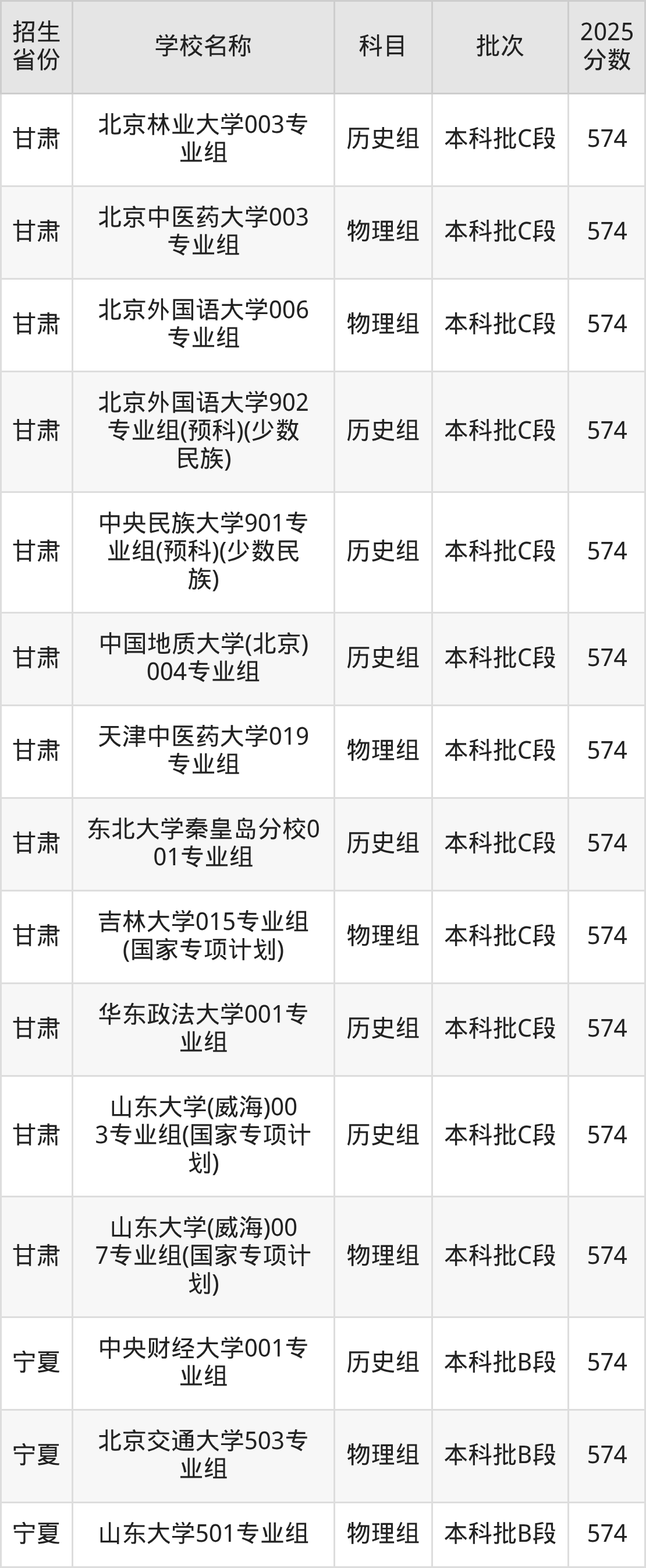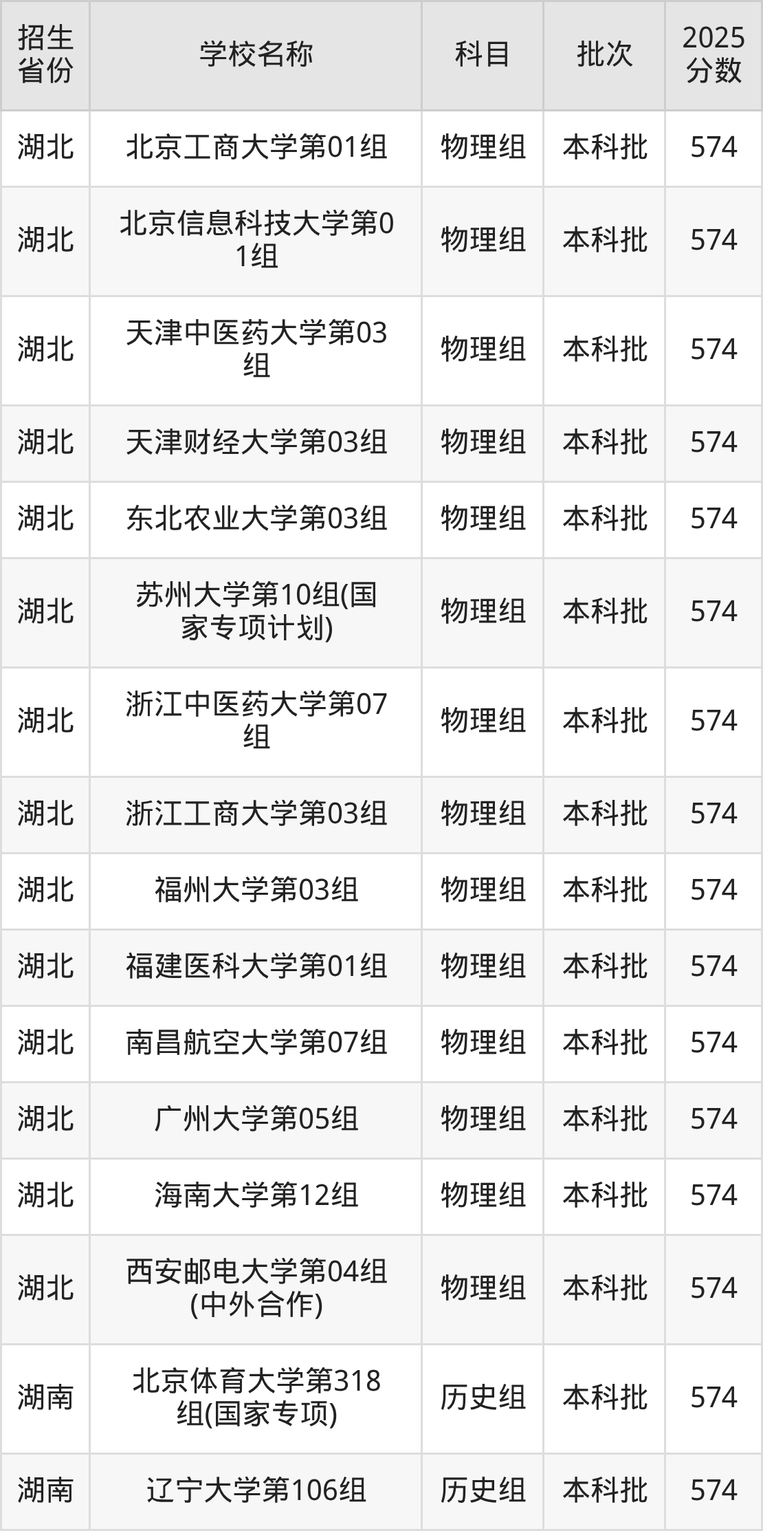 筛选全国各省2025年录取分数线为574分的一本大学如下: