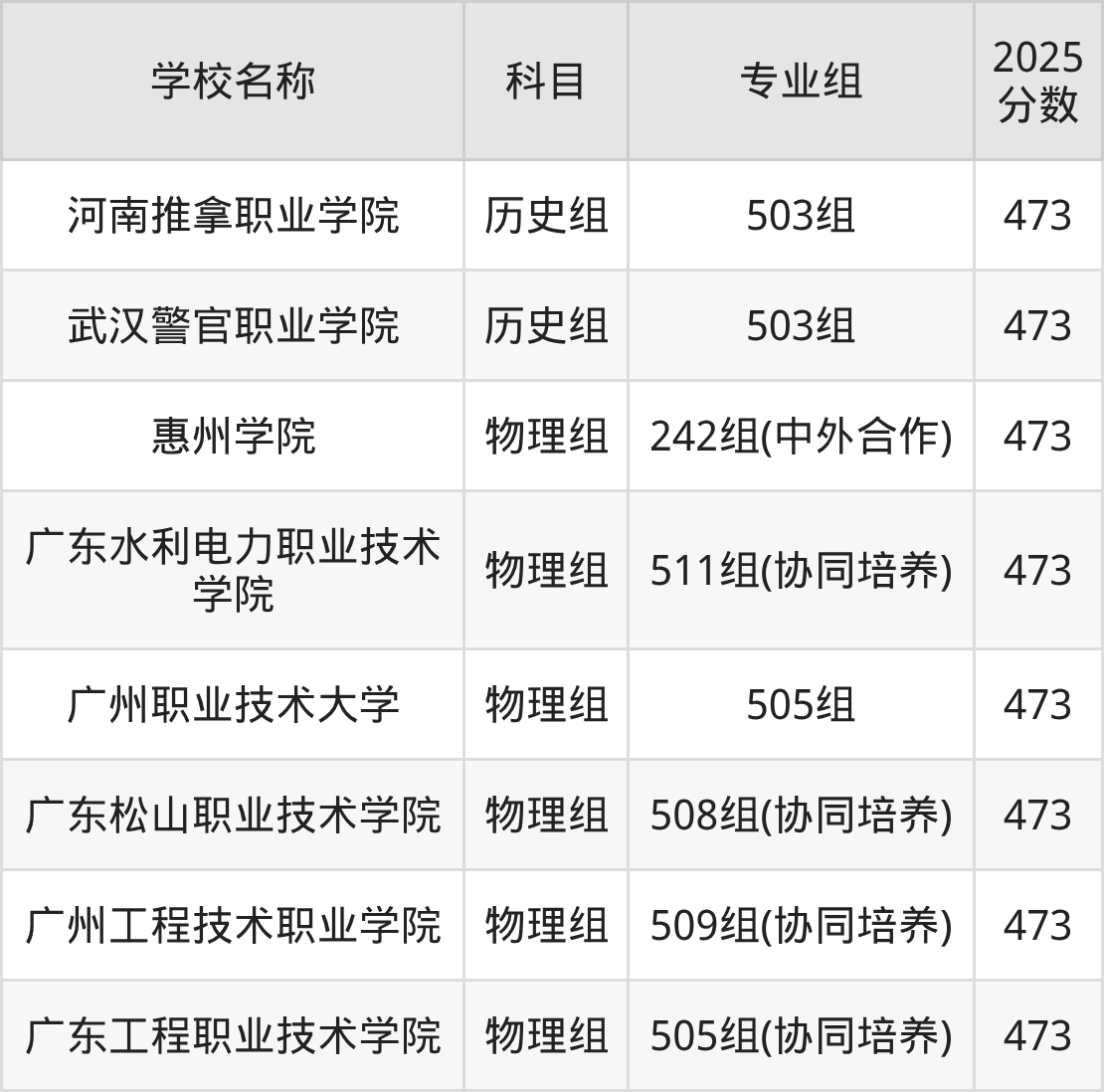 广东高考录取分数线在473分左右的公办院校专业组一共有8个,其中历史组有:河南推拿职业学院(473分)、武汉警官职业学院(473分),物理组有:惠州学院(473分)、广东水利电力职业技术学院(473分)、广州职业技术大学(473分)。