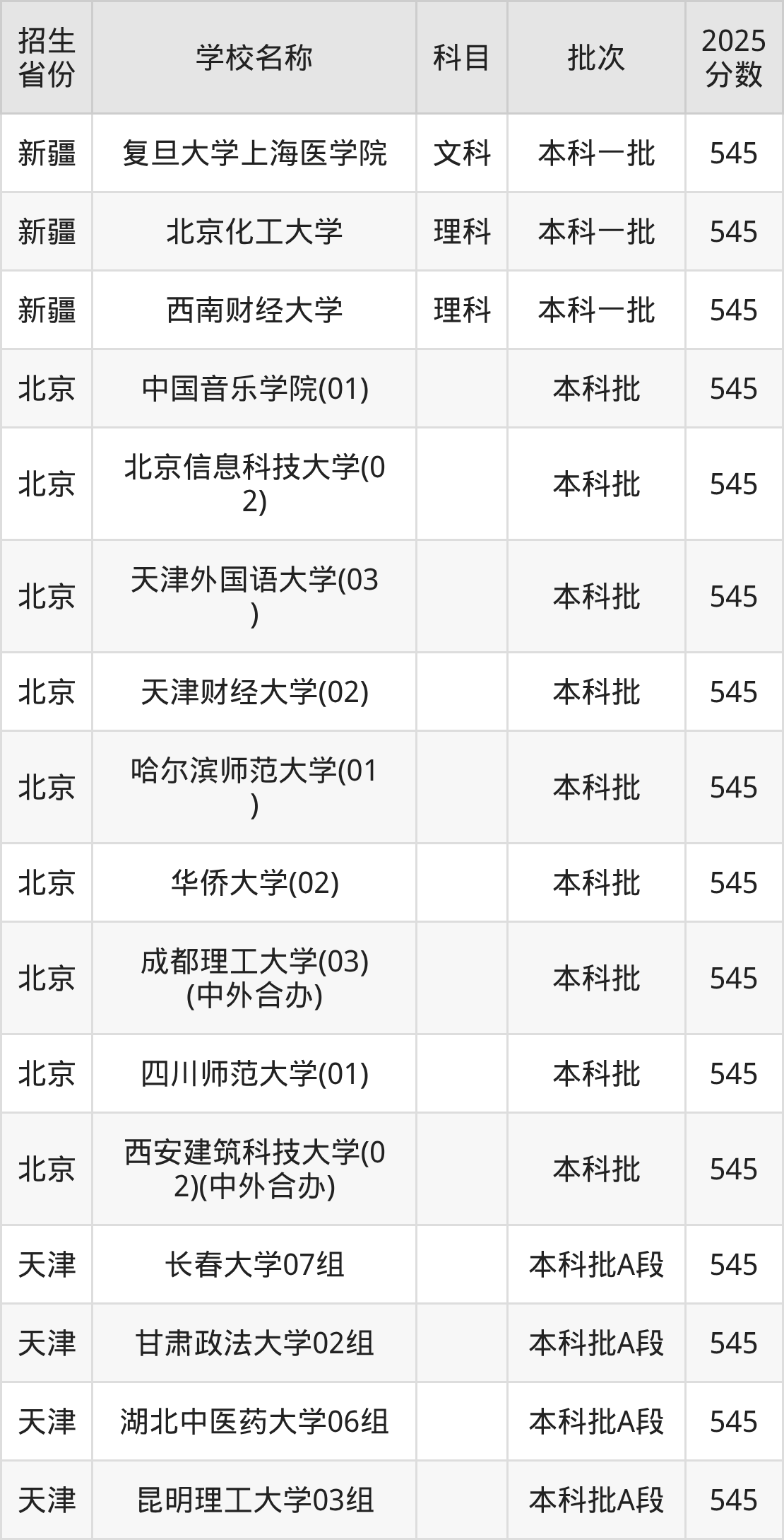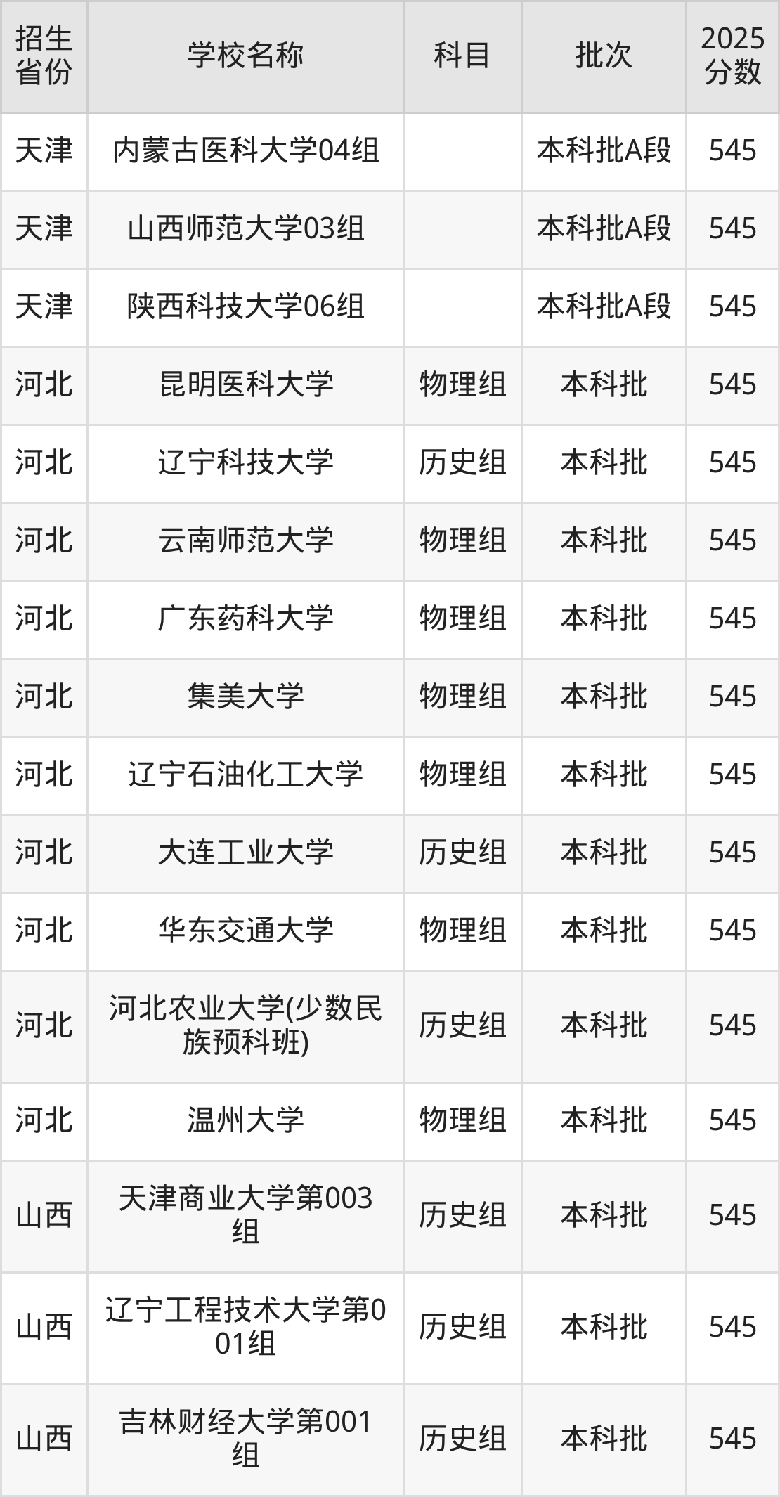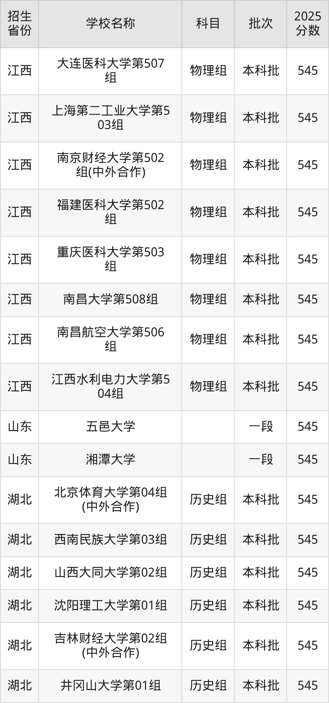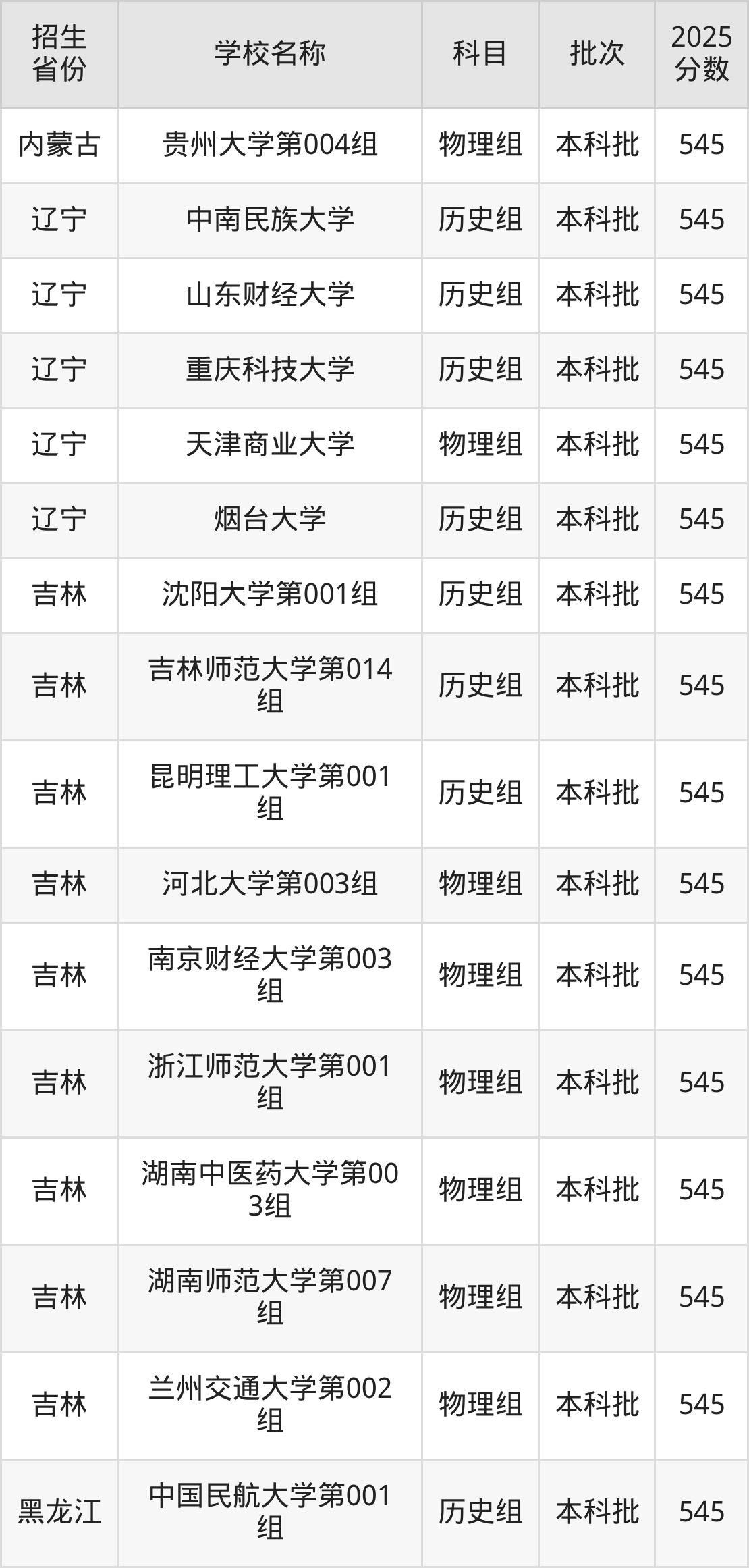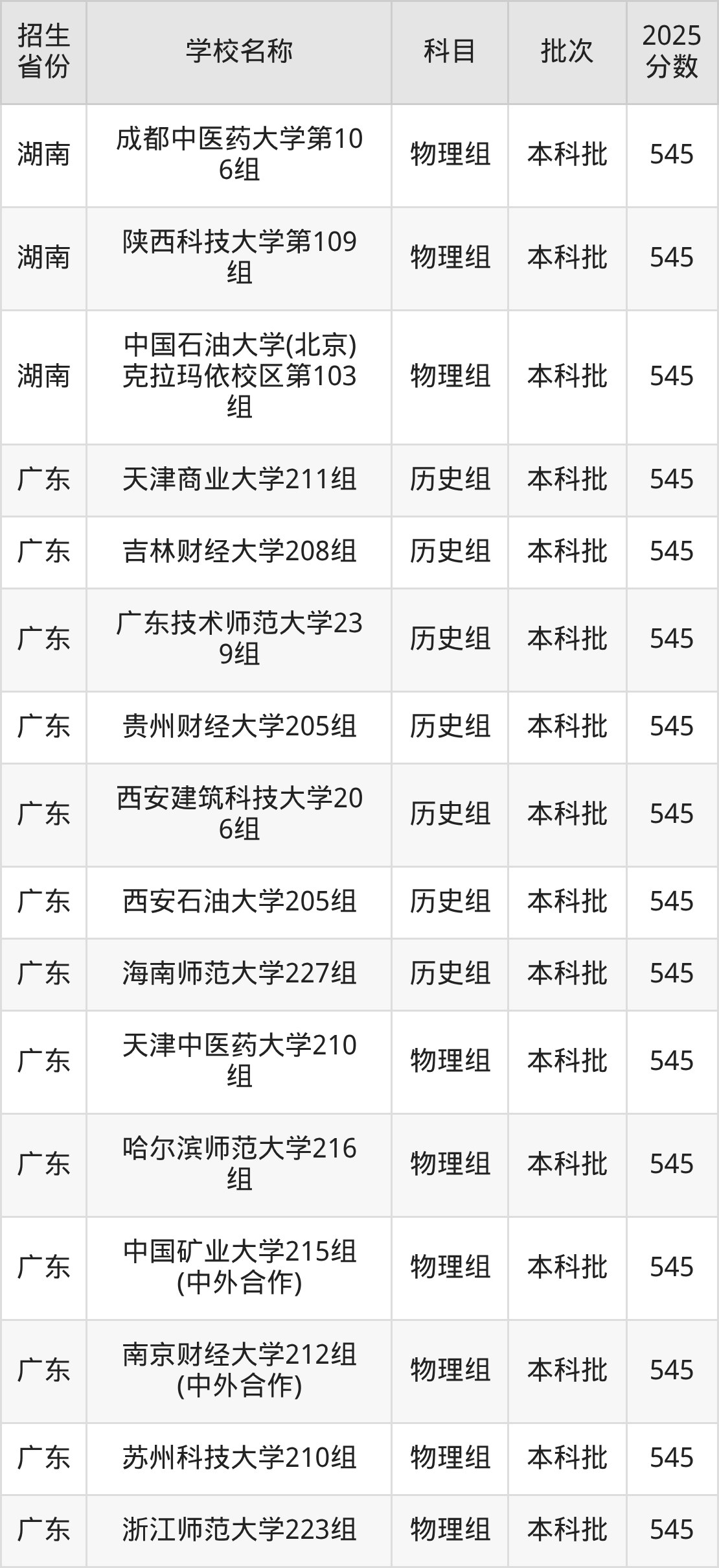 筛选全国各省2025年录取分数线为545分的一本大学如下: