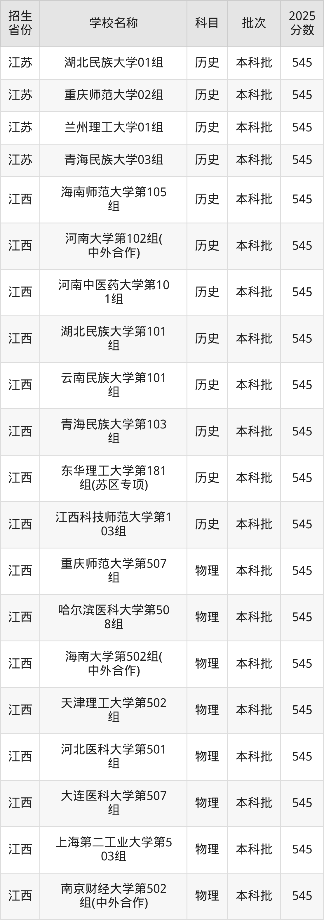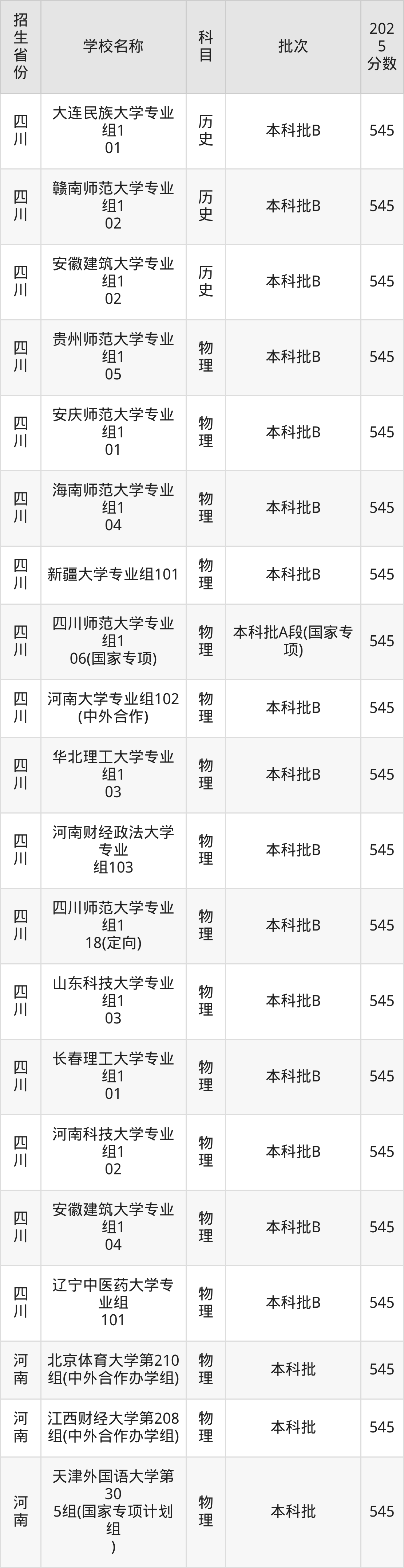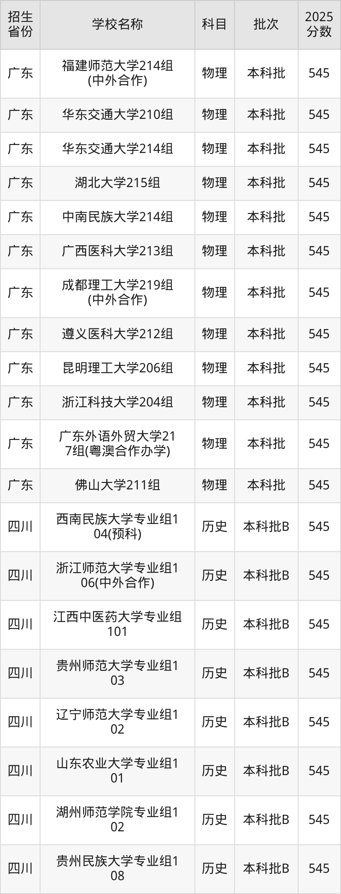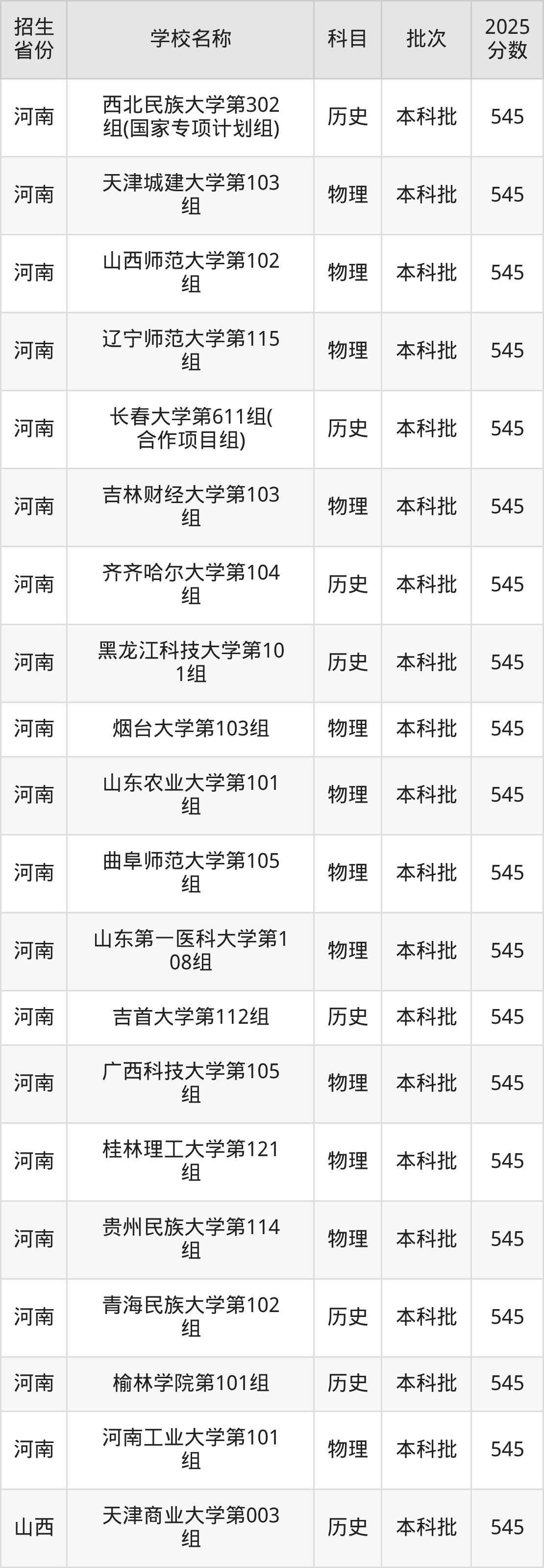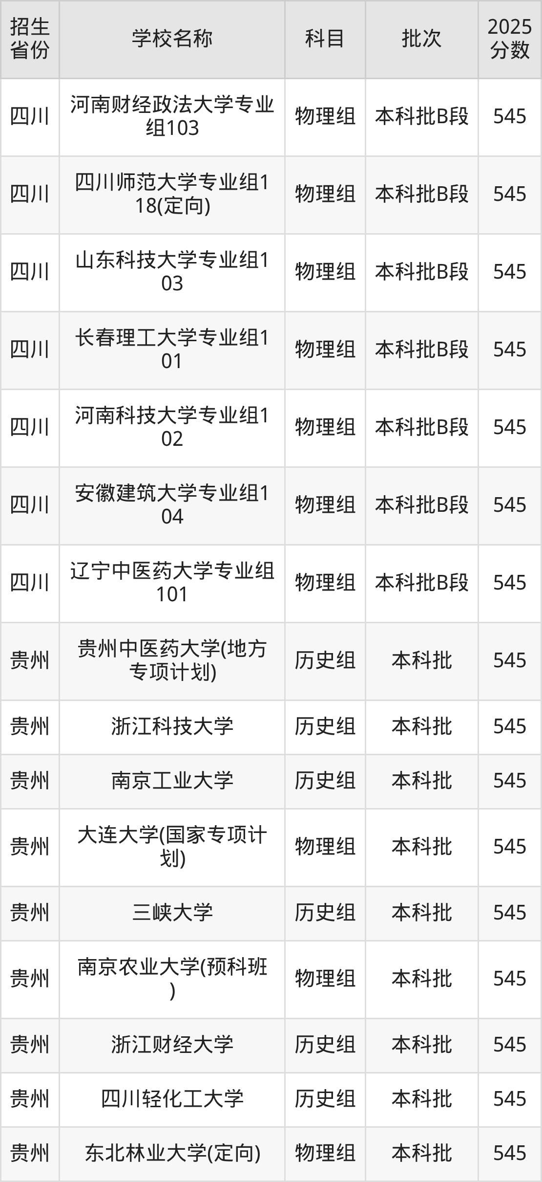 筛选全国各省2025年录取分数线为545分的一本大学如下: