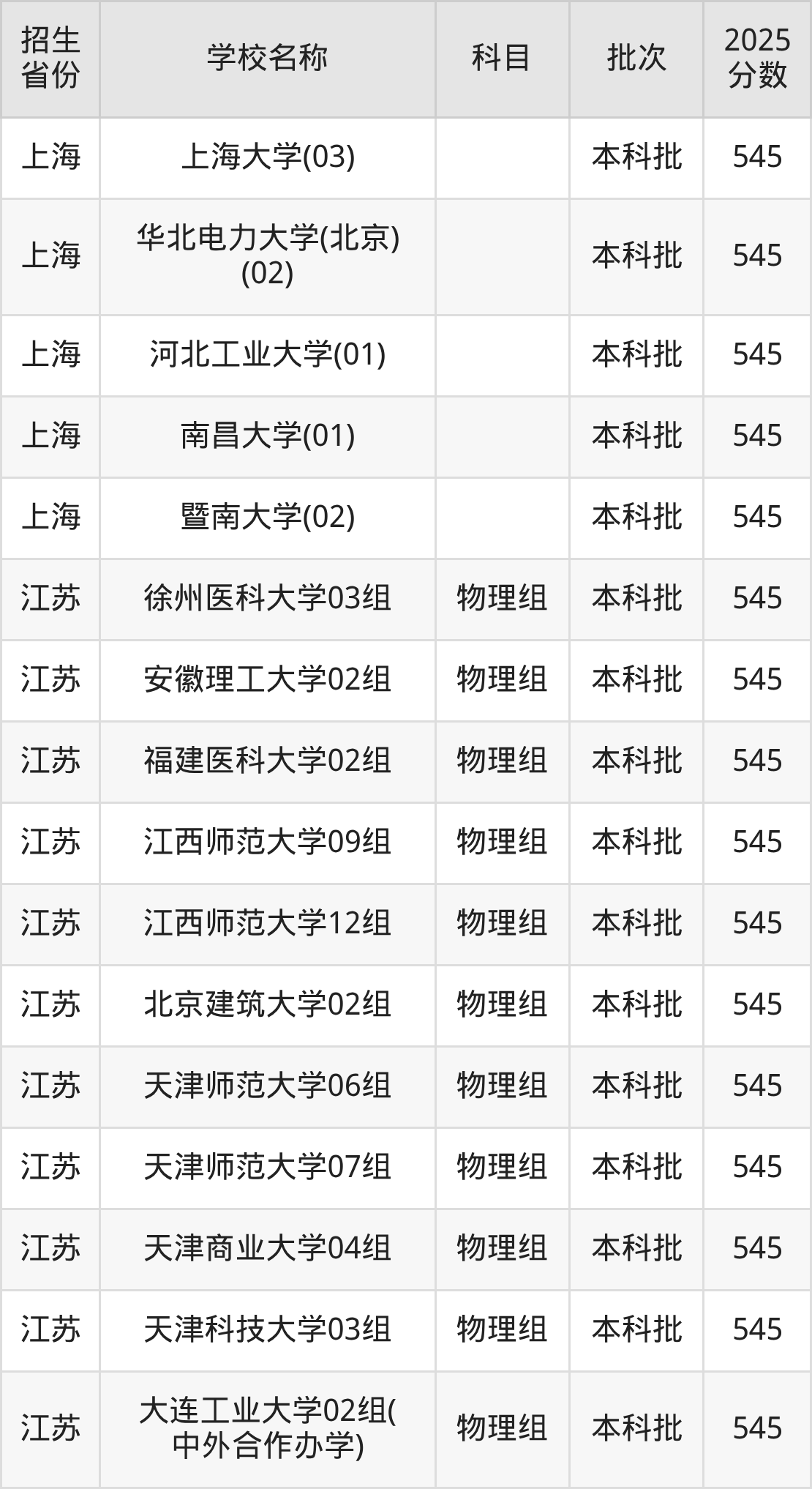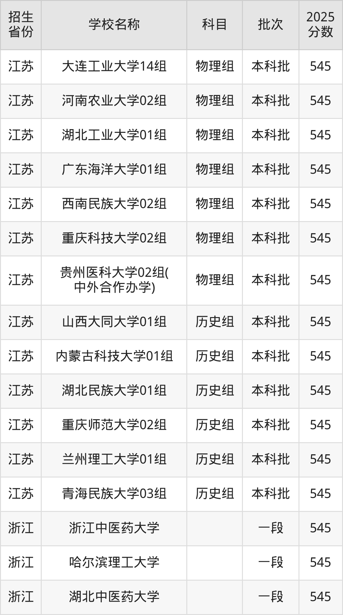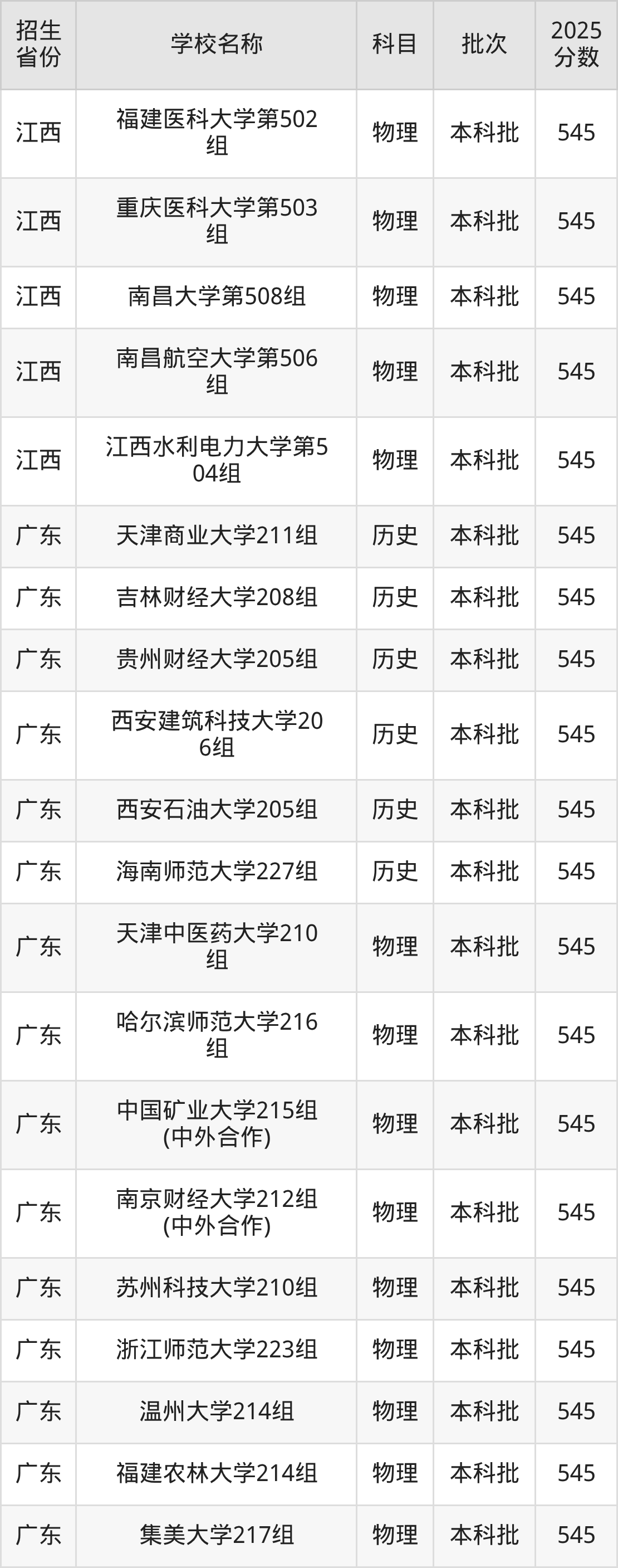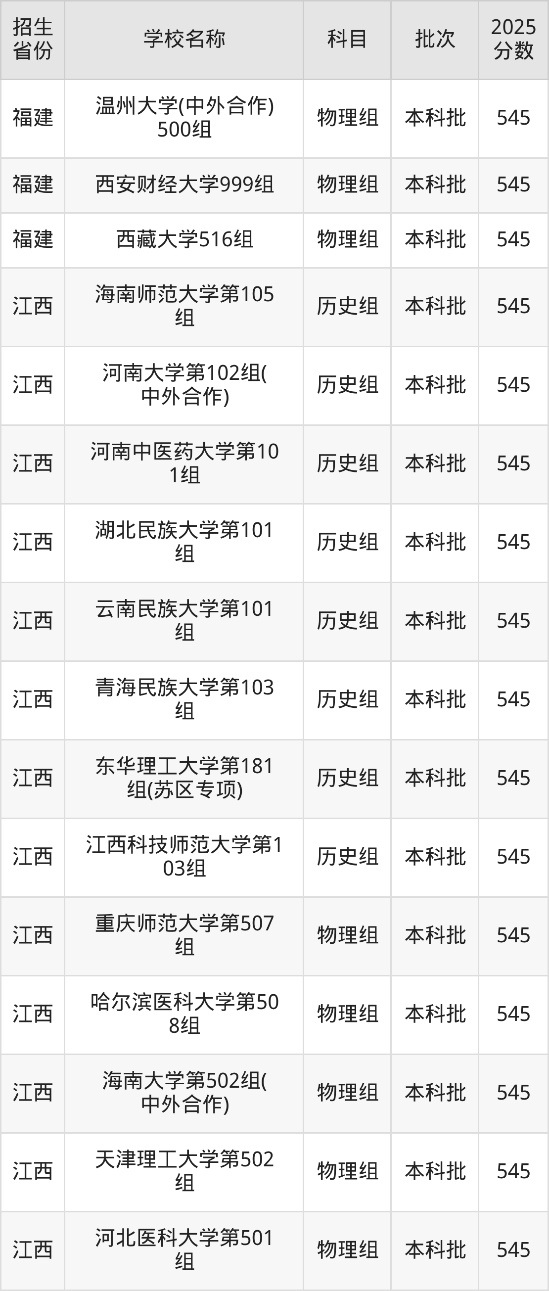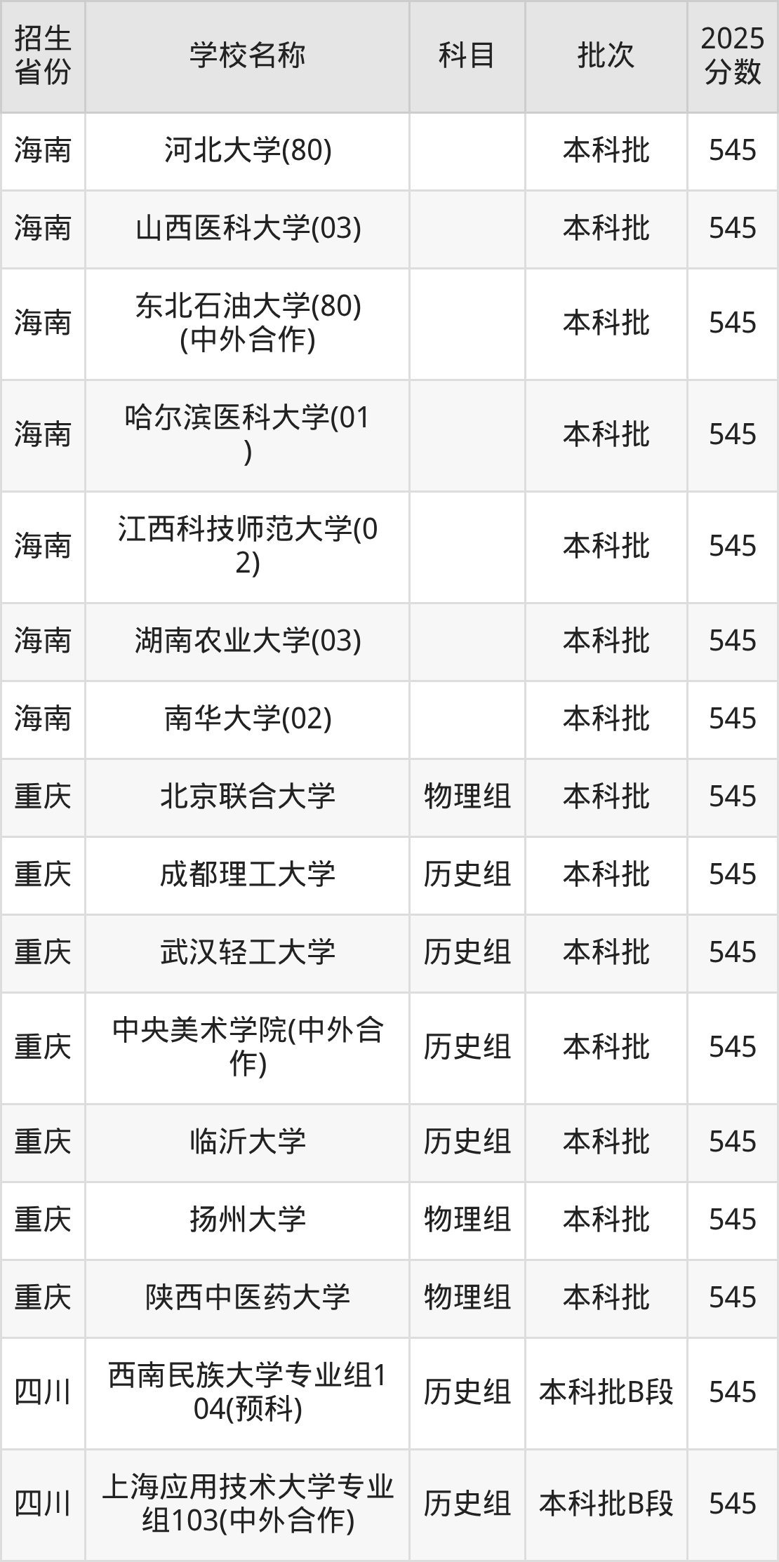 筛选全国各省2025年录取分数线为545分的一本大学如下: