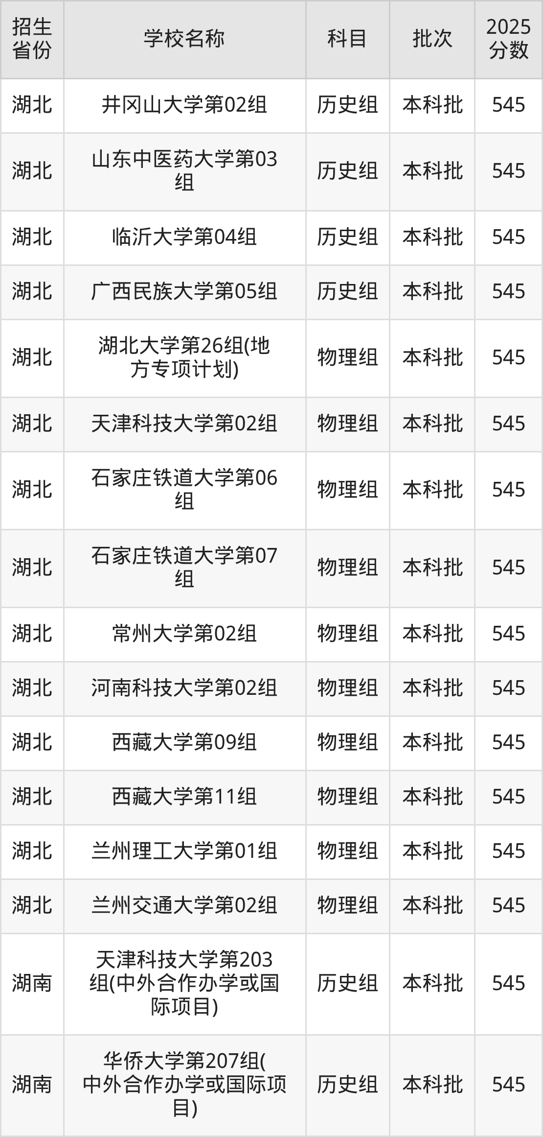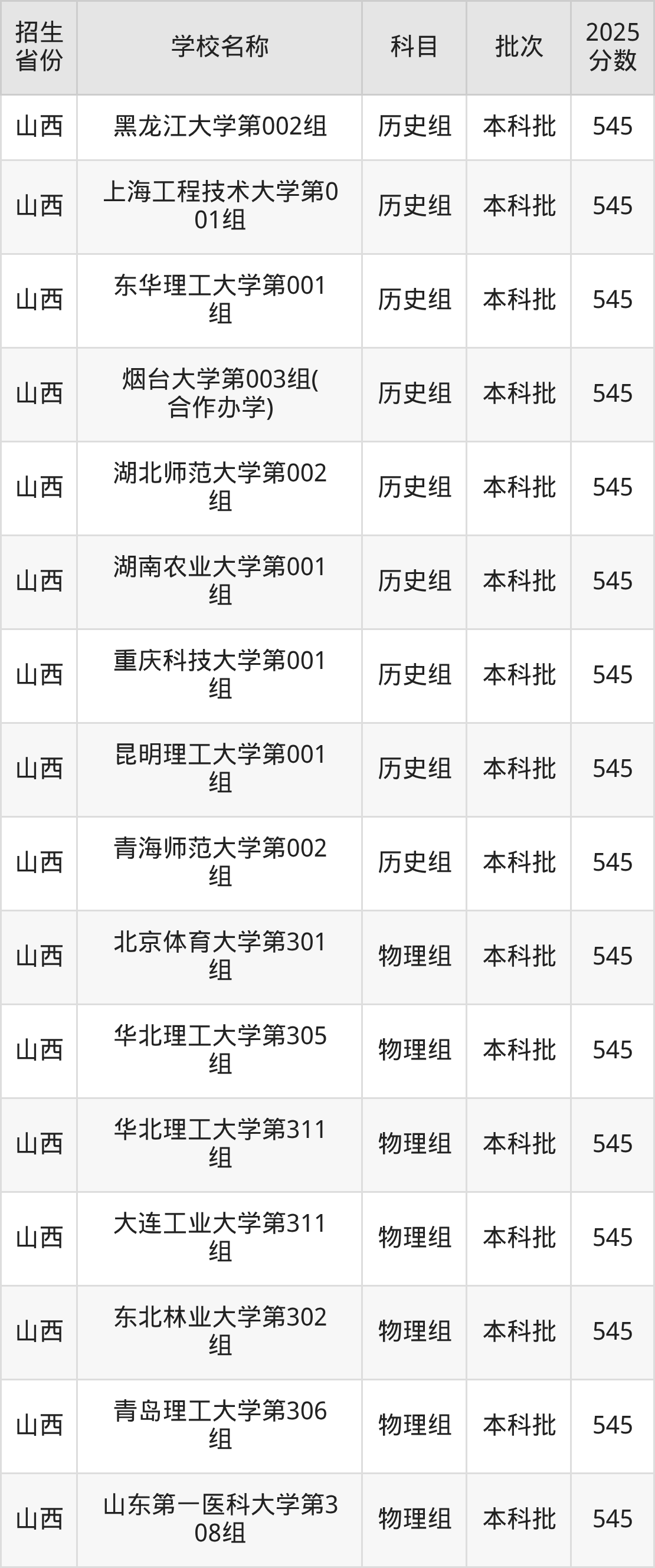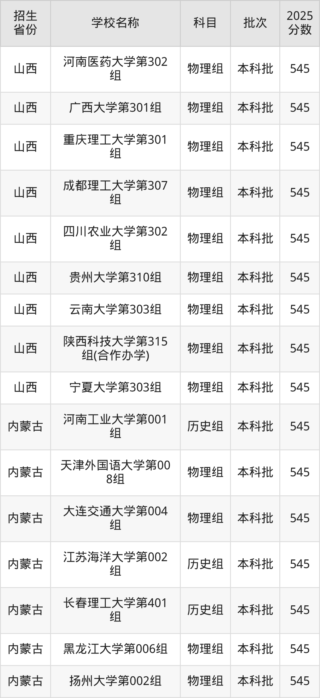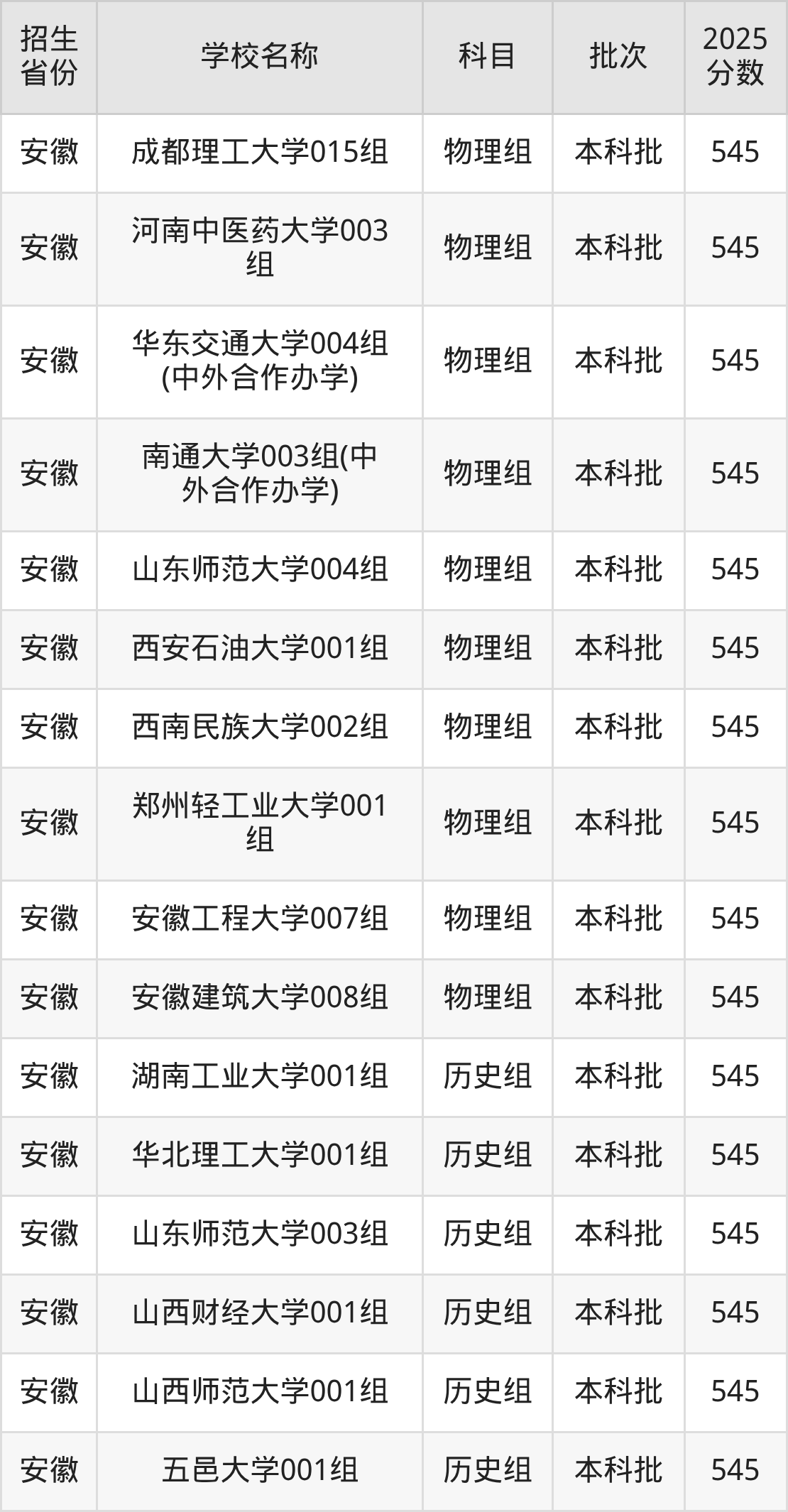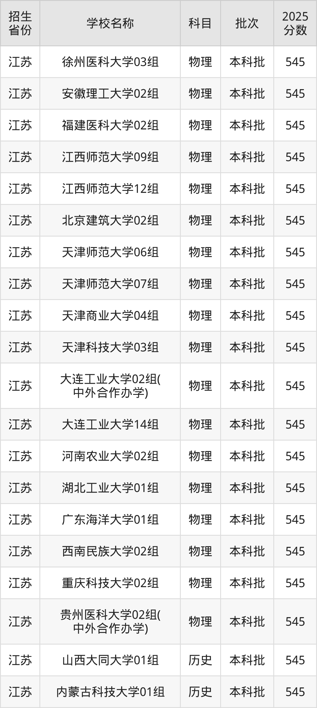 筛选全国各省2025年录取分数线为545分的一本大学如下: