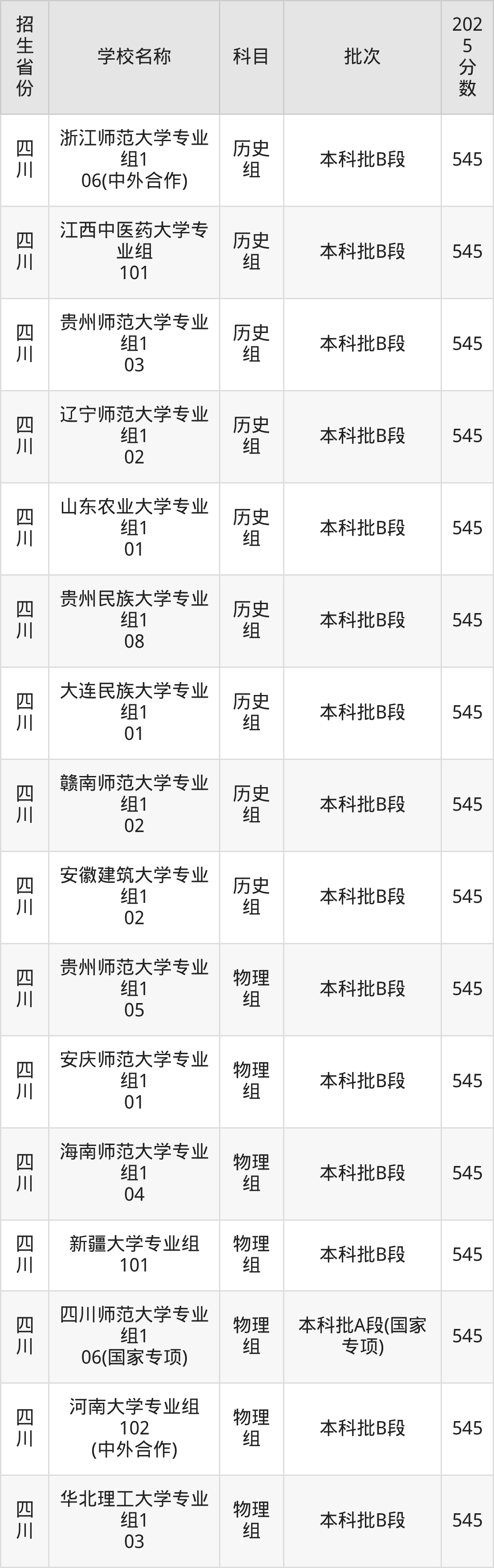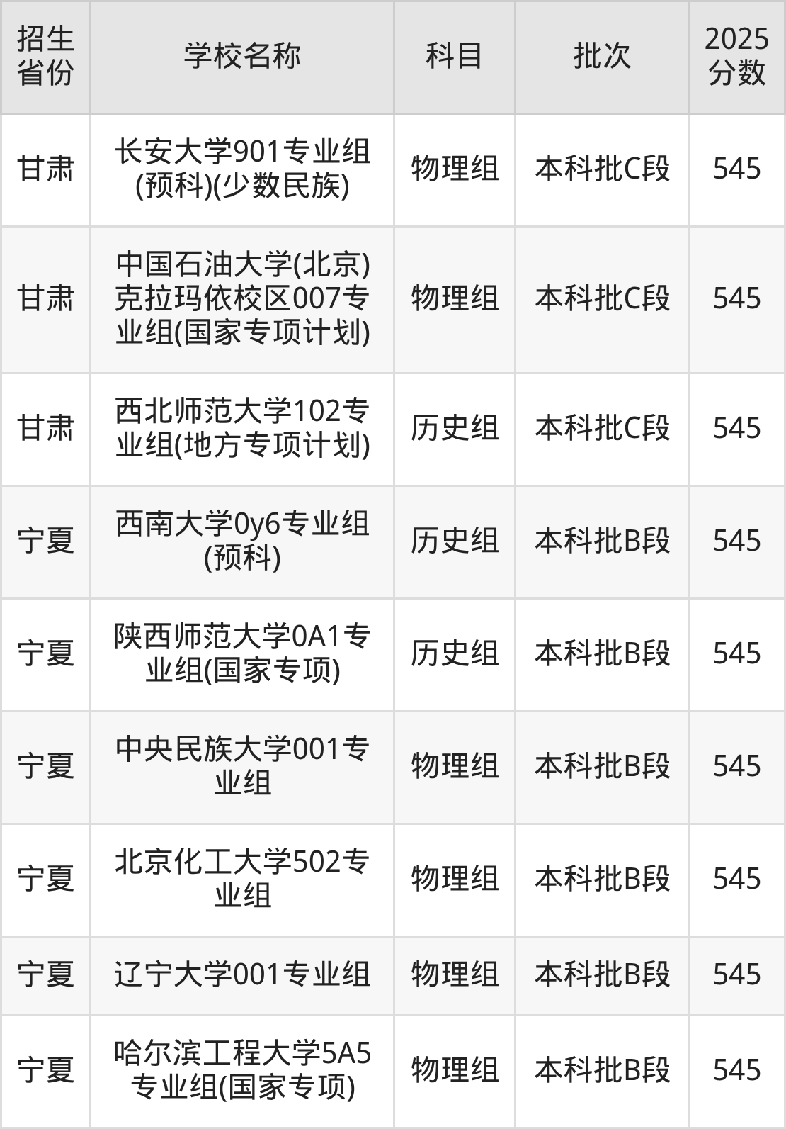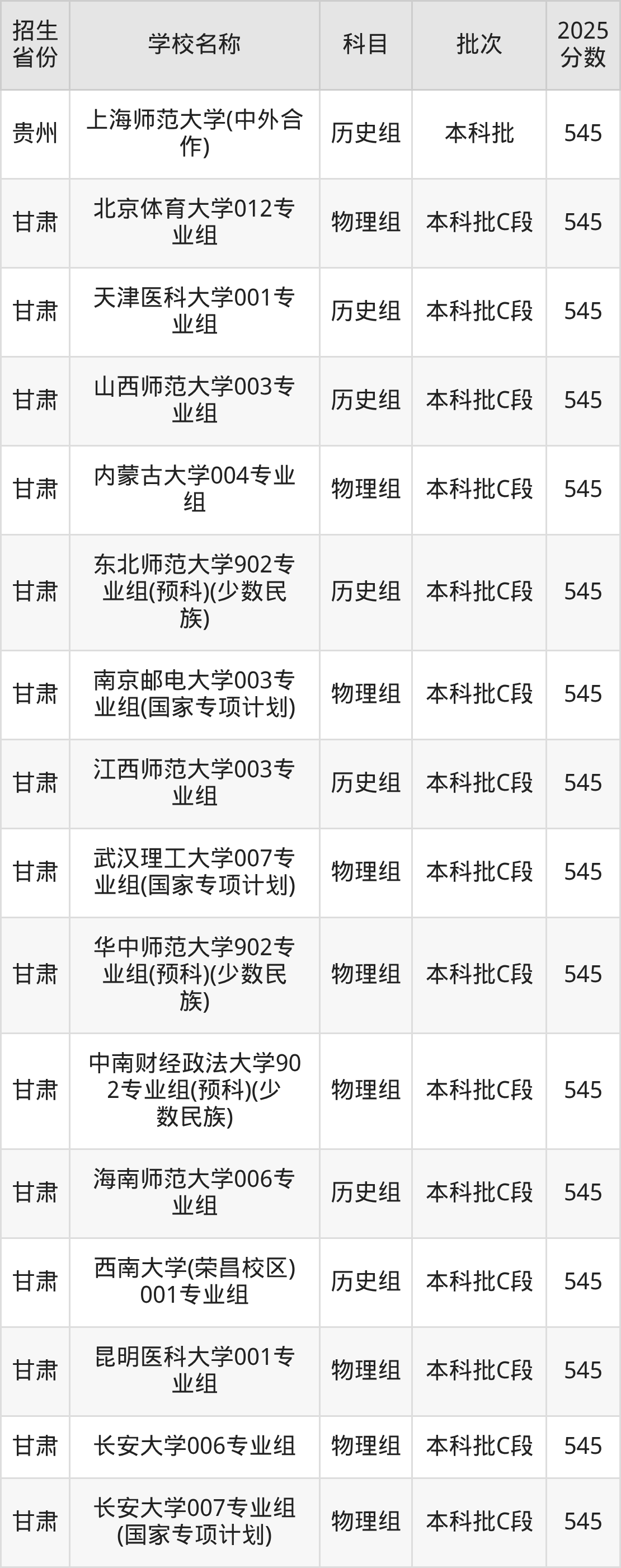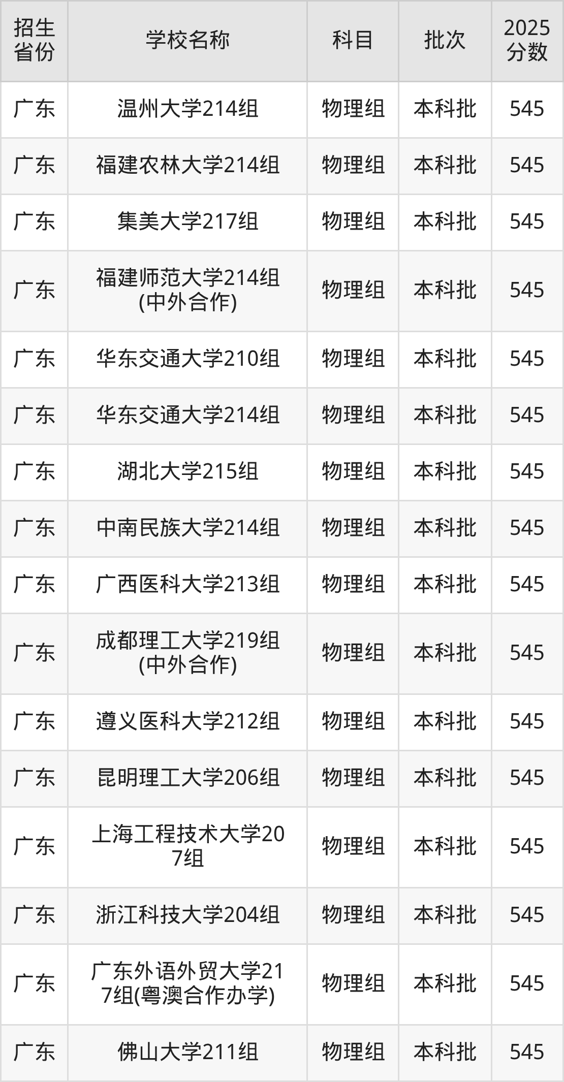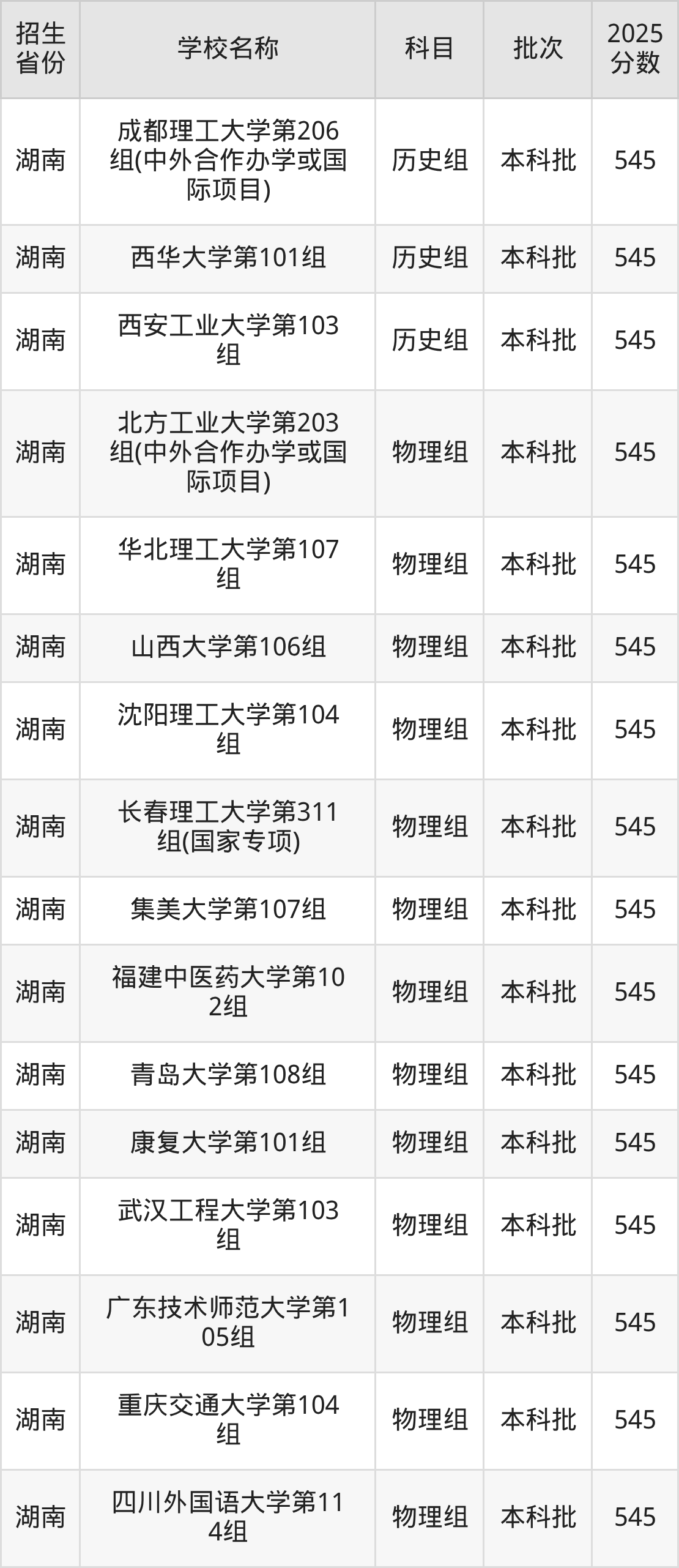 筛选全国各省2025年录取分数线为545分的一本大学如下: