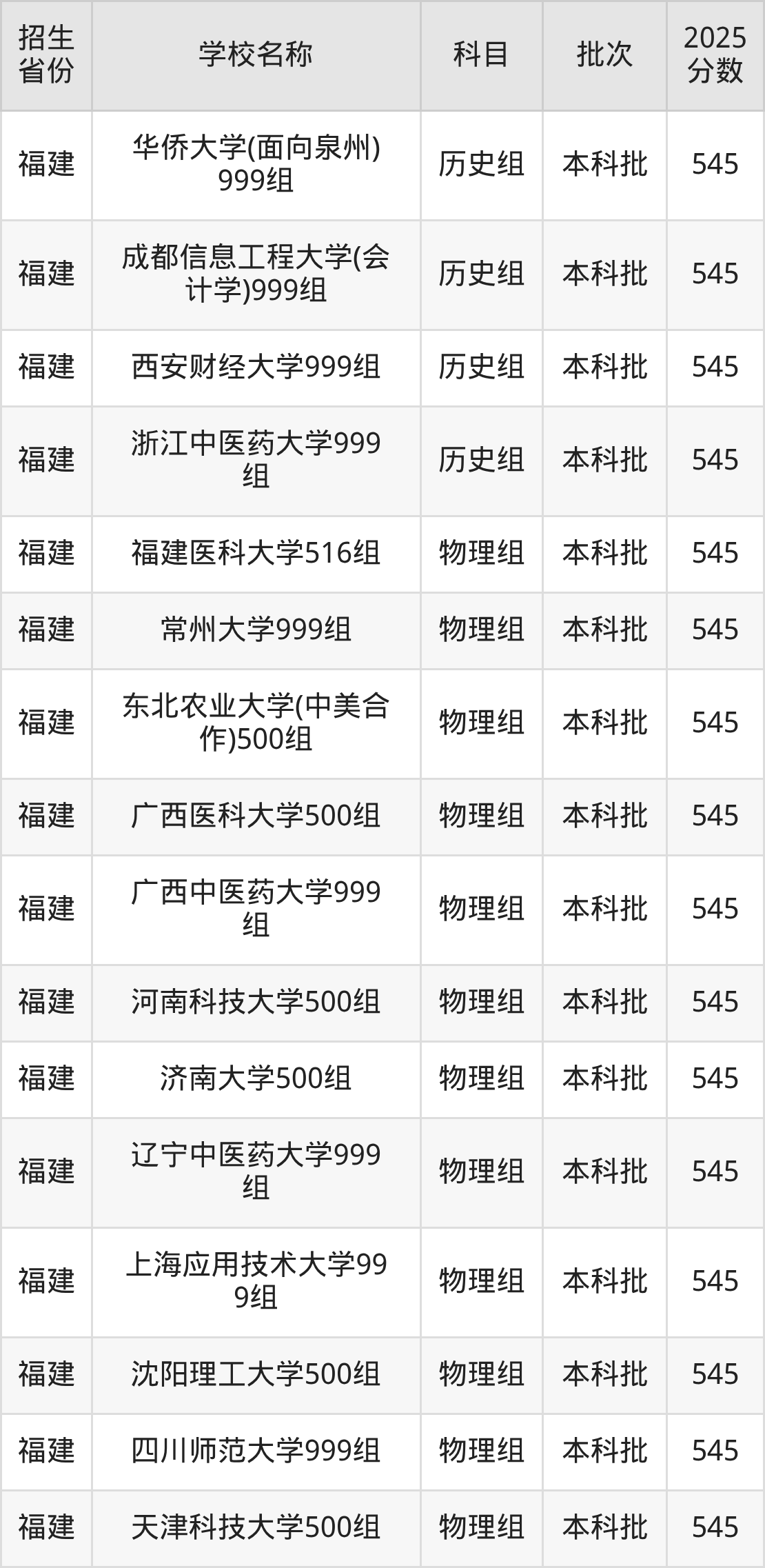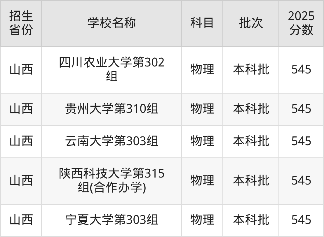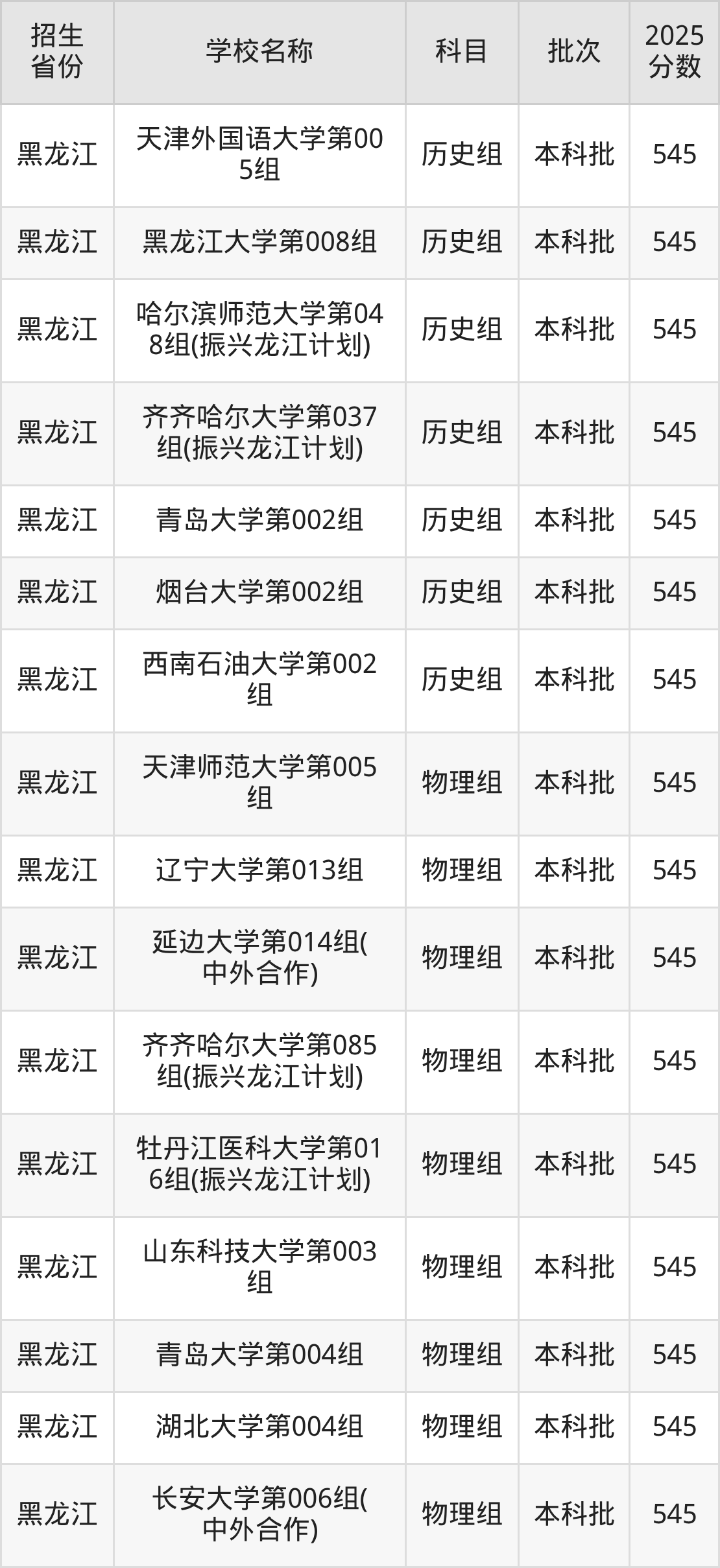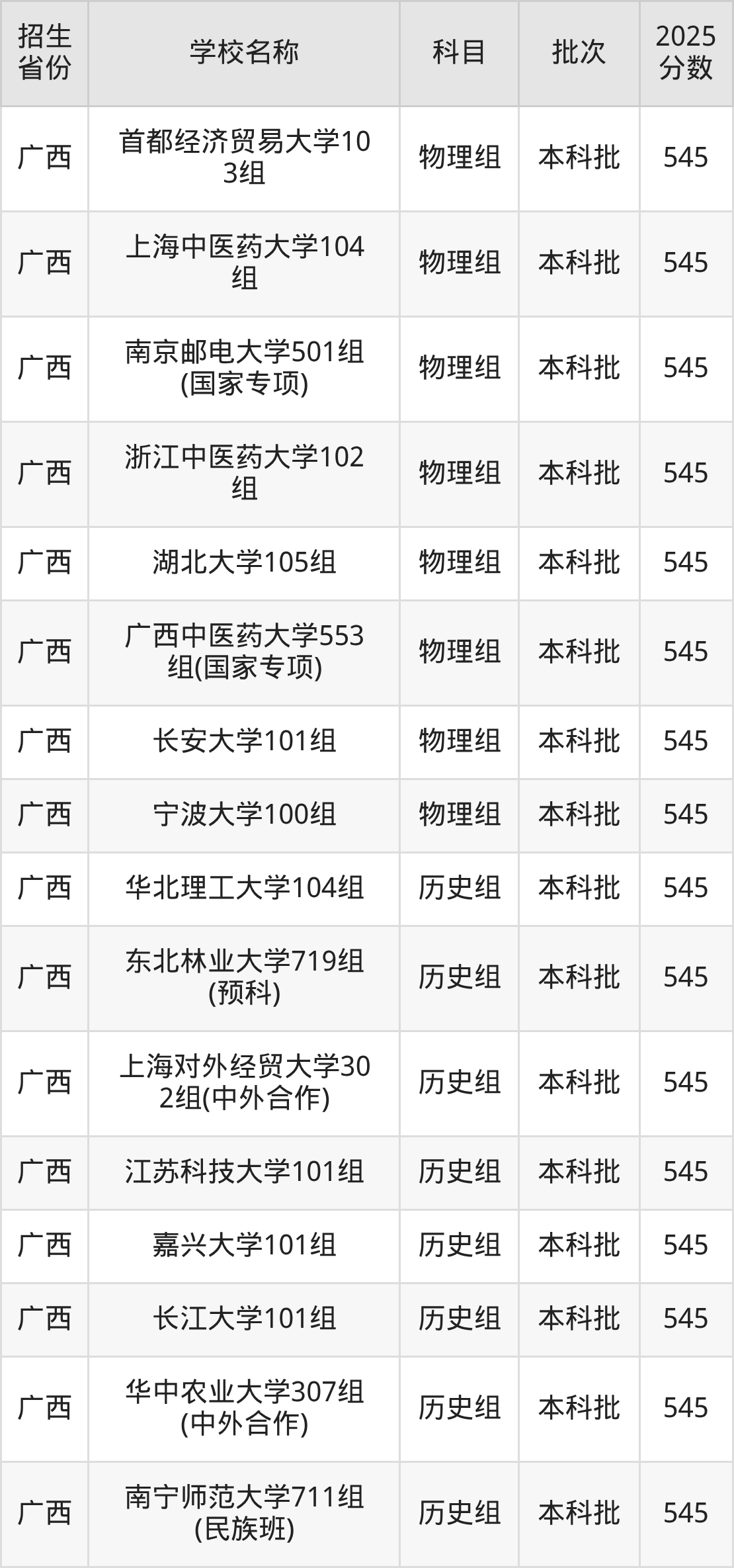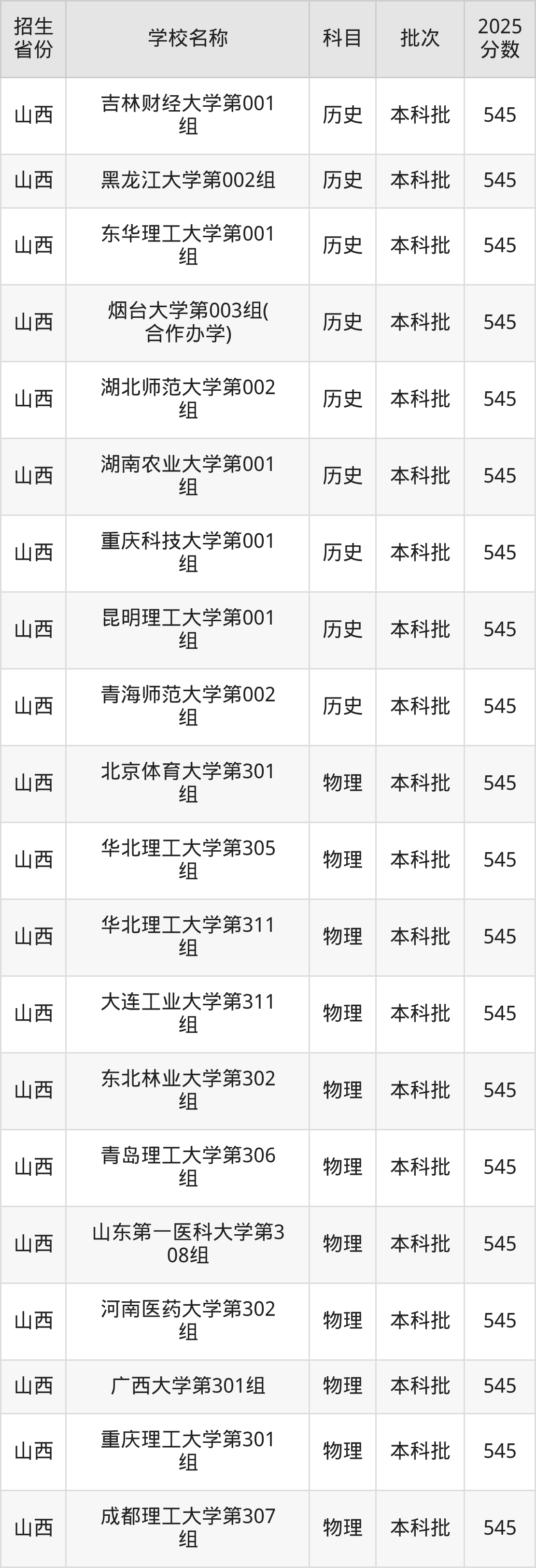 筛选全国各省2025年录取分数线为545分的一本大学如下: