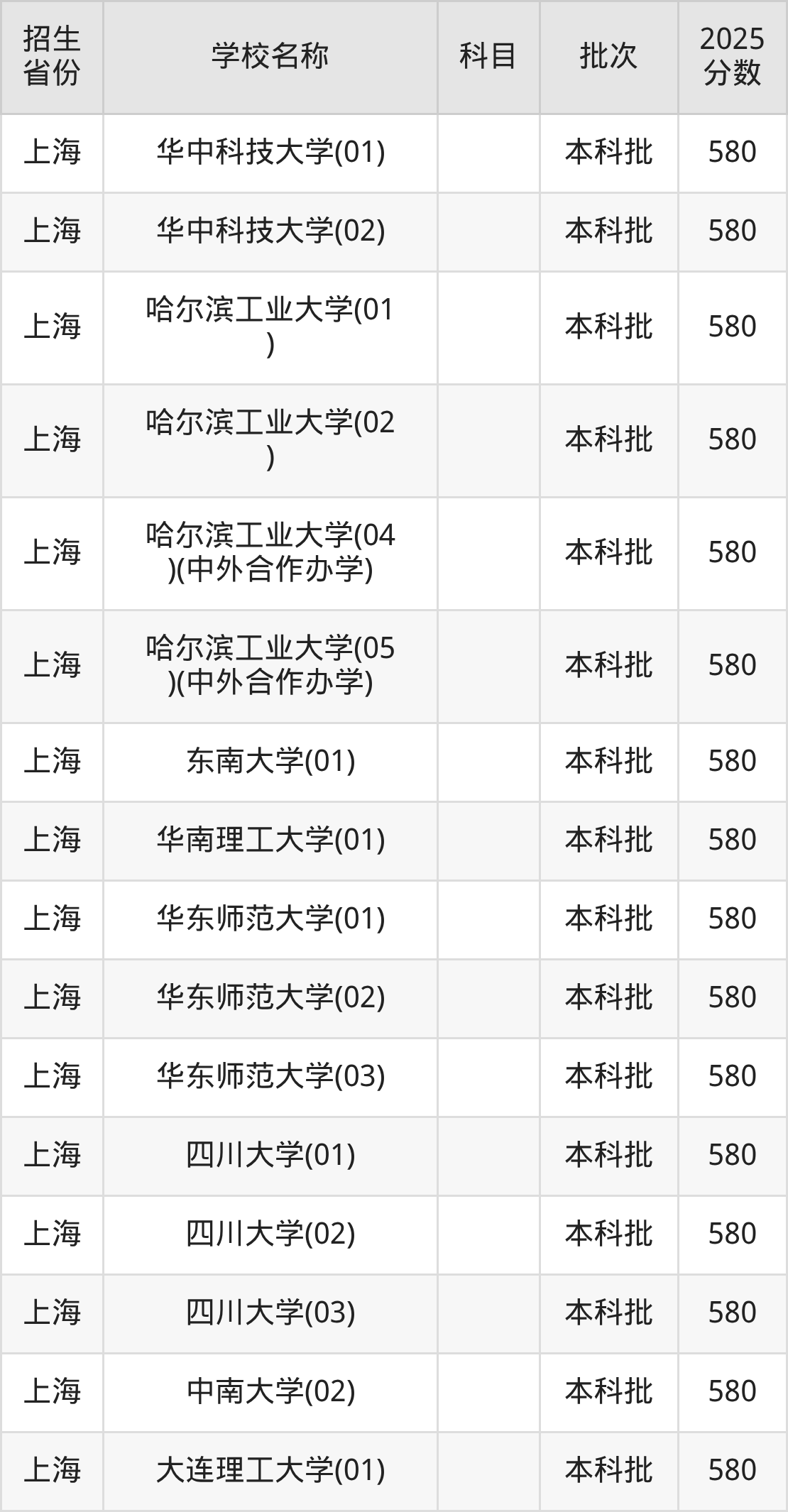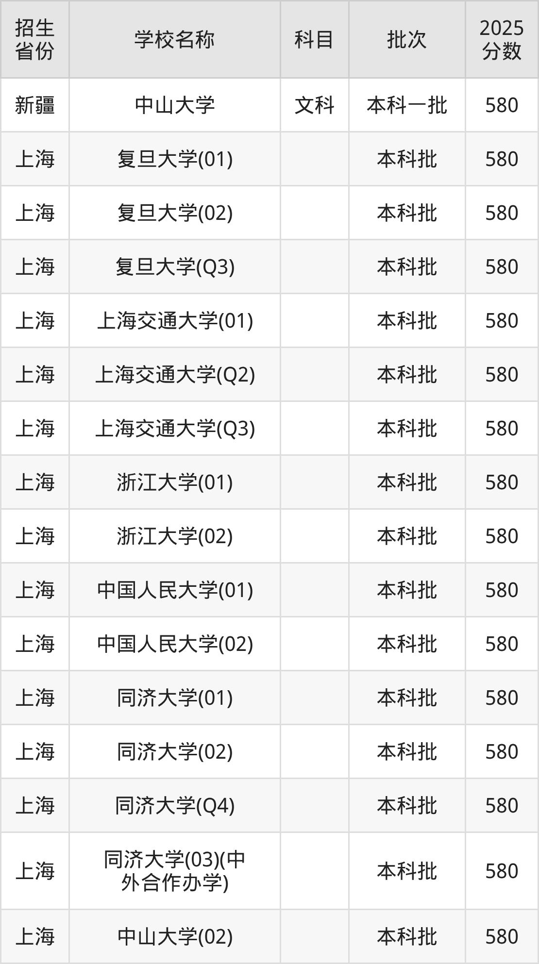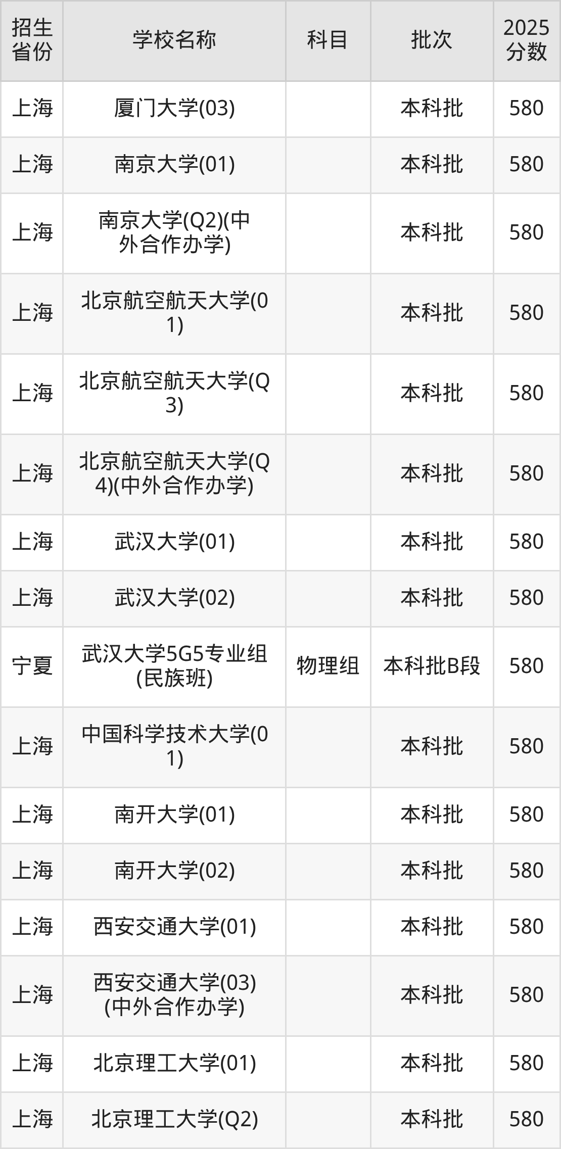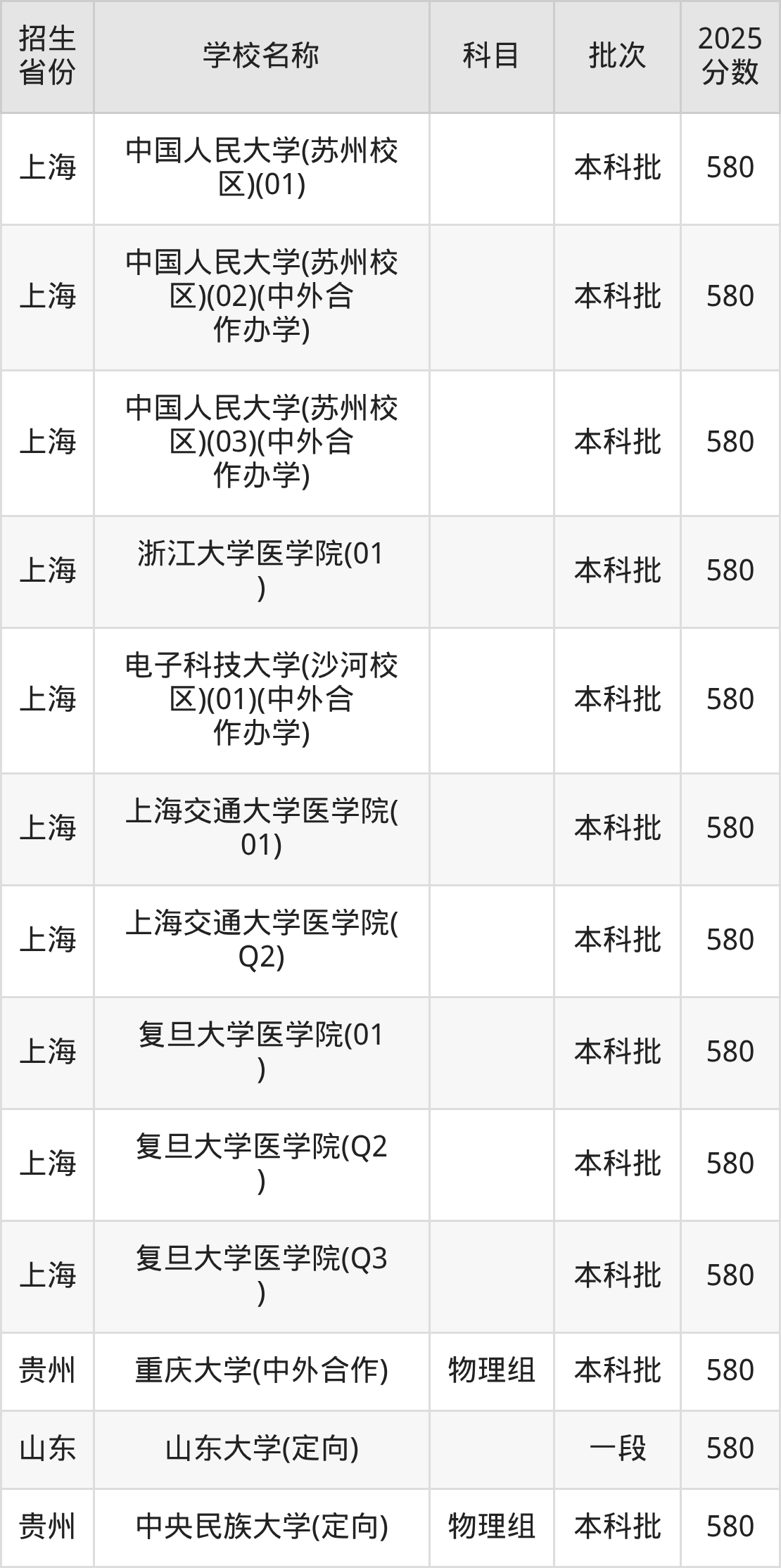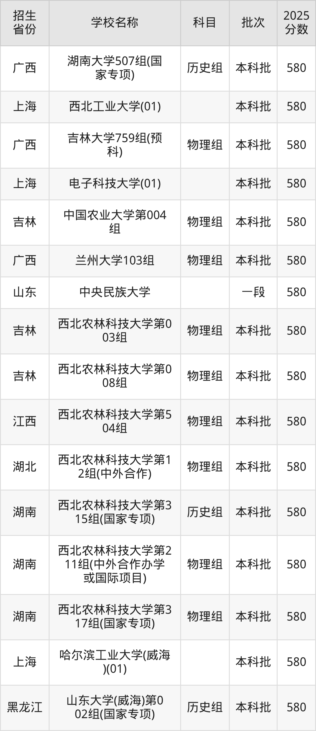 筛选全国各省2025年录取分数线为580分的985大学如下: