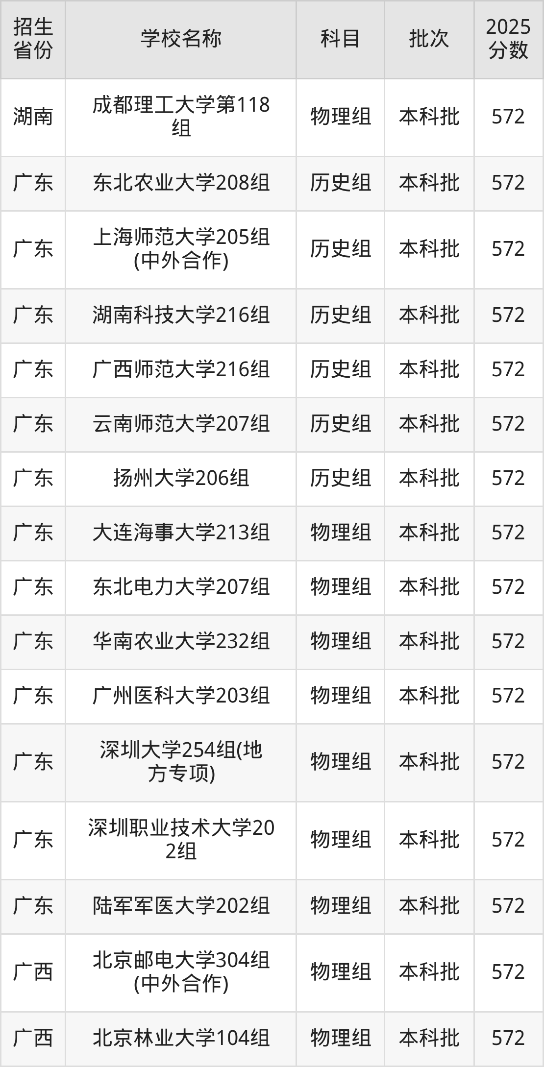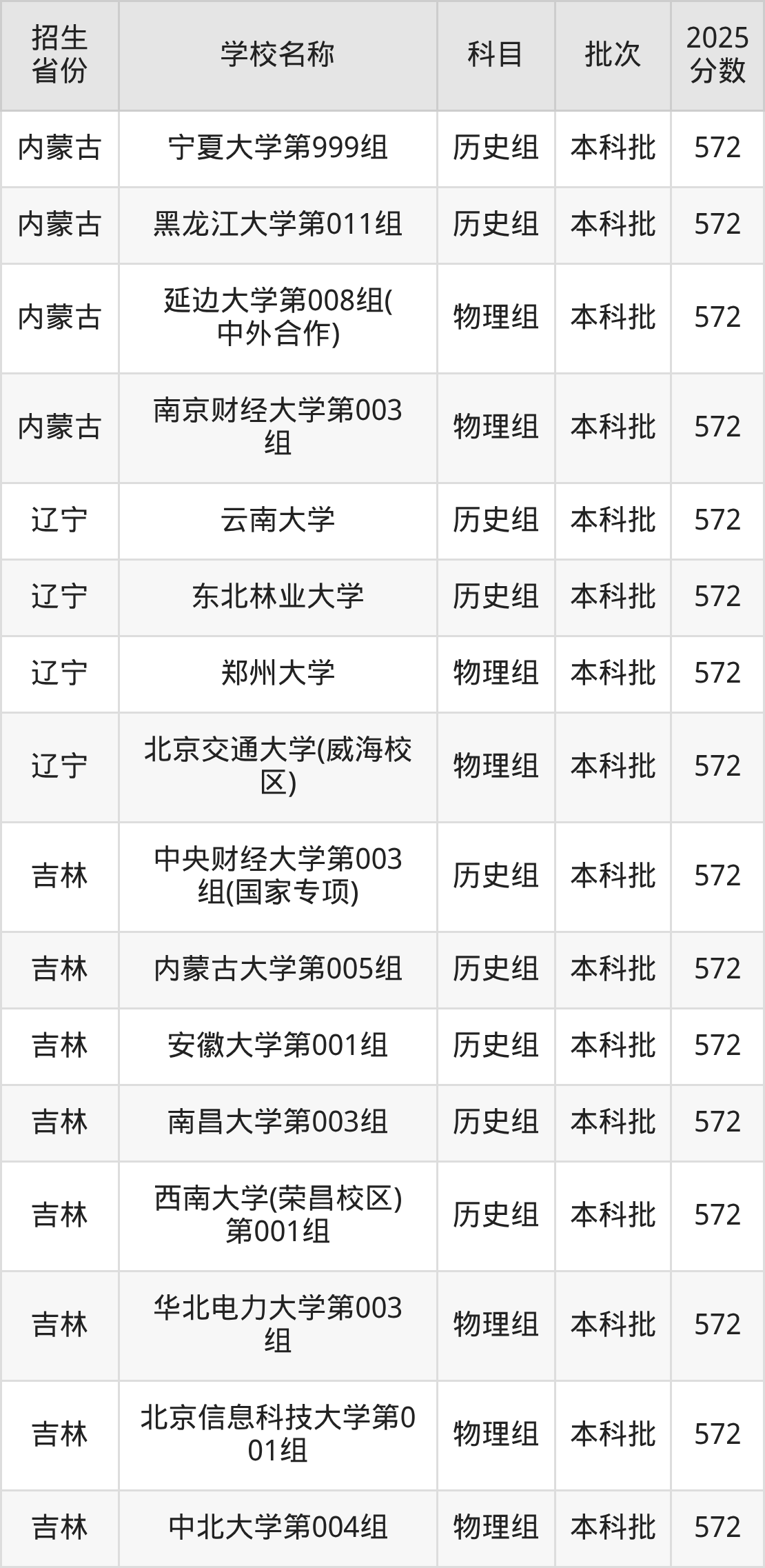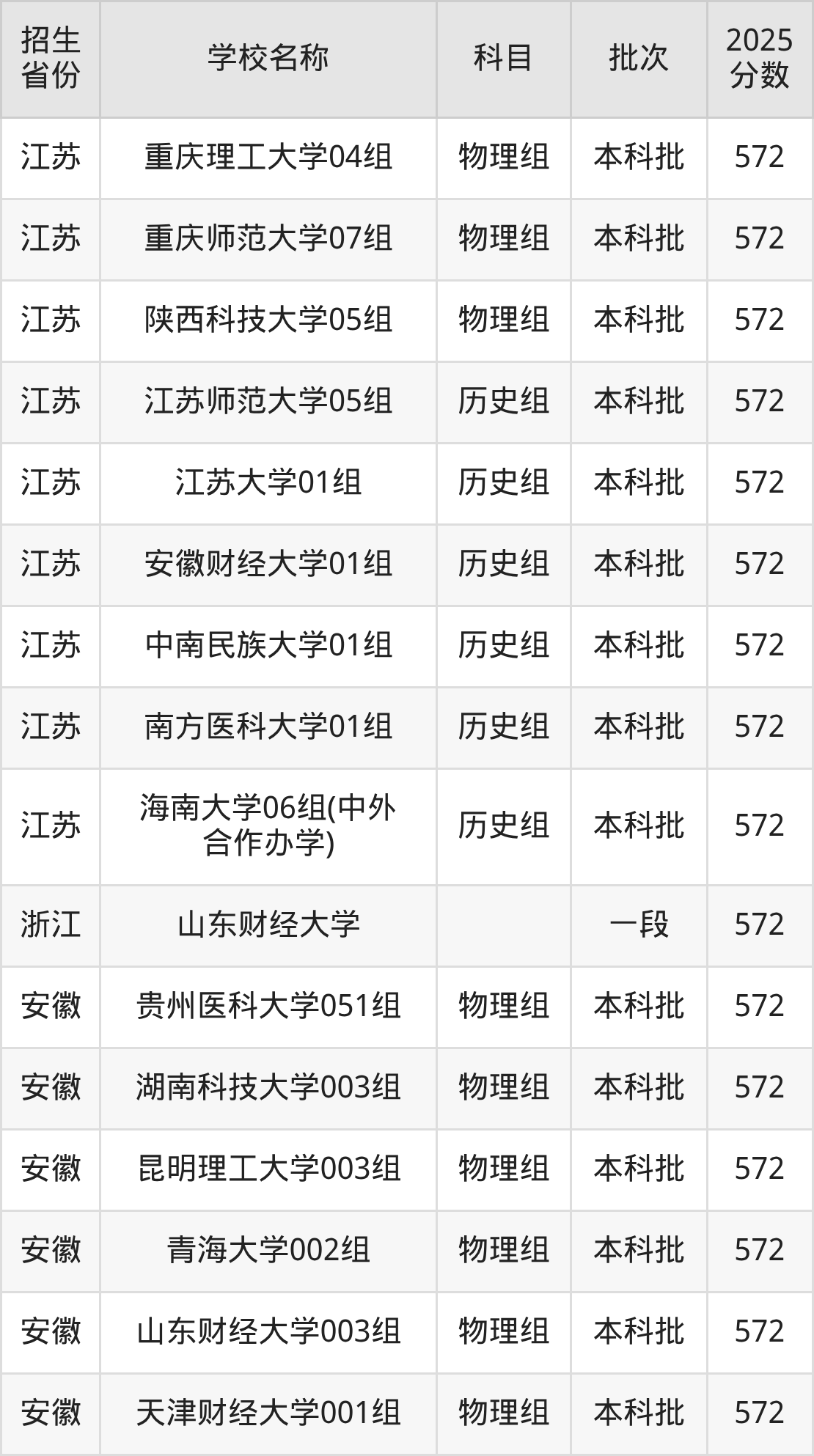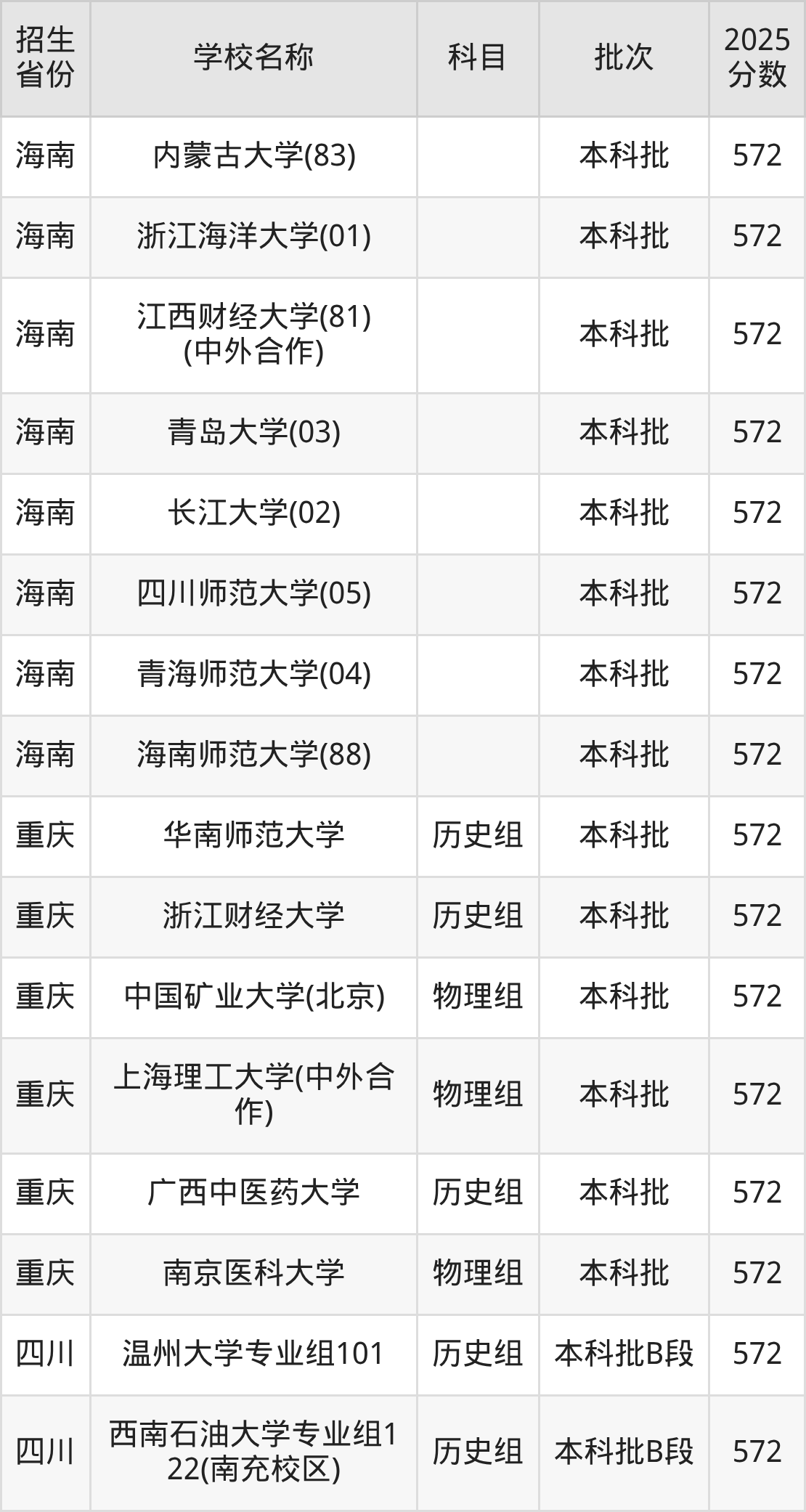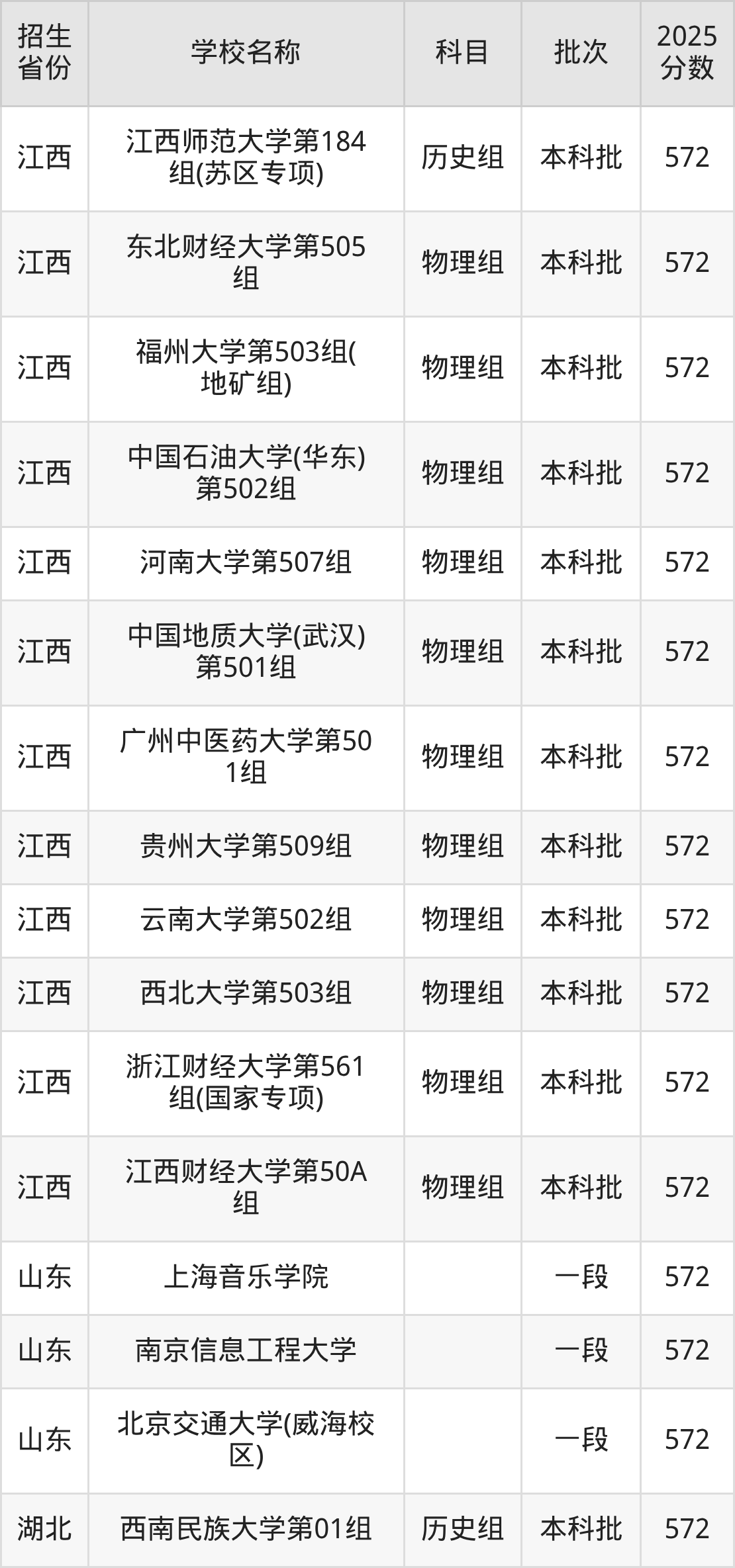筛选全国各省2025年录取分数线为572分的重点大学如下:
