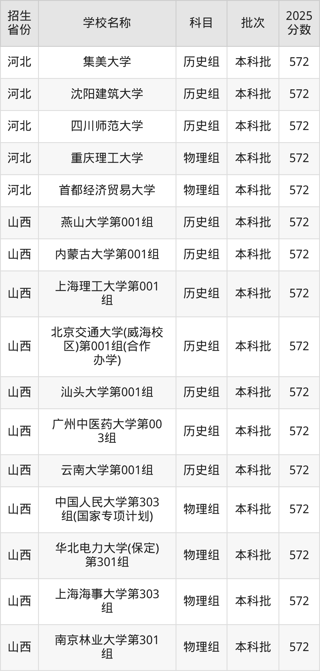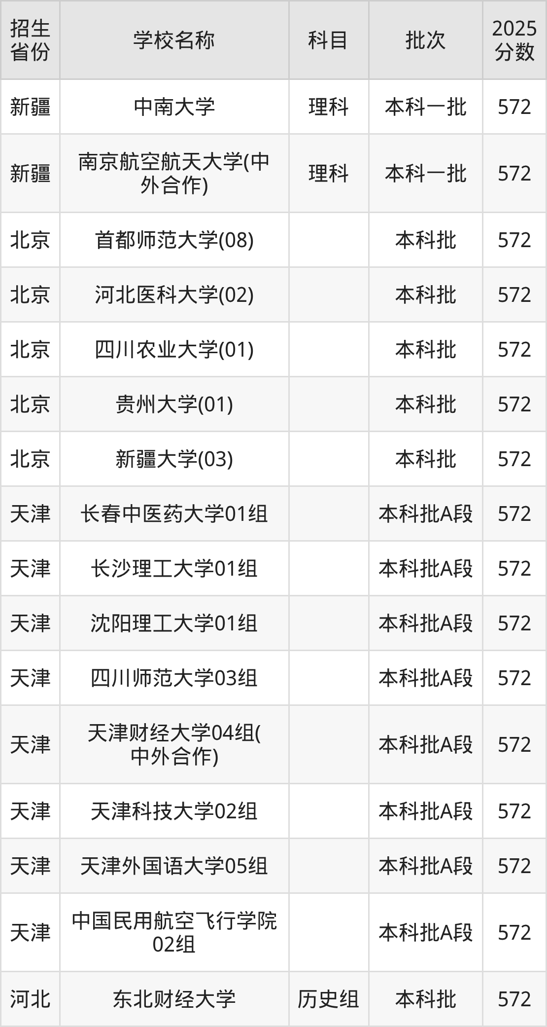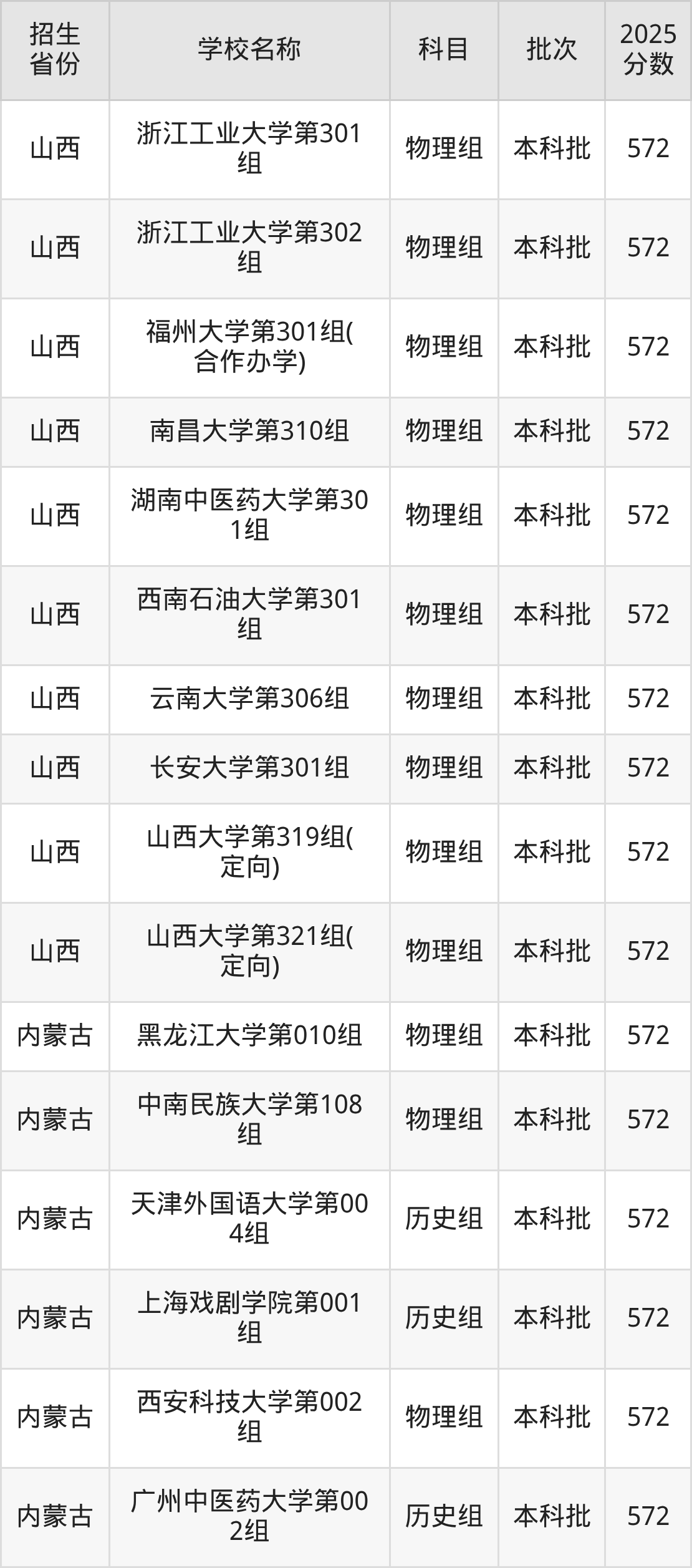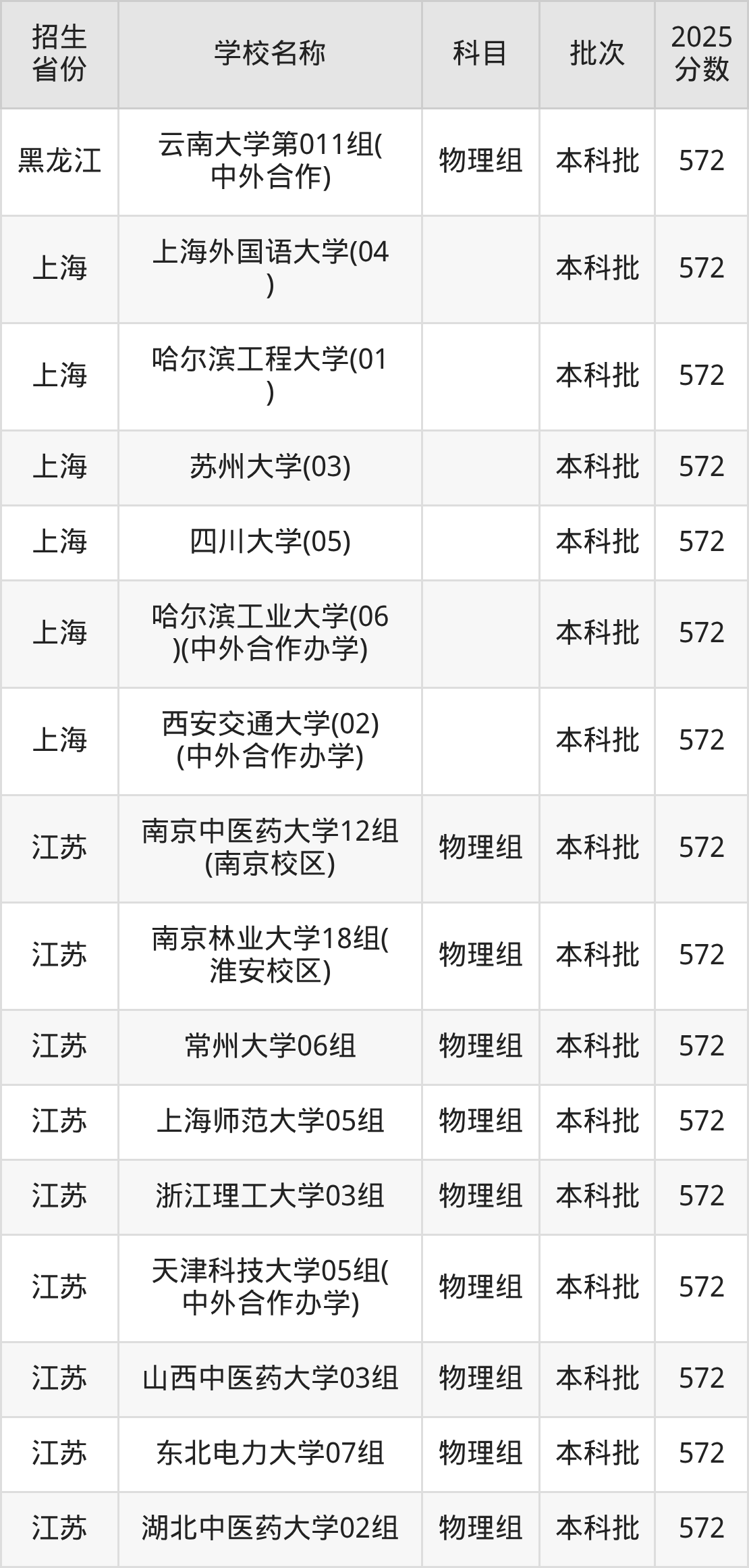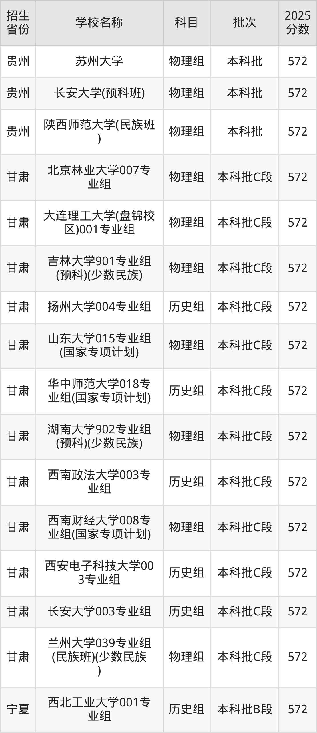 筛选全国各省2025年录取分数线为572分的重点大学如下: