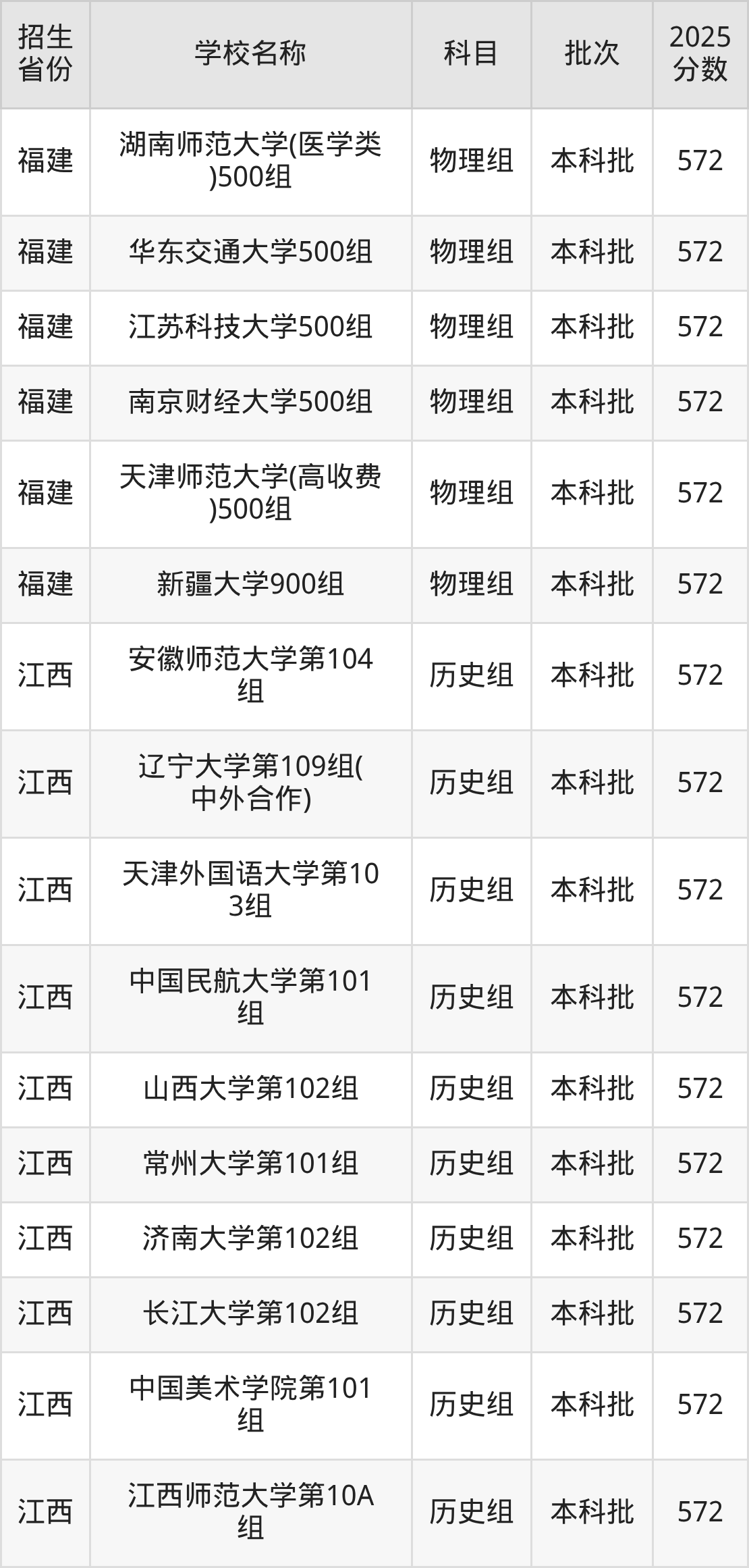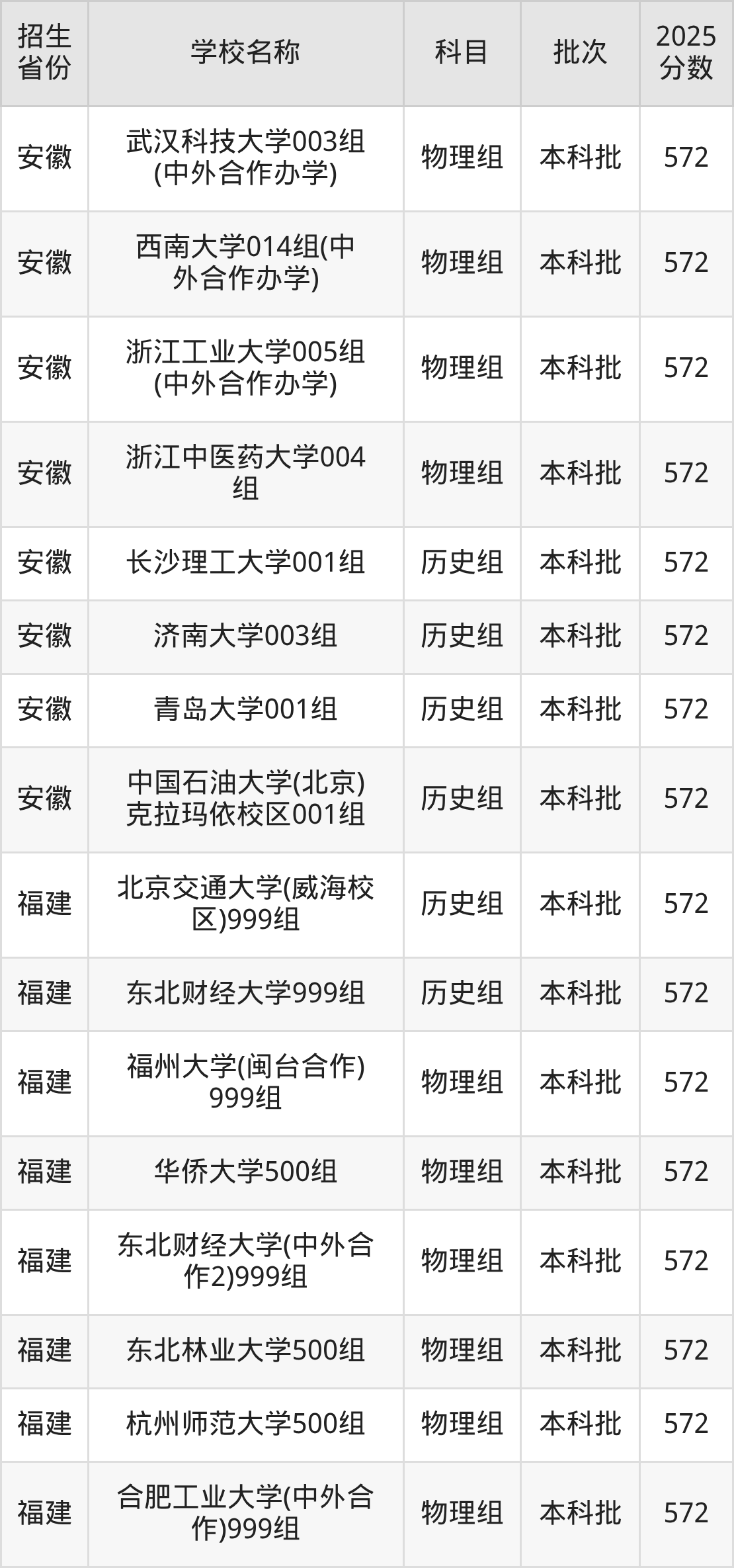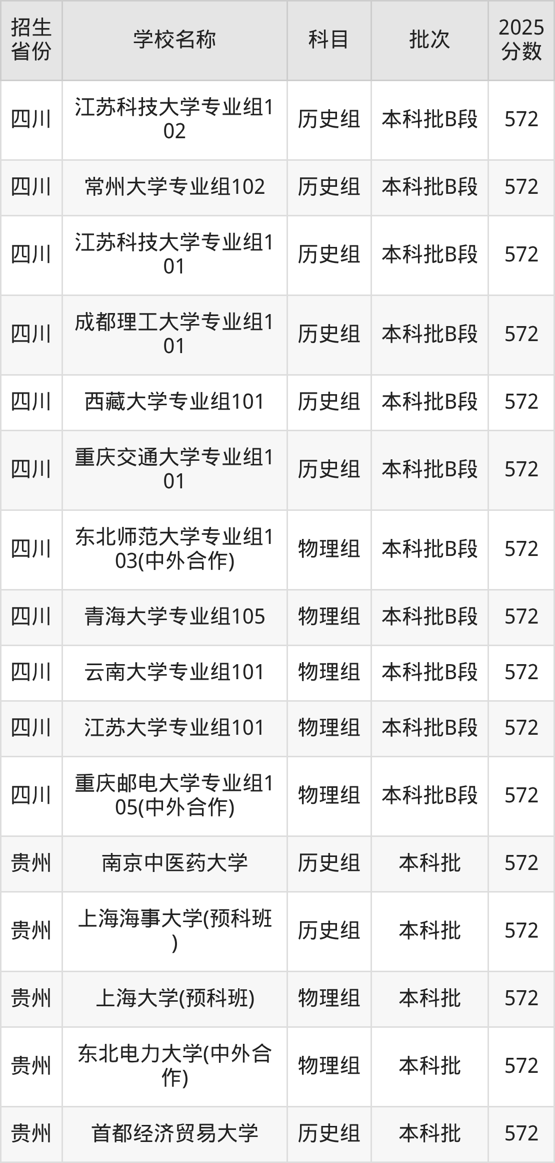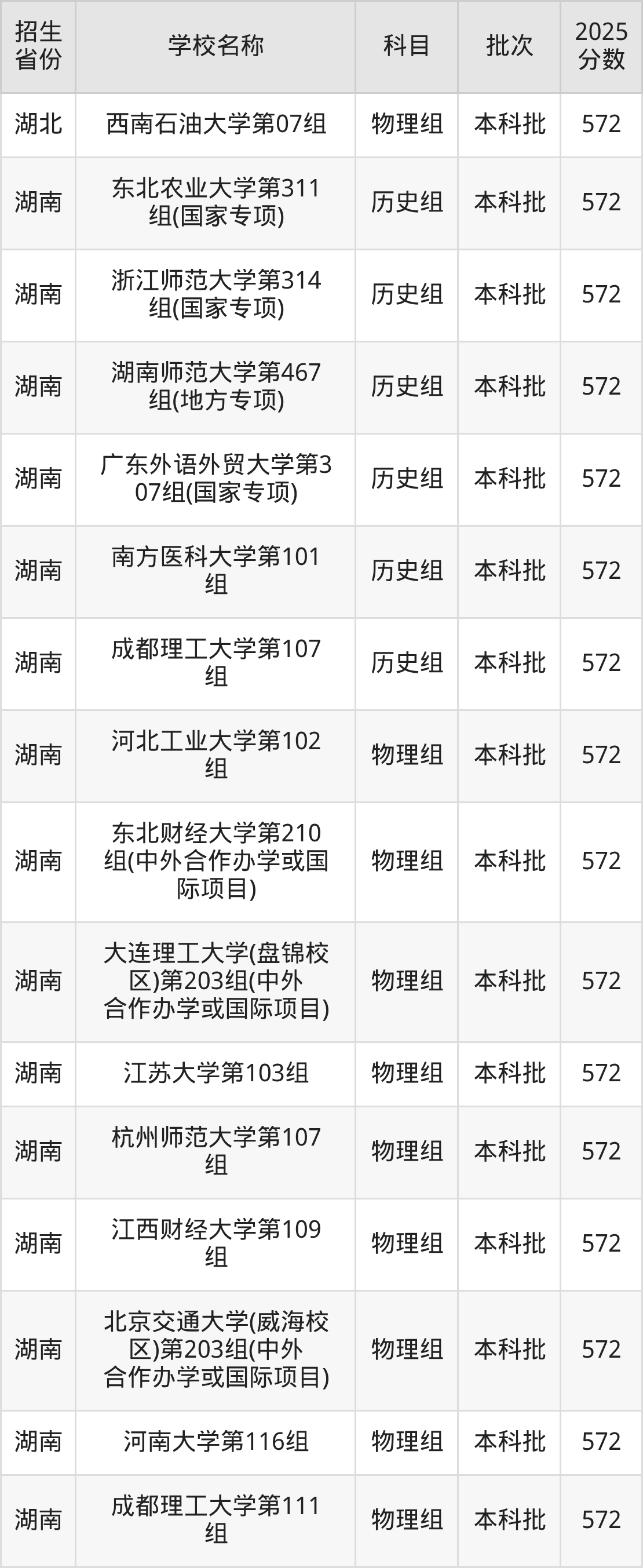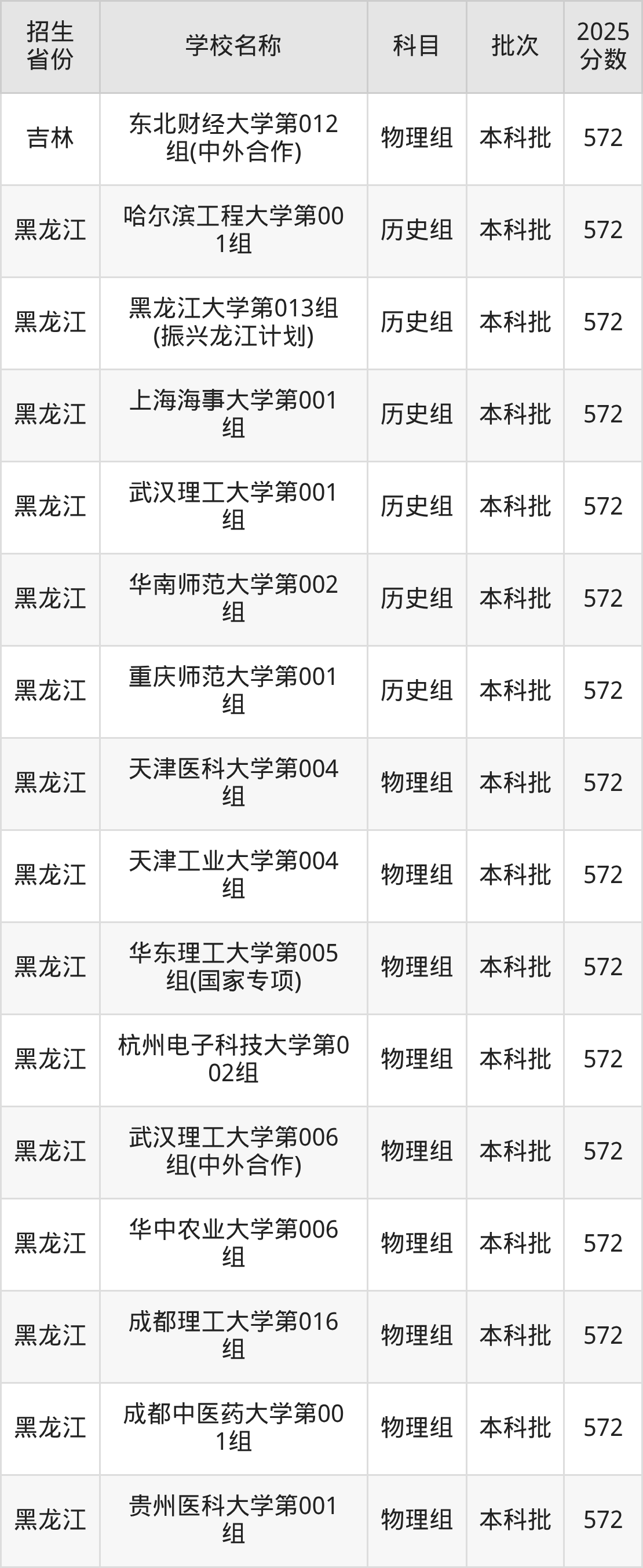 筛选全国各省2025年录取分数线为572分的重点大学如下: