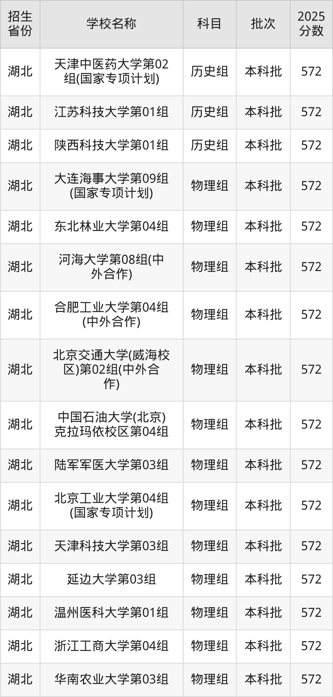 湖北省历史组分数线是572分的重点大学有:西南民族大学、天津中医药大学、江苏科技大学、陕西科技大学。
