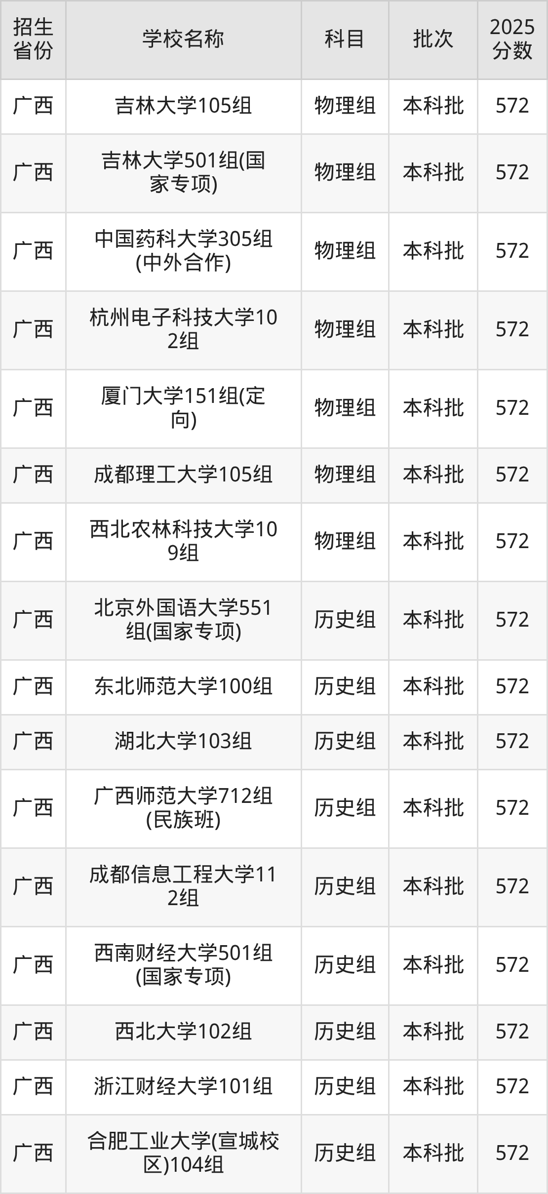 广西壮族自治区历史组分数线是572分的重点大学有:北京外国语大学、东北师范大学、湖北大学、广西师范大学、成都信息工程大学、西南财经大学、西北大学、浙江财经大学、合肥工业大学(宣城校区)。