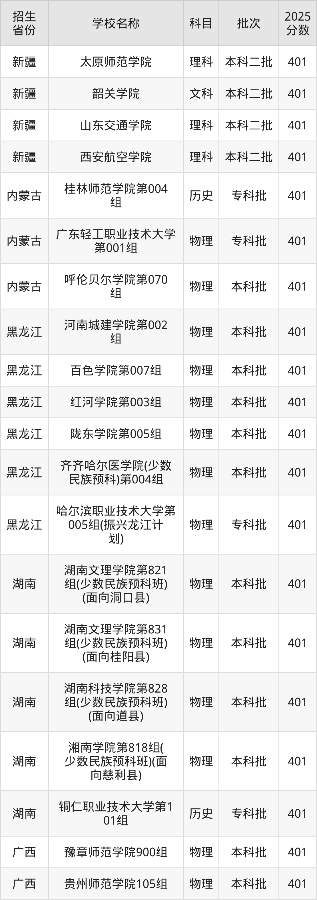 筛选全国各省2025年录取分数线为401分的二本公办大学如下: