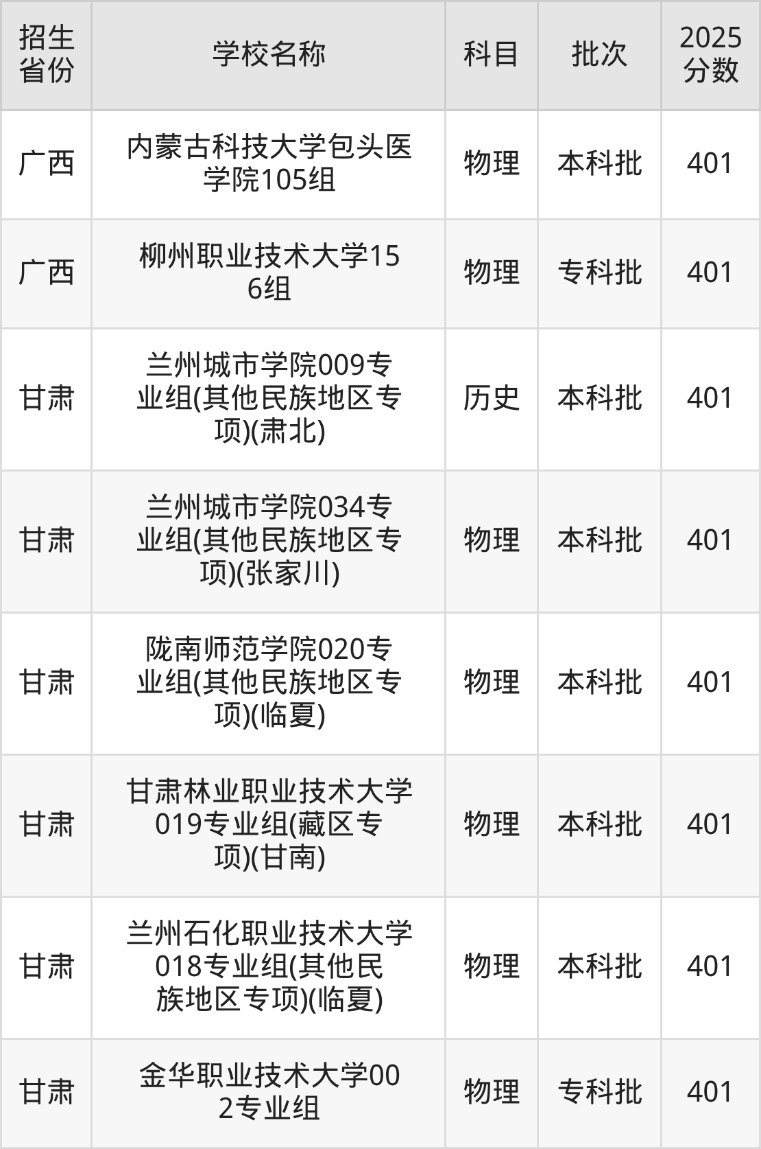 甘肃省物理组分数线是401分的二本公办大学有:兰州城市学院、陇南师范学院、甘肃林业职业技术大学、兰州石化职业技术大学、金华职业技术大学。