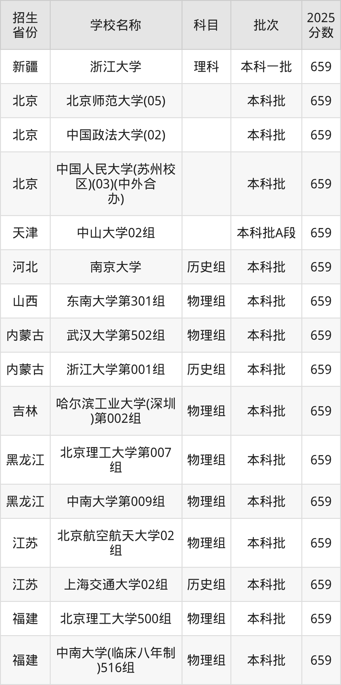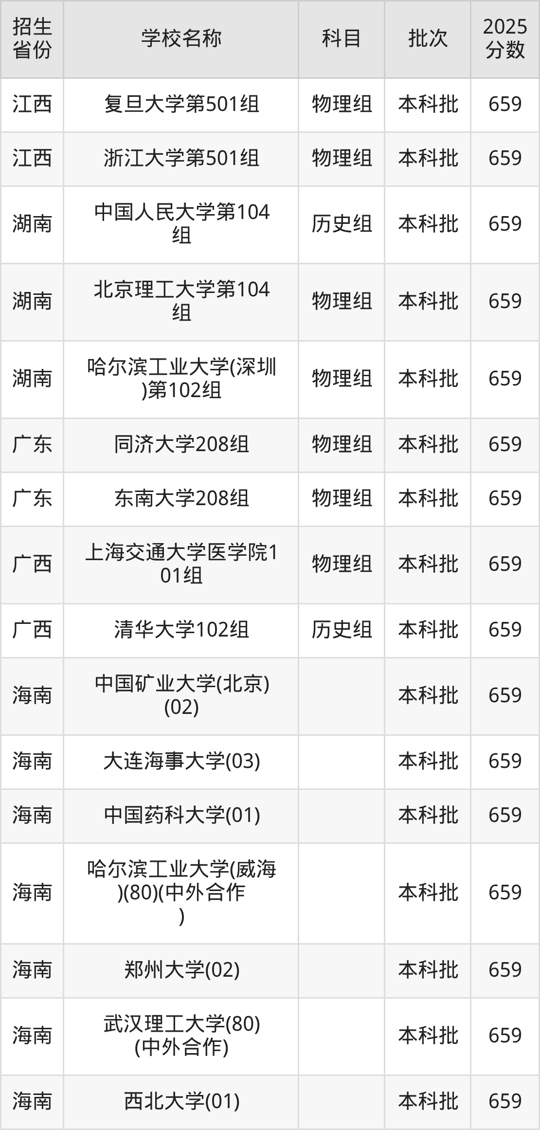 筛选全国各省2025年录取分数线为659分的211大学如下: