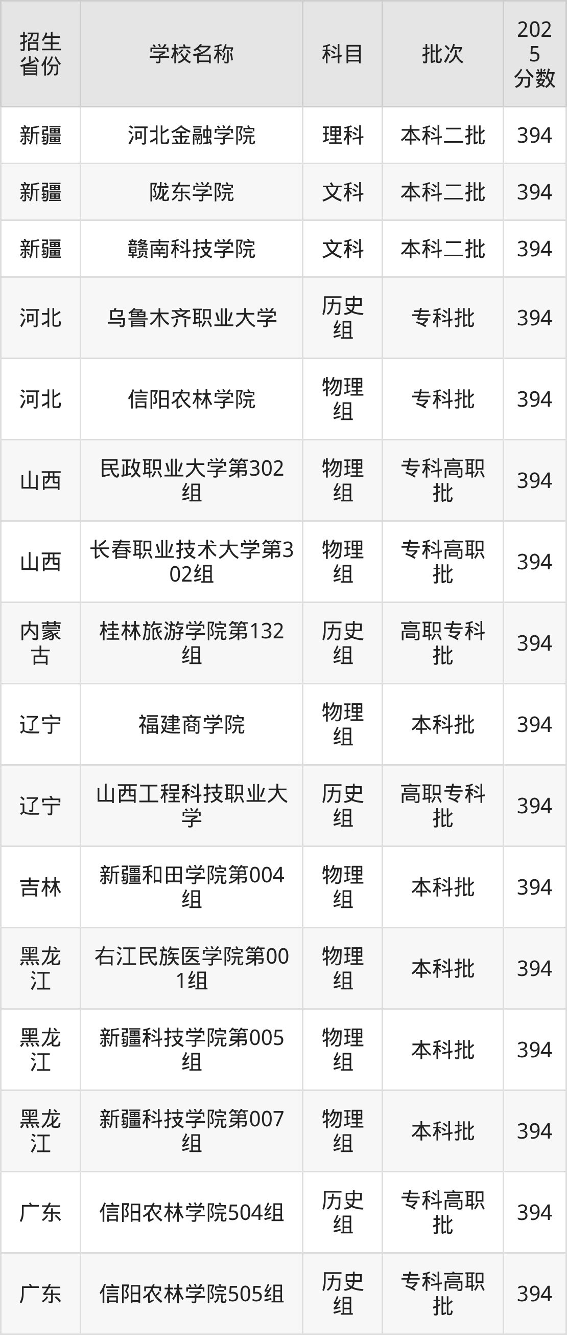 筛选全国各省2025年录取分数线为394分的二本公办大学如下: