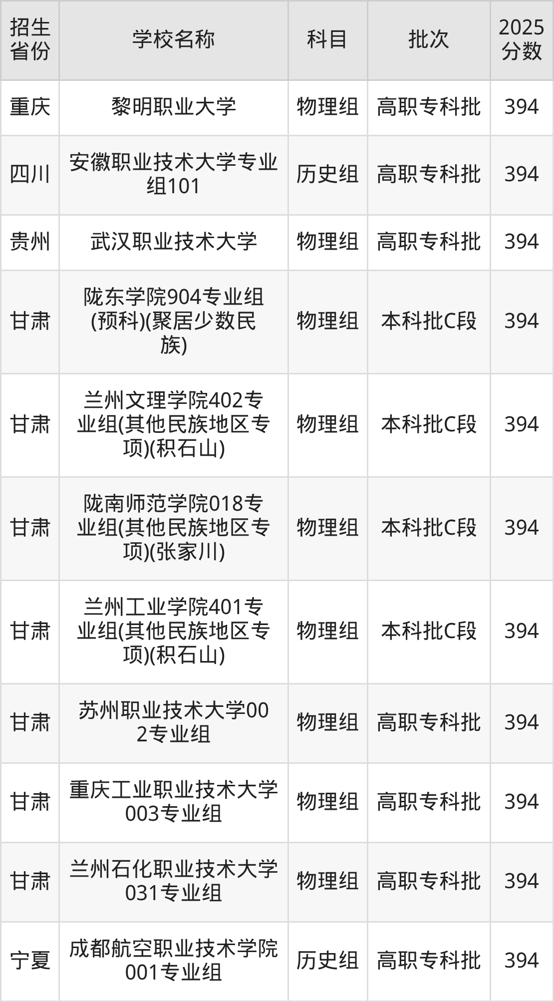 甘肃省物理组分数线是394分的二本公办大学有:陇东学院、兰州文理学院、陇南师范学院、兰州工业学院、苏州职业技术大学、重庆工业职业技术大学、兰州石化职业技术大学。