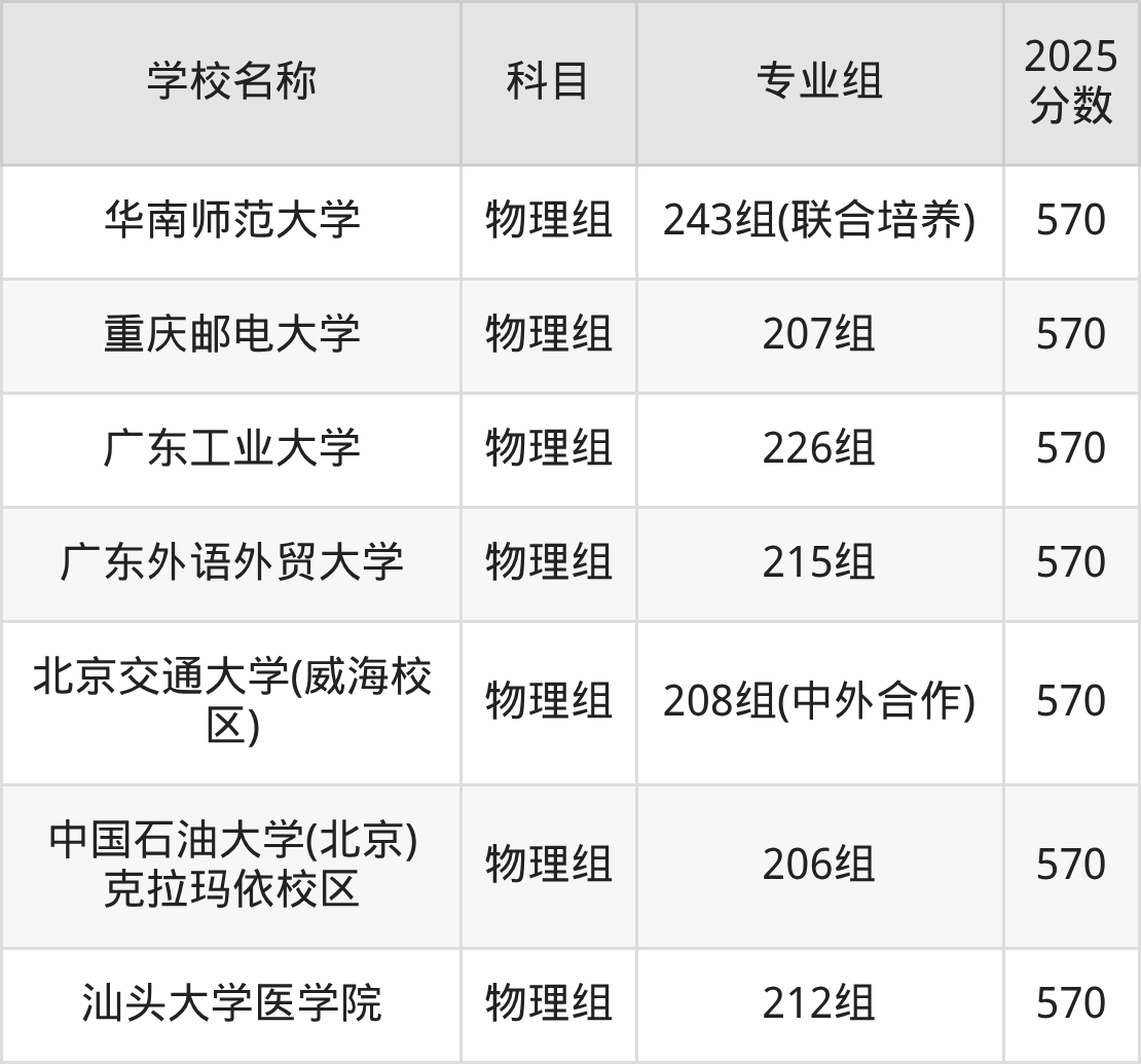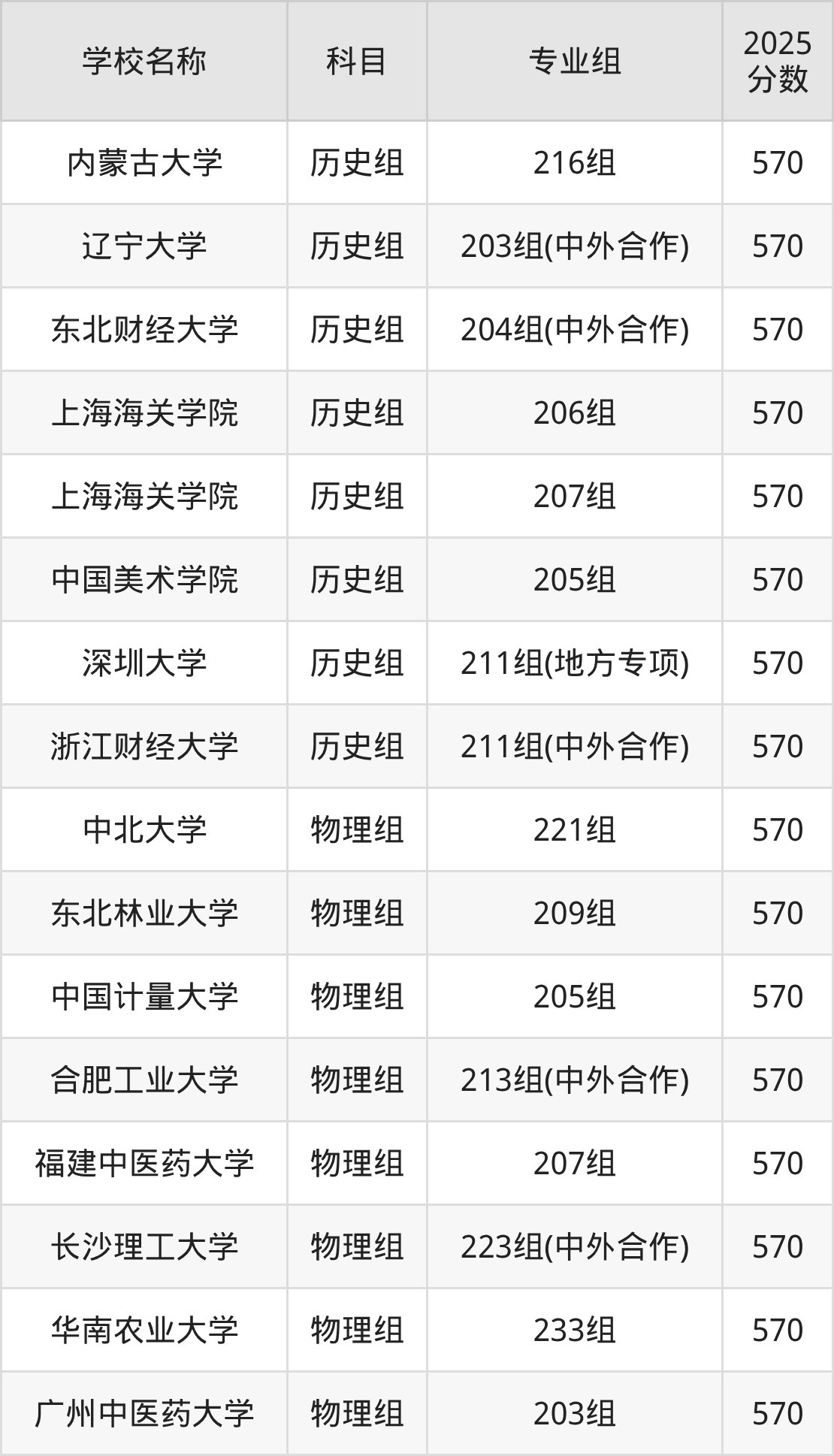 广东高考录取分数线在570分左右的公办院校专业组一共有23个,其中历史组有:内蒙古大学(570分)、辽宁大学(570分)、东北财经大学(570分),物理组有:中北大学(570分)、东北林业大学(570分)、中国计量大学(570分)。