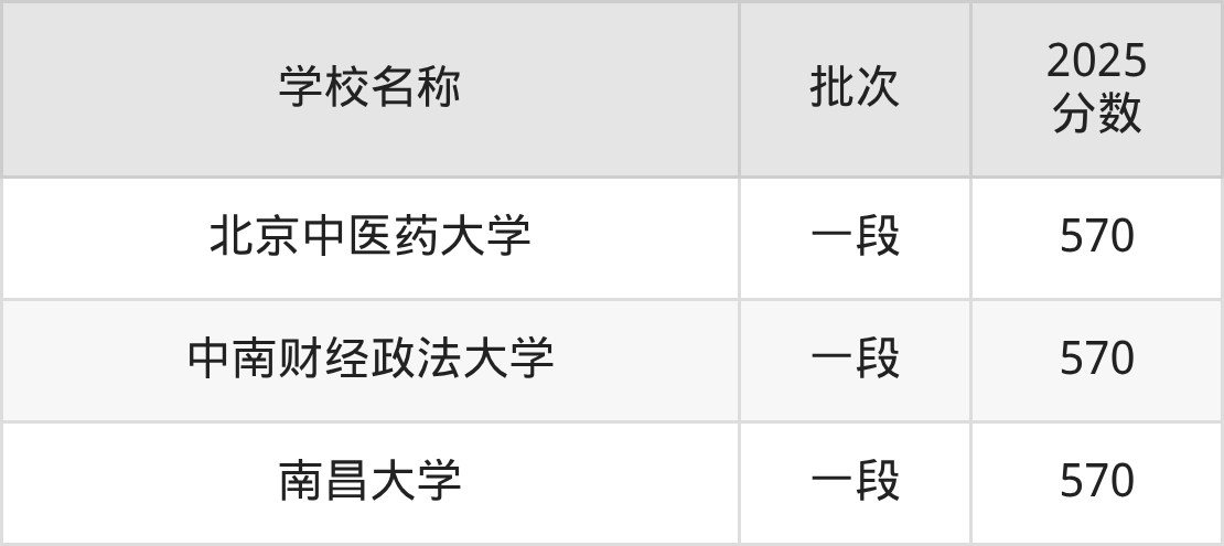 山东高考录取分数线在570分左右的公办大学一共有3所。分别是北京中医药大学(570分)、中南财经政法大学(570分)、南昌大学(570分)
