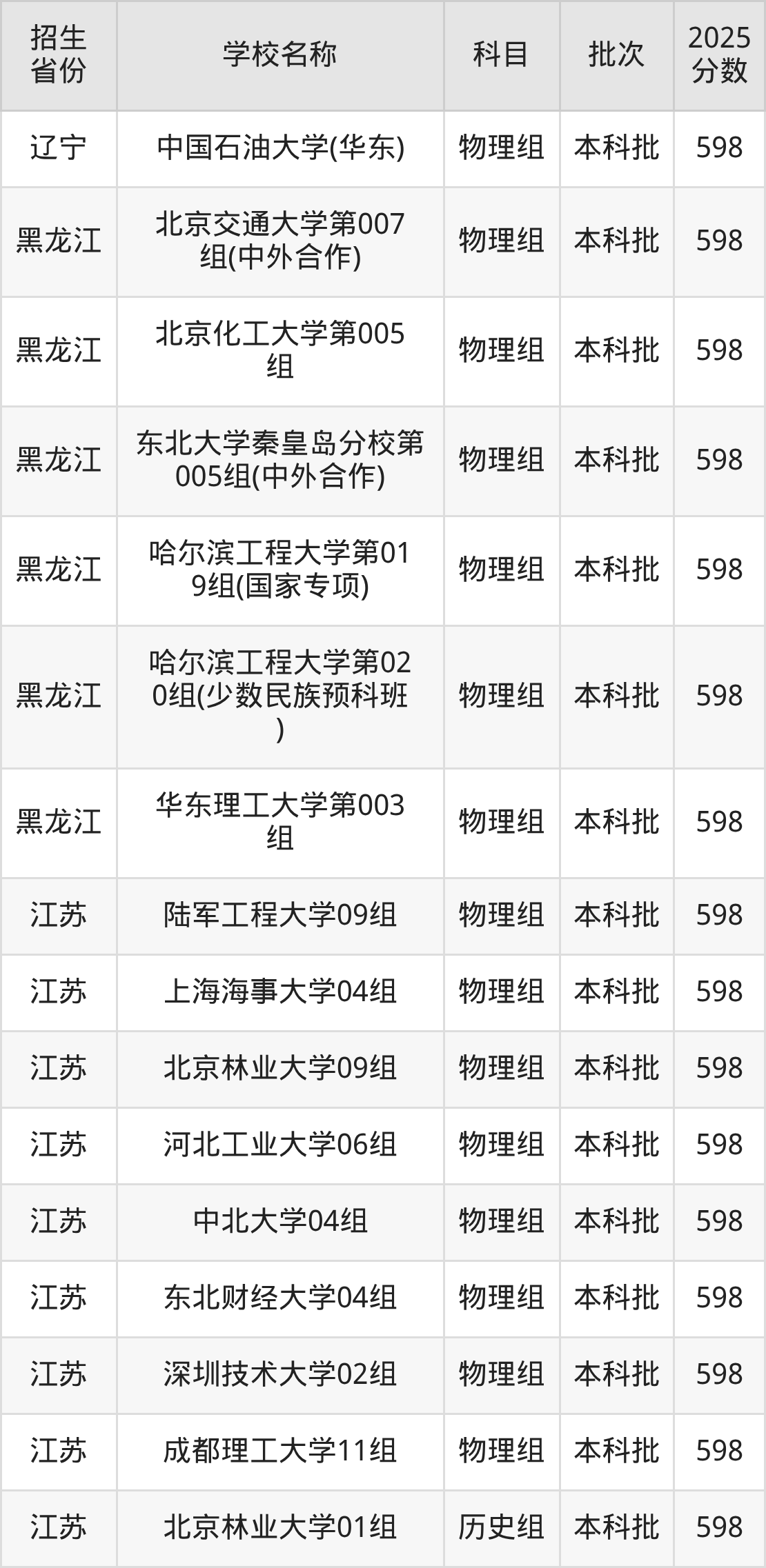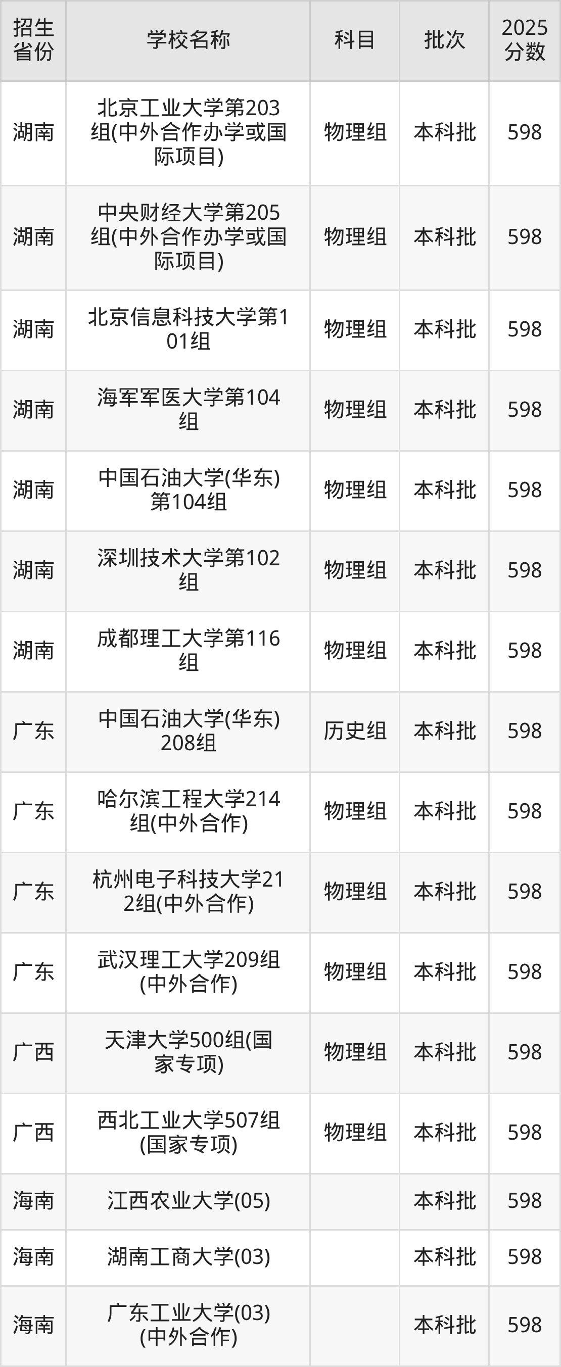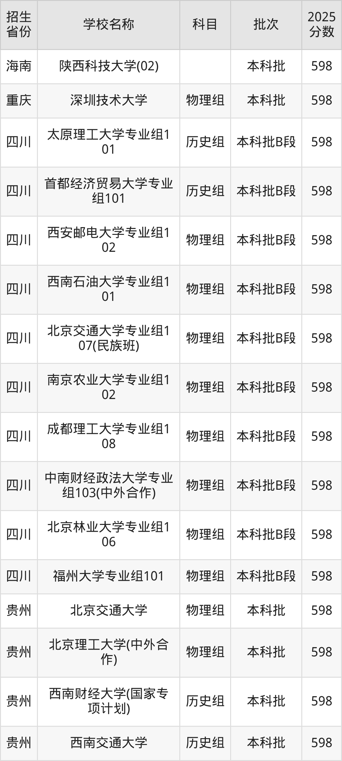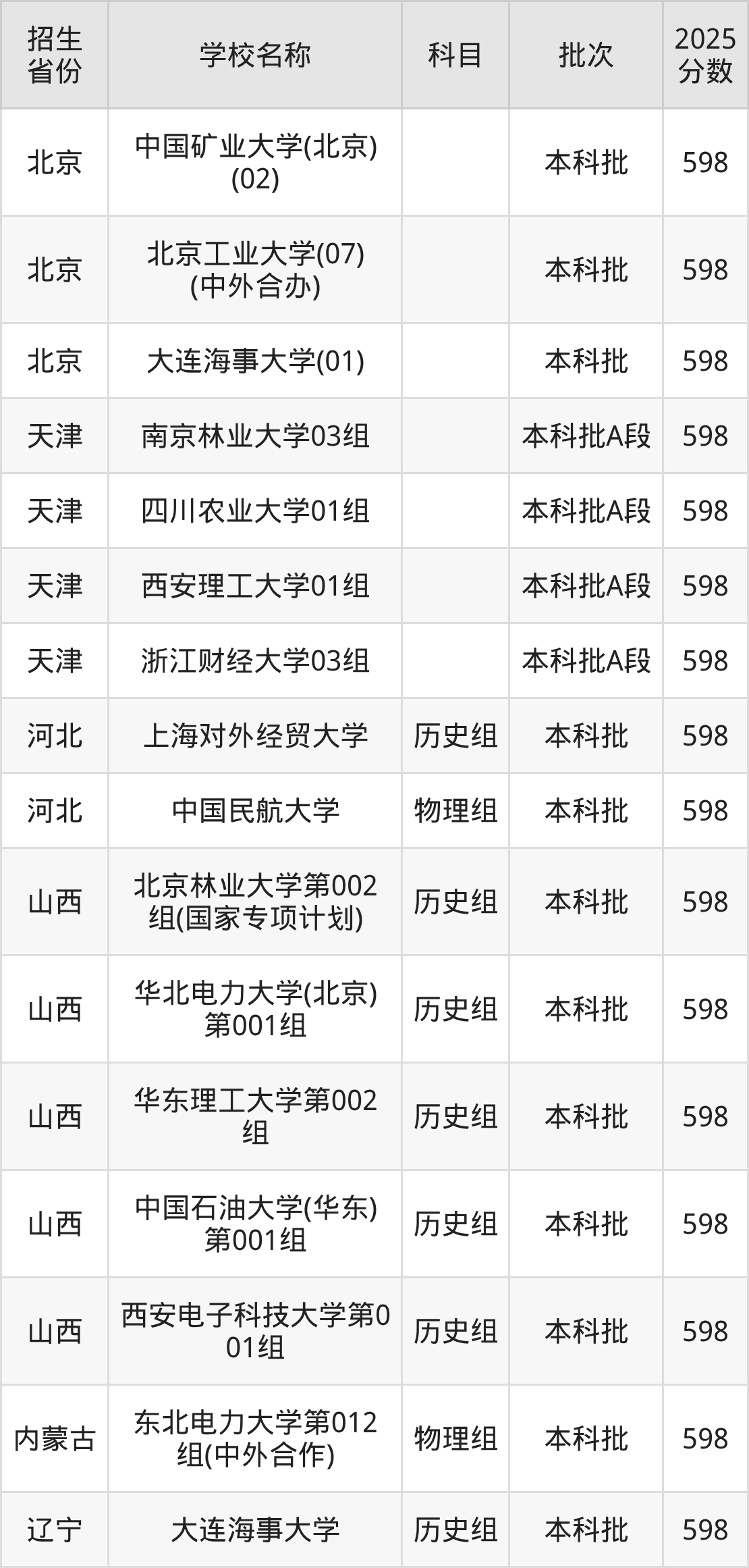 筛选全国各省2025年录取分数线为598分的理科大学如下: