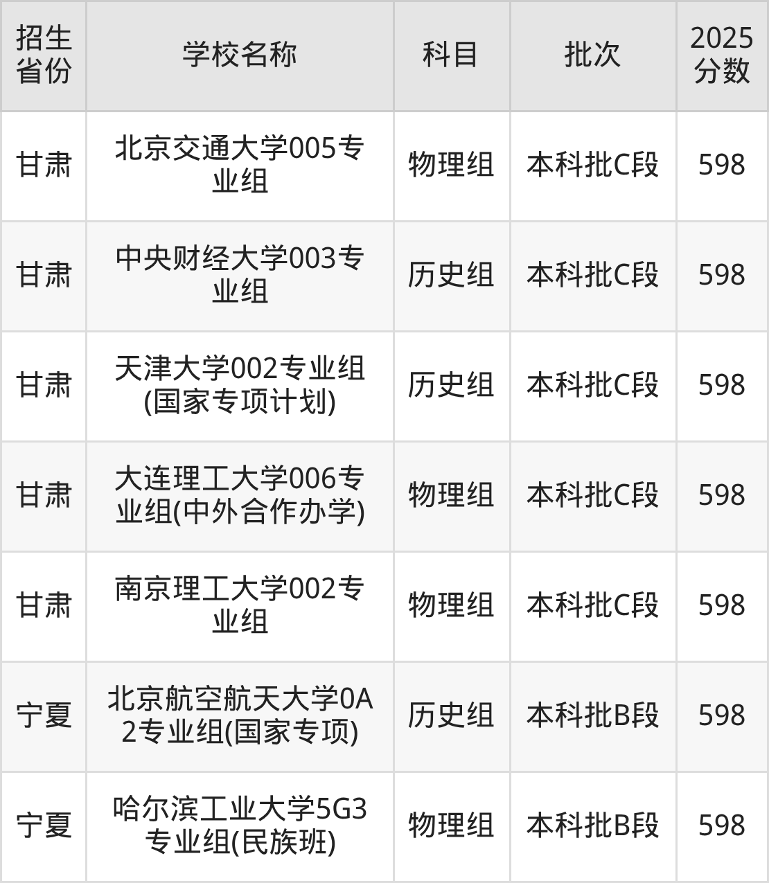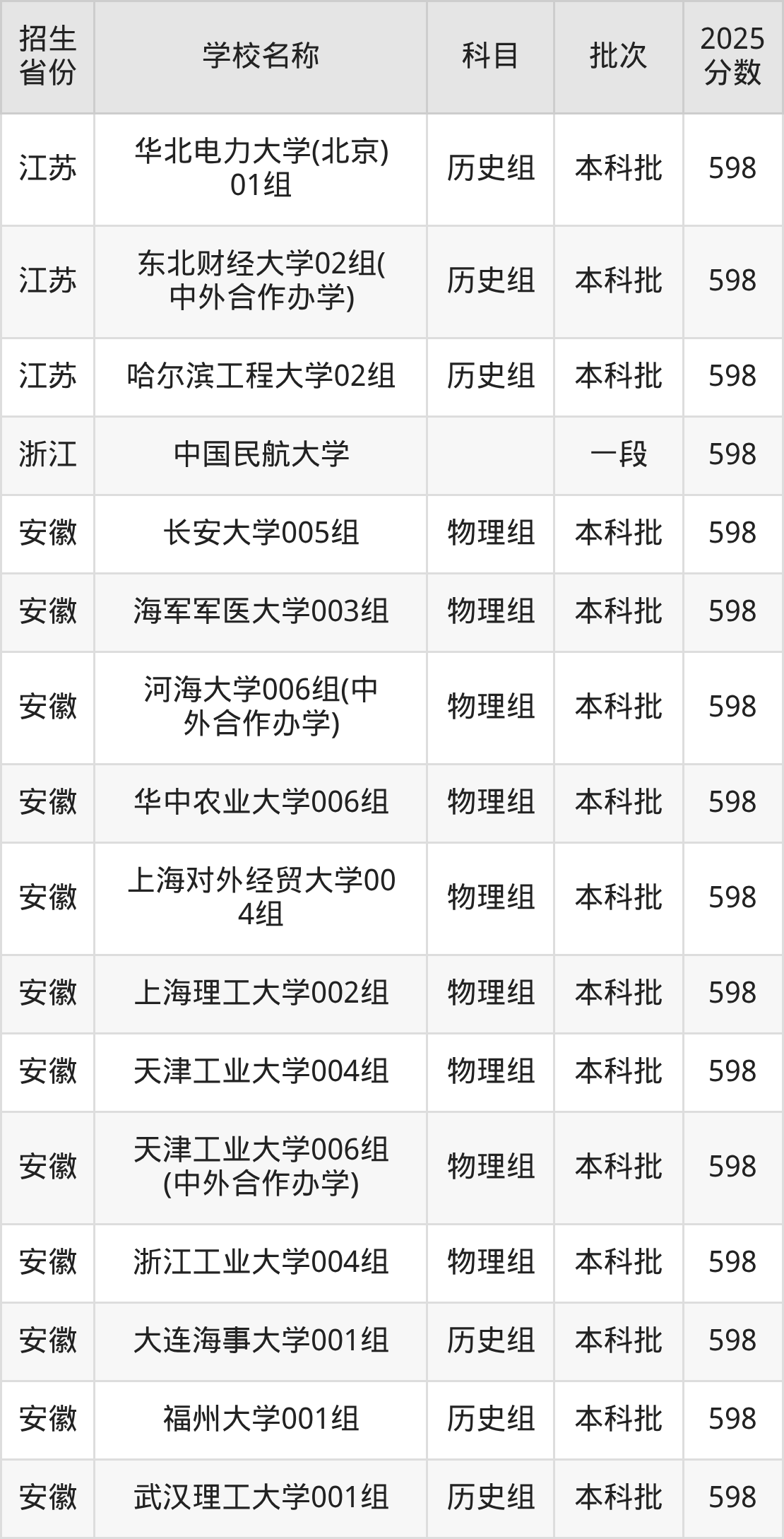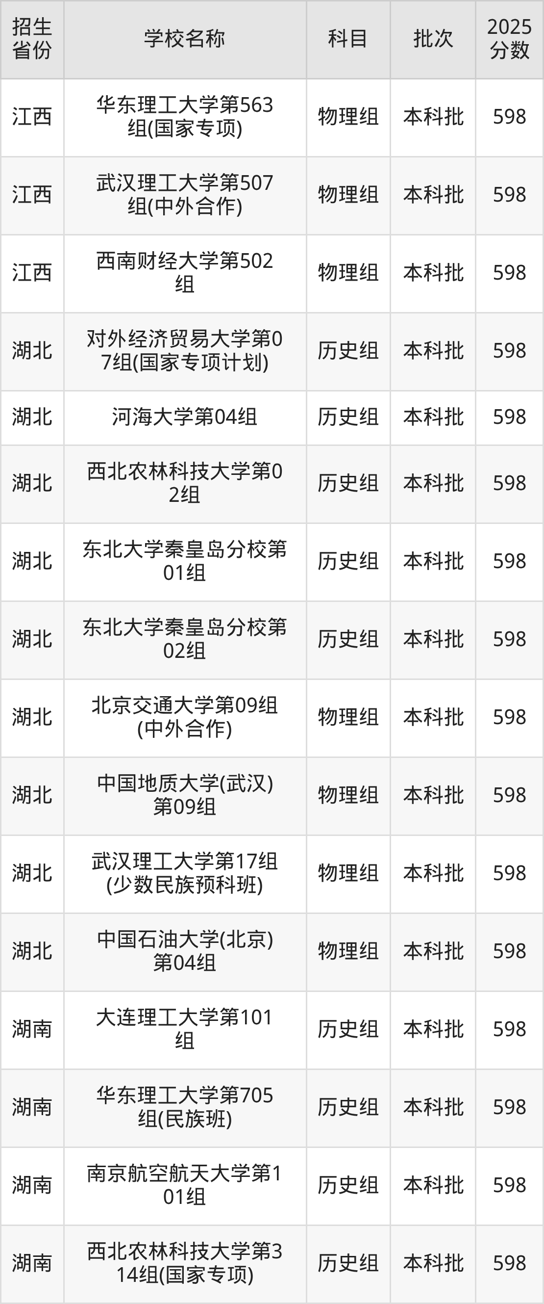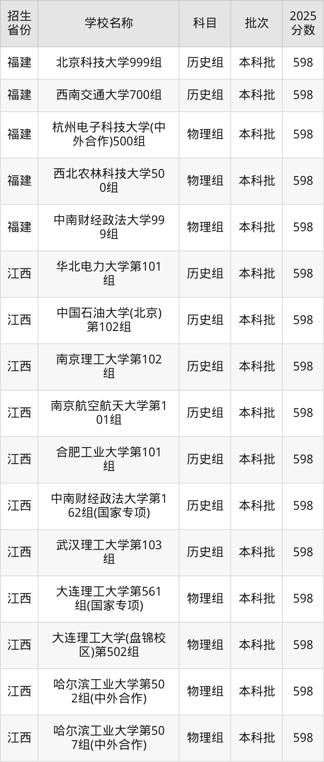 筛选全国各省2025年录取分数线为598分的理科大学如下: