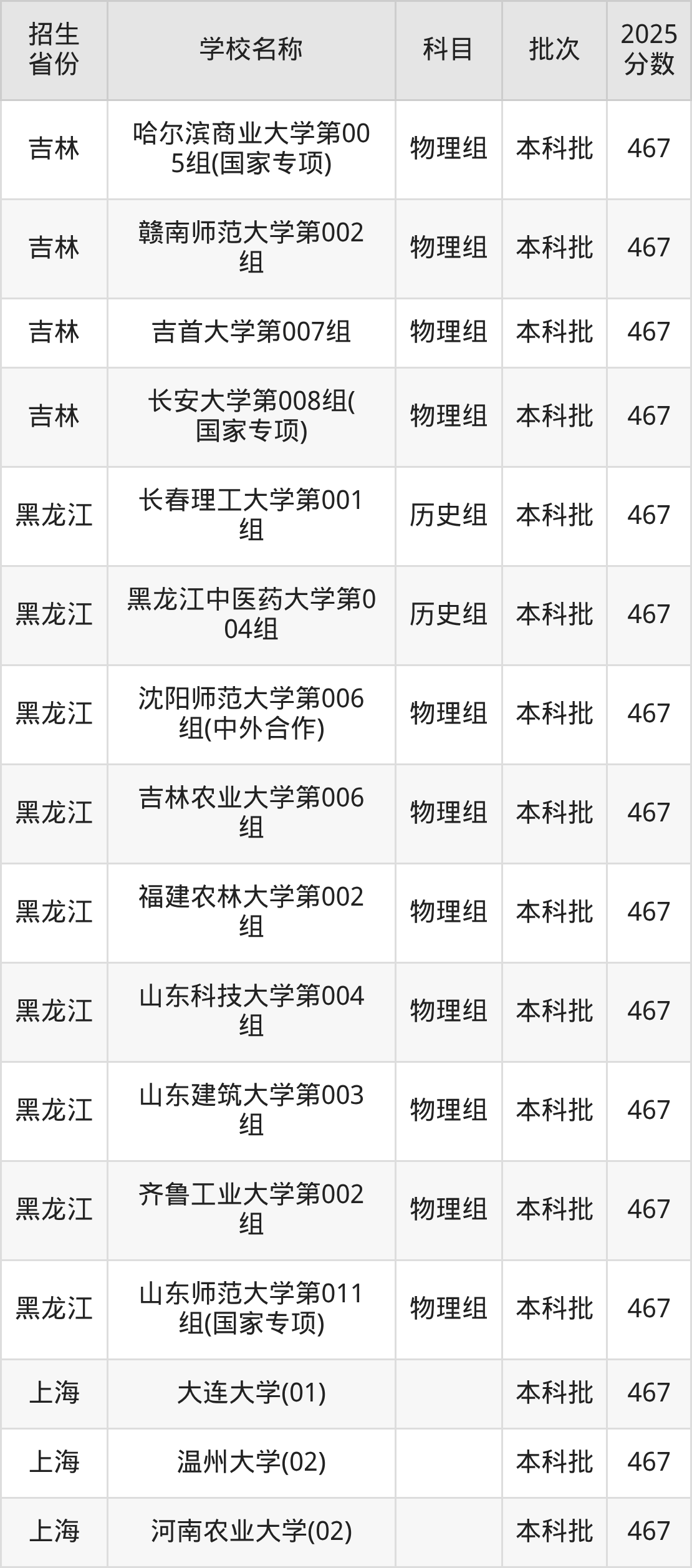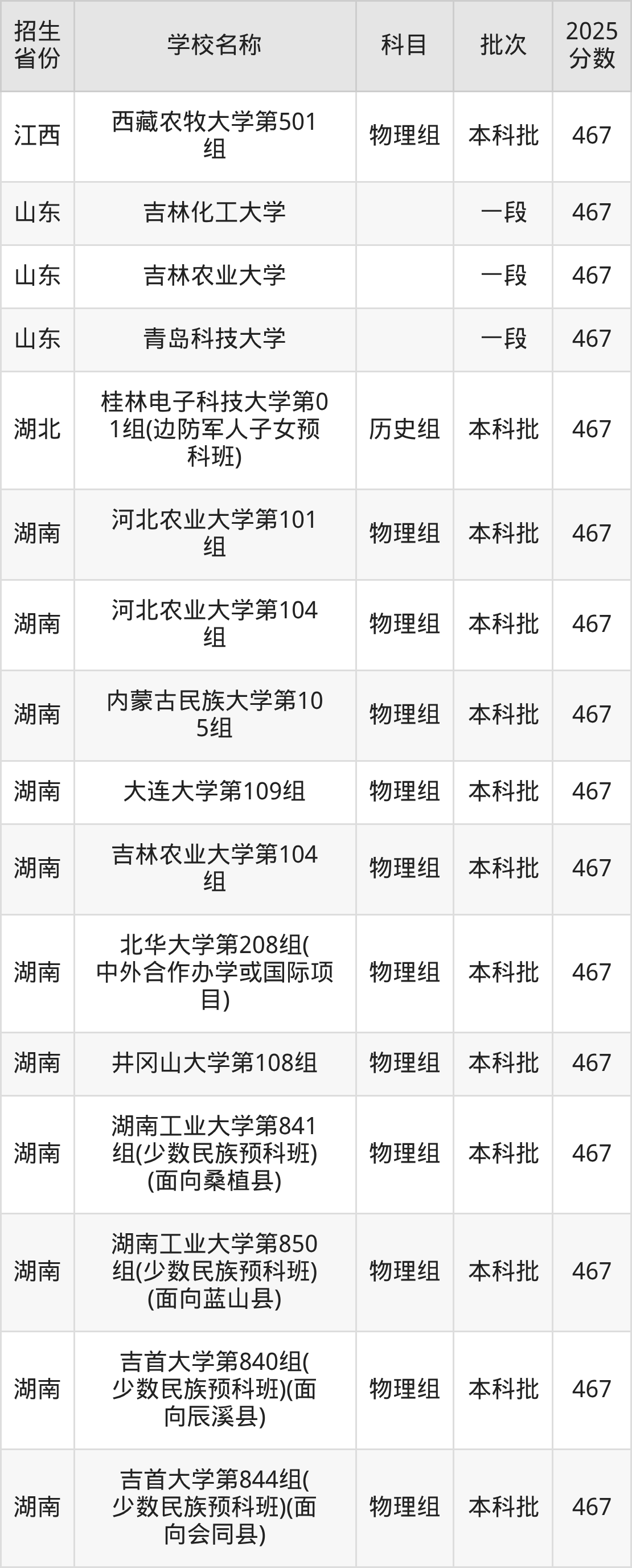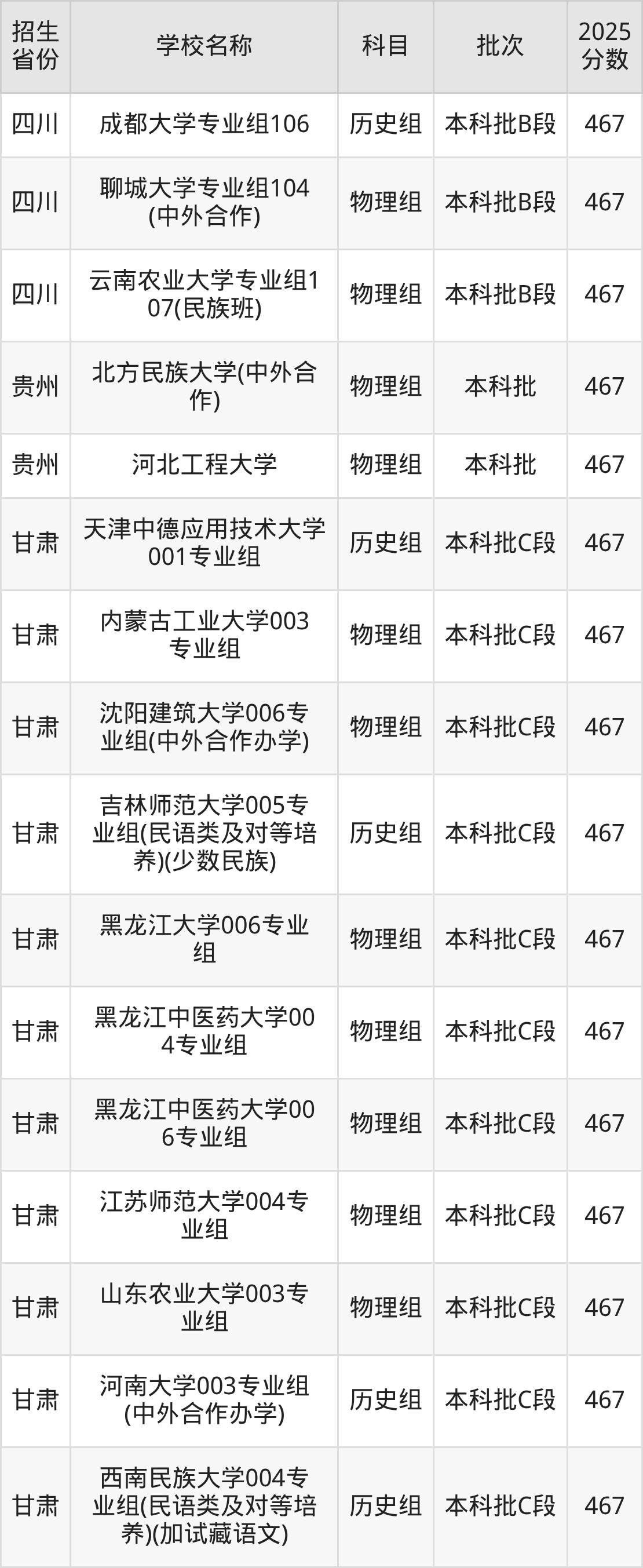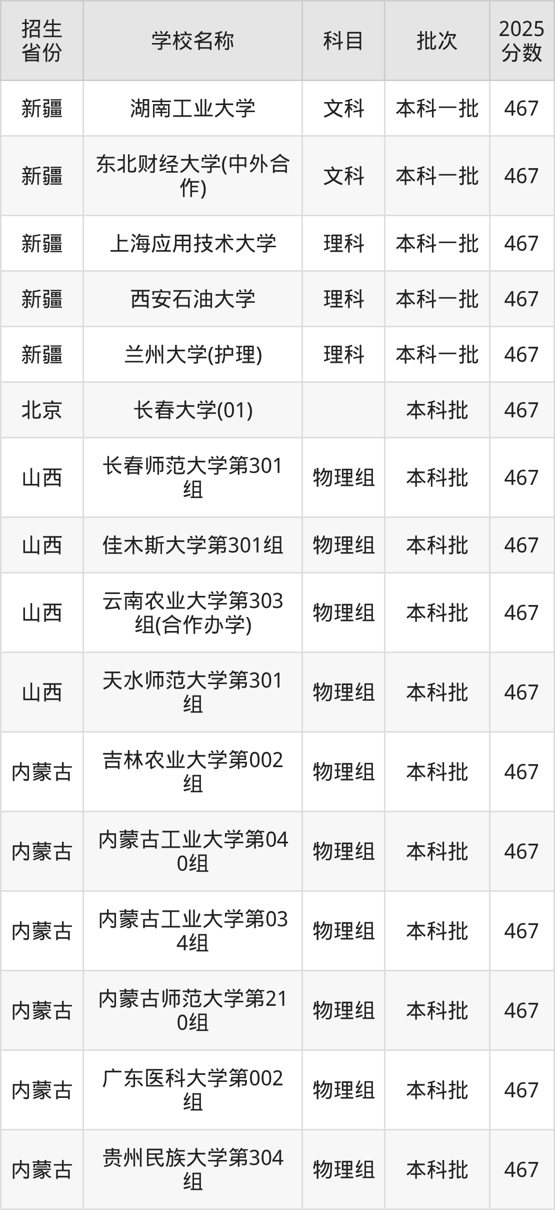 筛选全国各省2025年录取分数线为467分的一本大学如下: