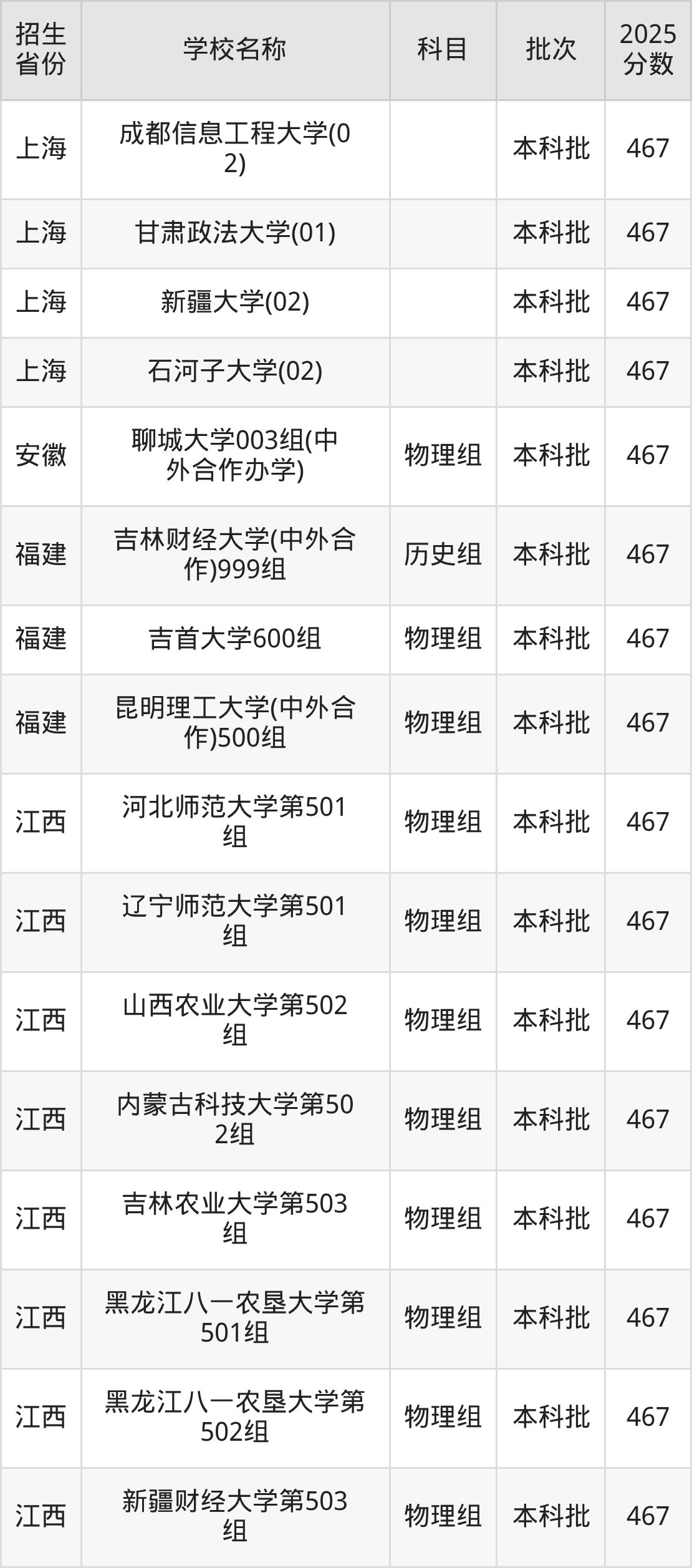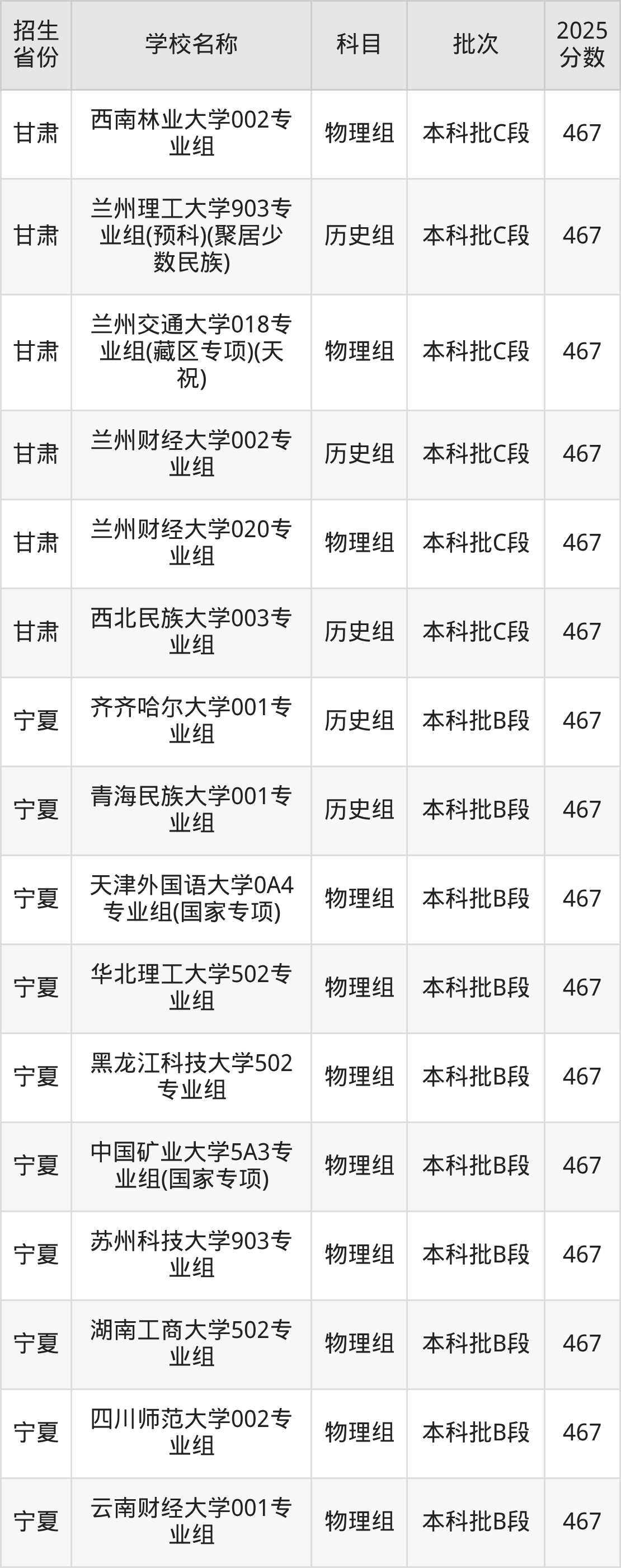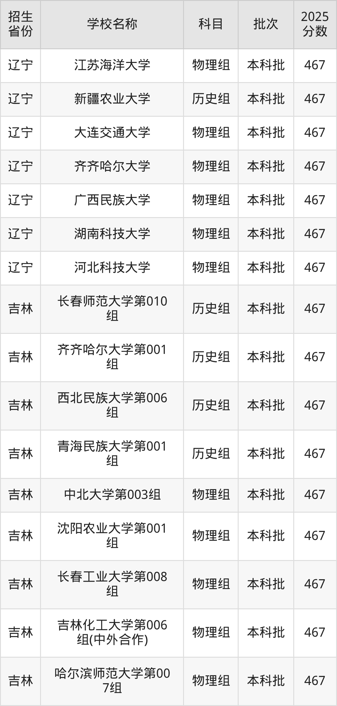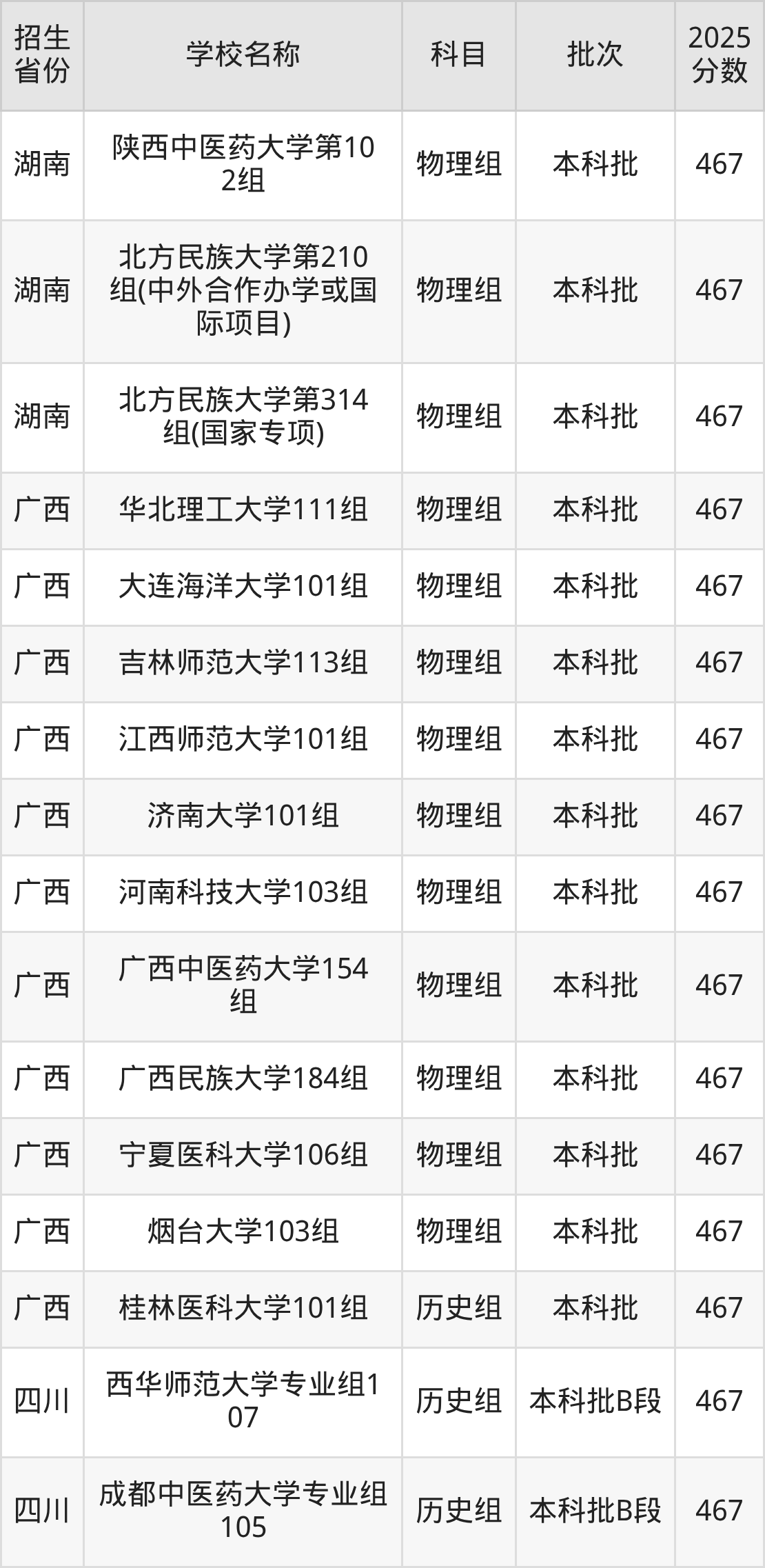 筛选全国各省2025年录取分数线为467分的一本大学如下: