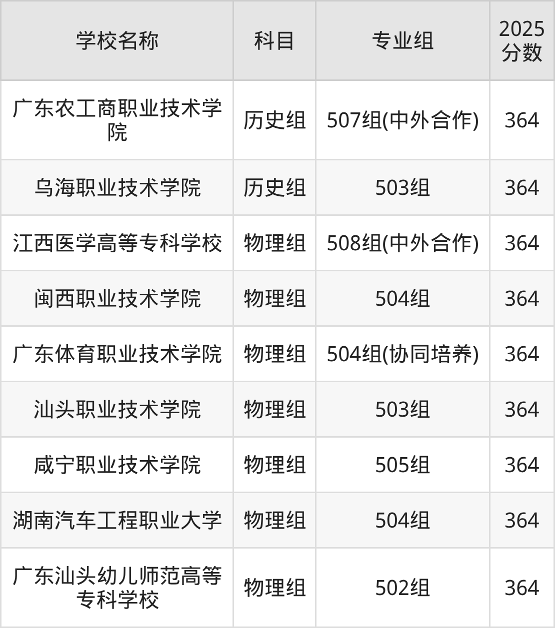 广东高考录取分数线在364分左右的公办院校专业组一共有9个,其中历史组有:广东农工商职业技术学院(364分)、乌海职业技术学院(364分),物理组有:江西医学高等专科学校(364分)、闽西职业技术学院(364分)、广东体育职业技术学院(364分)。