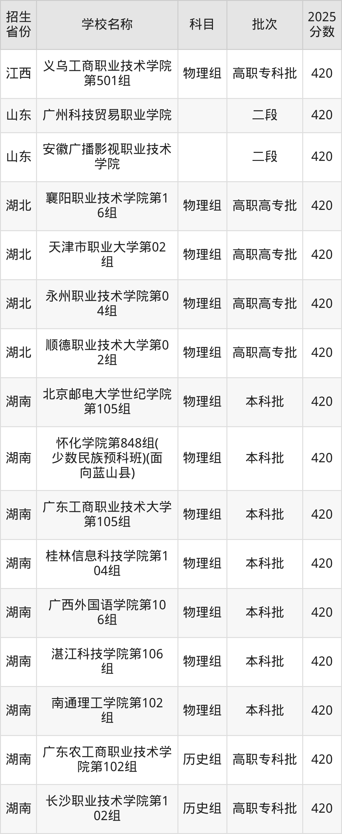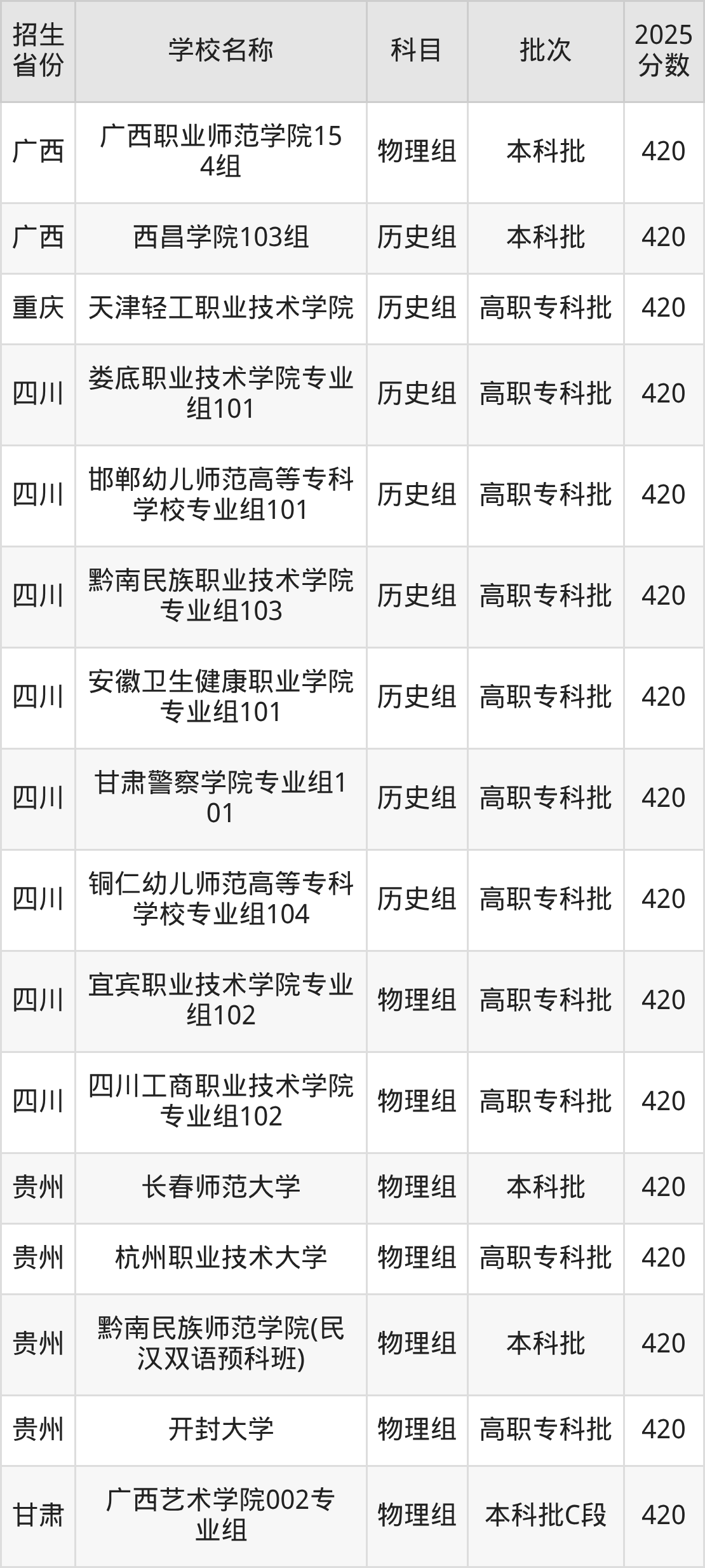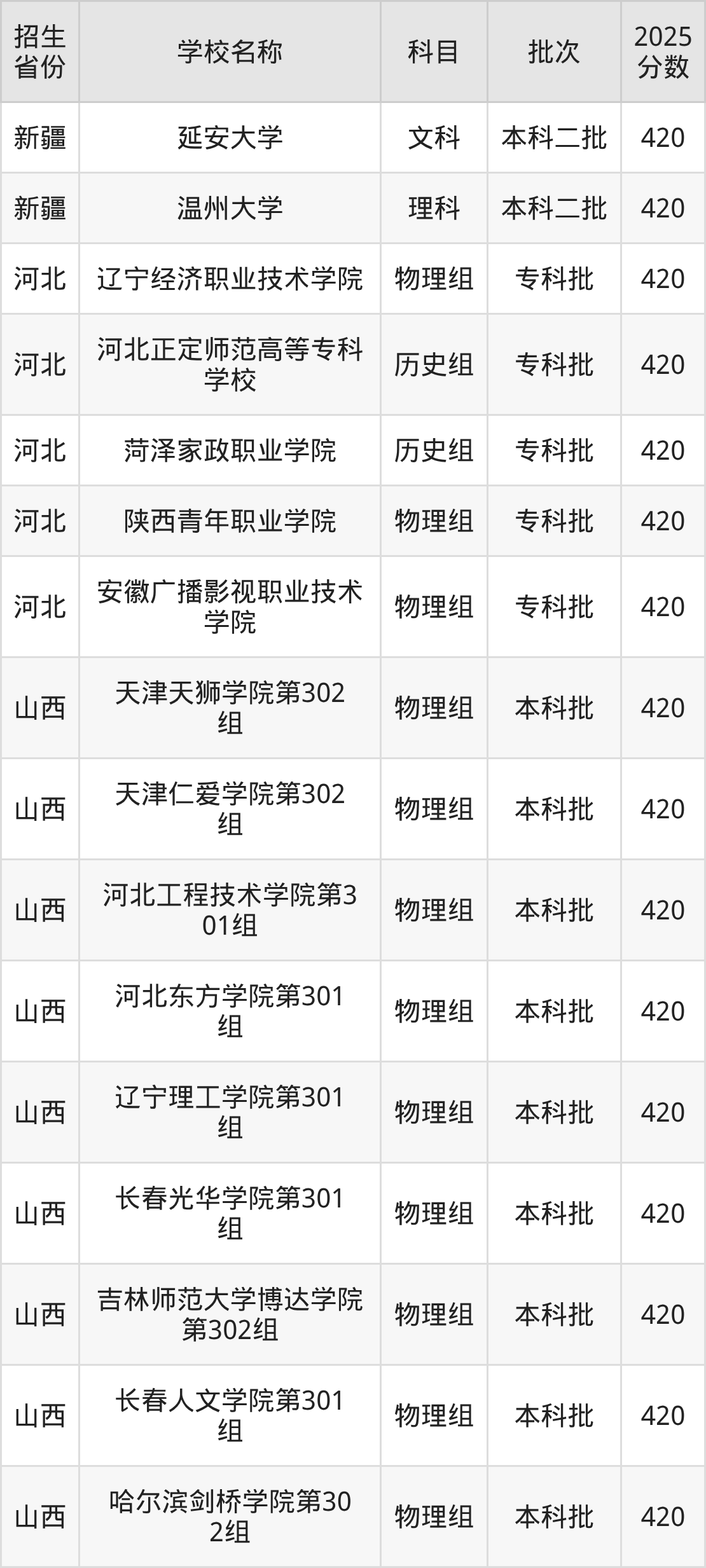 筛选全国各省2025年录取分数线为420分的文科大学如下: