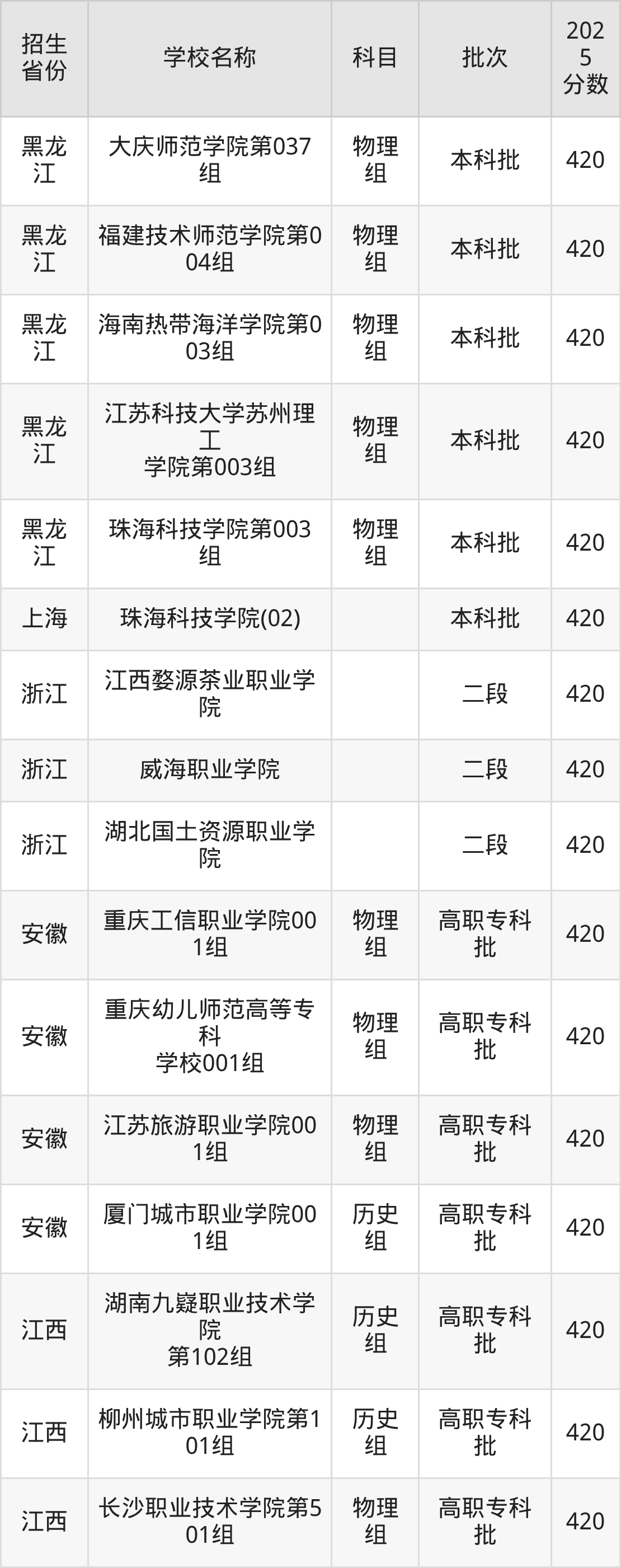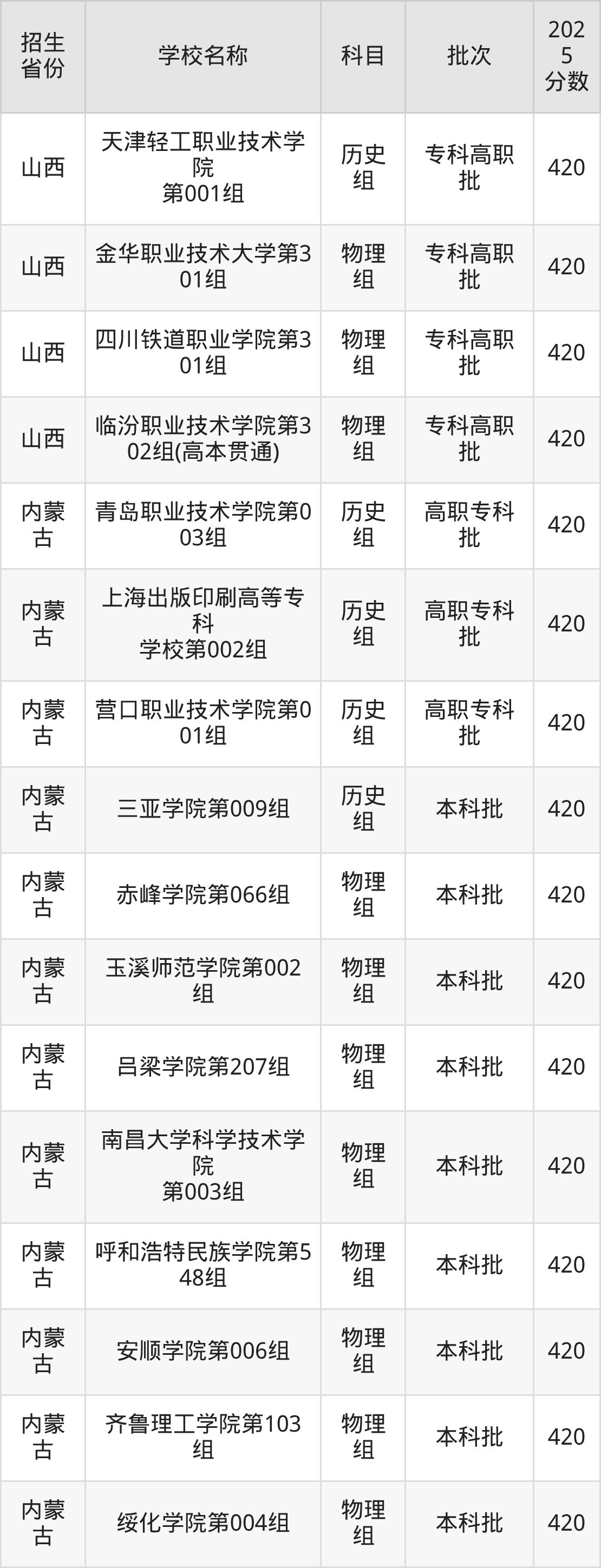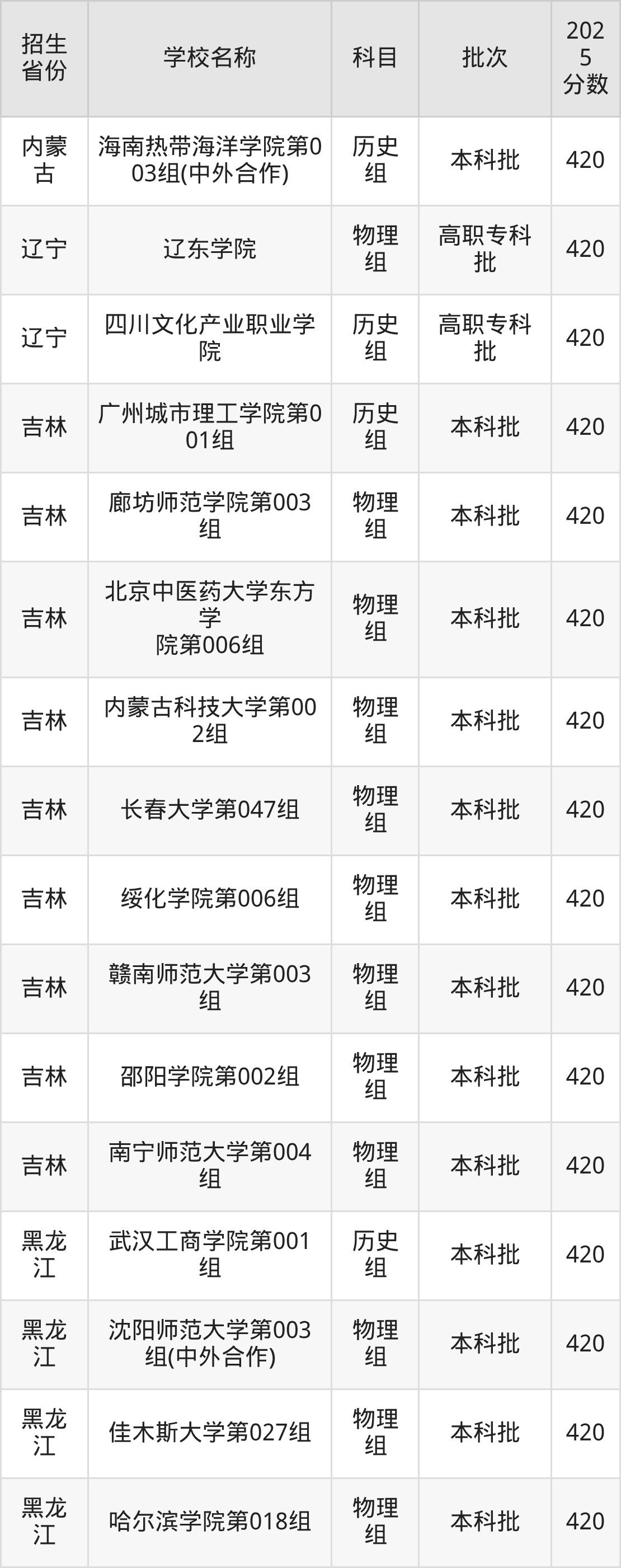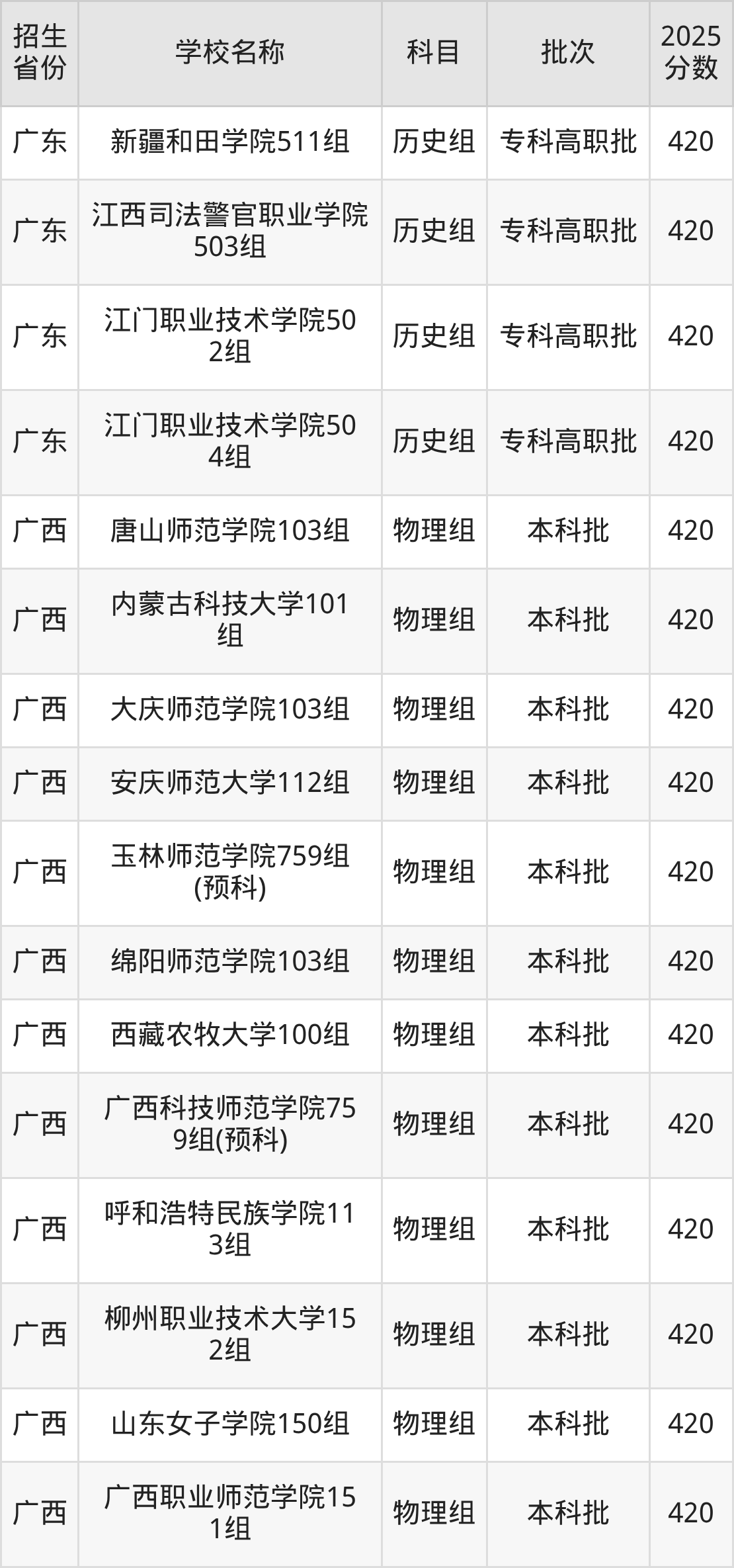 筛选全国各省2025年录取分数线为420分的文科大学如下: