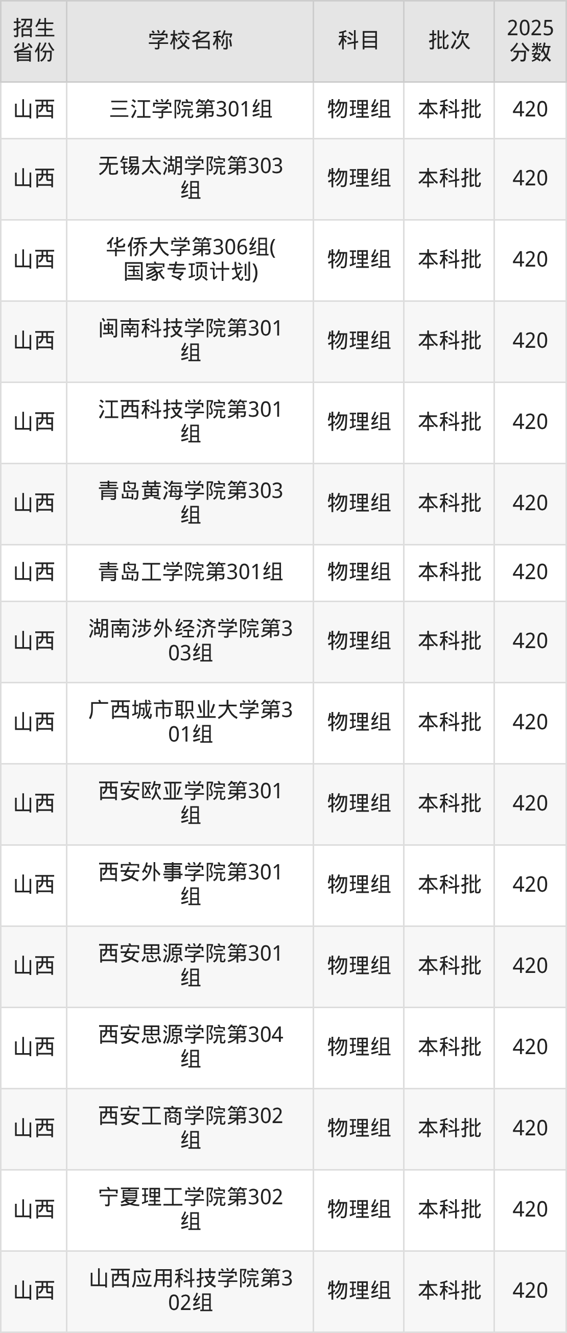 山西省物理组分数线是420分的文科大学有:天津天狮学院、天津仁爱学院、河北工程技术学院、河北东方学院、辽宁理工学院、长春光华学院、吉林师范大学博达学院、长春人文学院、哈尔滨剑桥学院、三江学院。