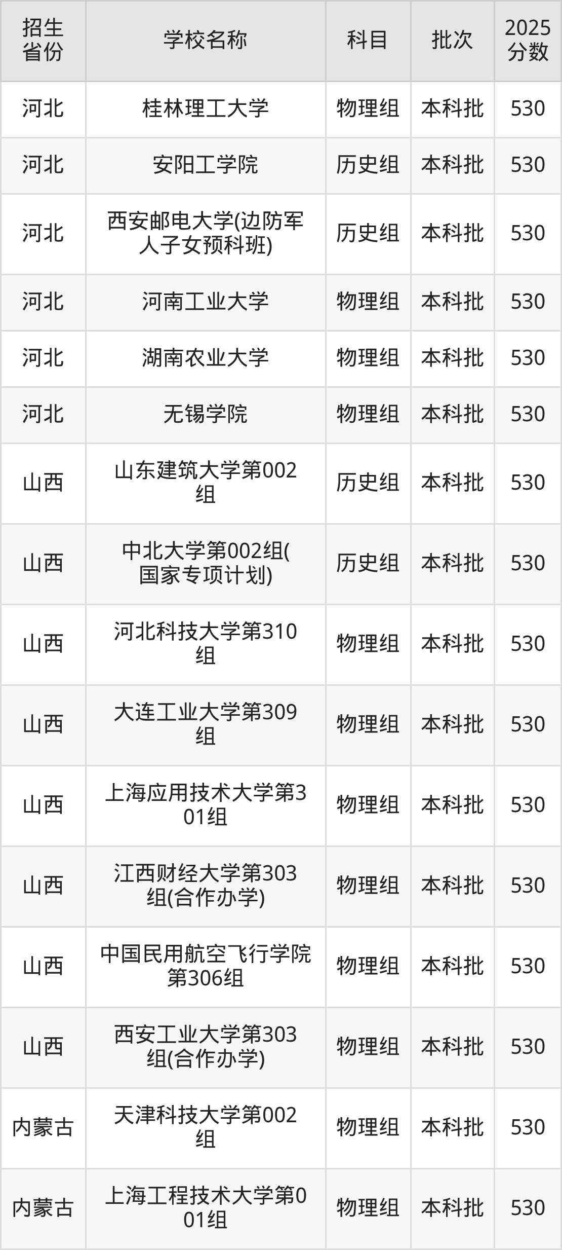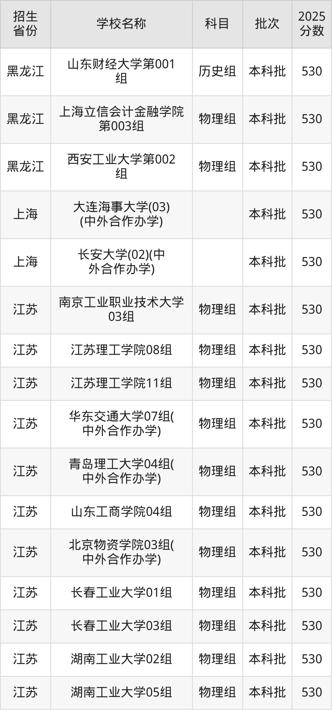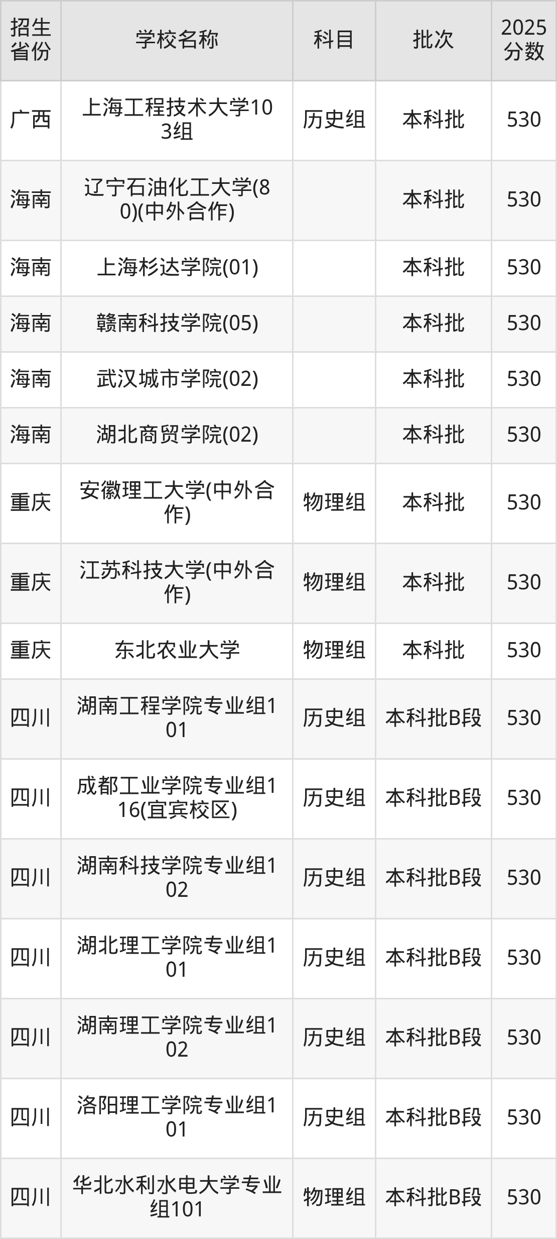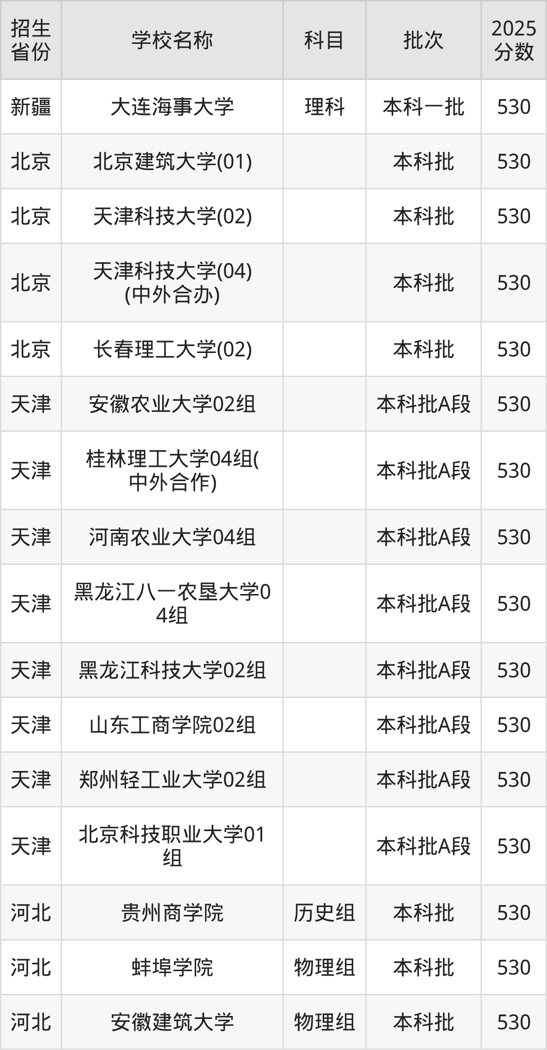 筛选全国各省2025年录取分数线为530分的理科大学如下:
